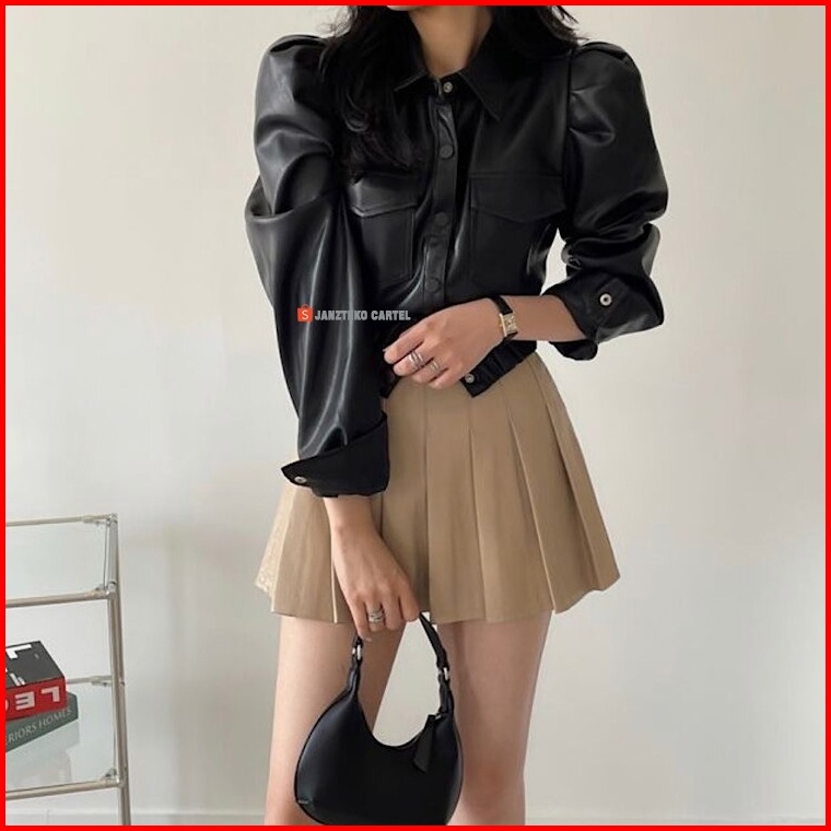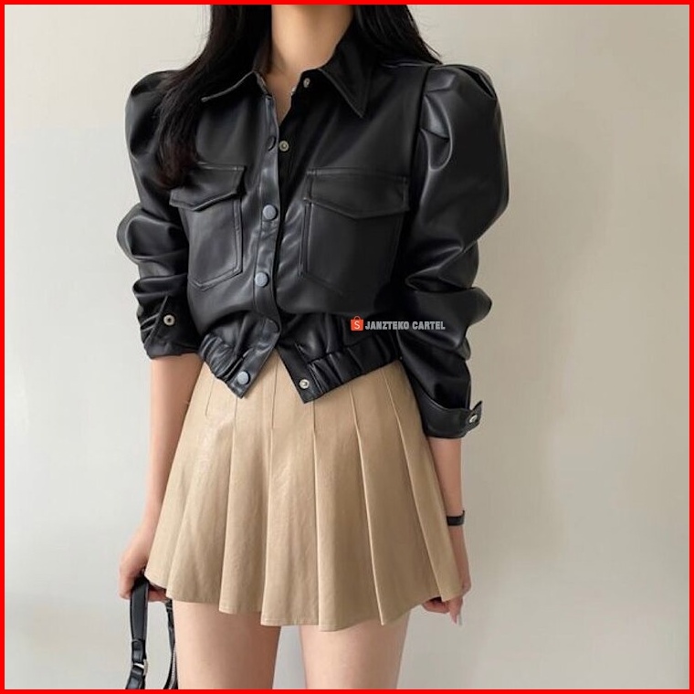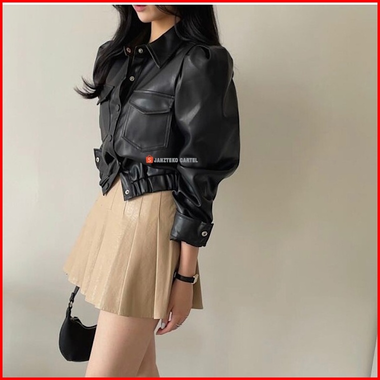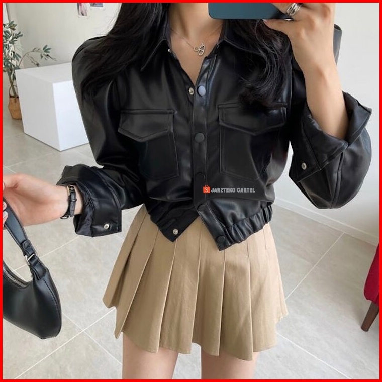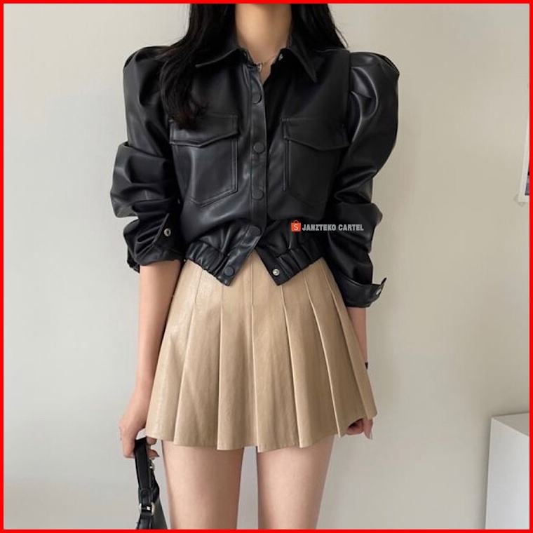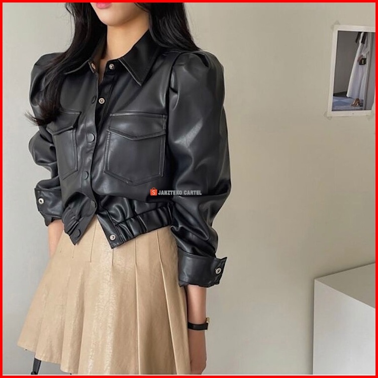 Jnk X Luvi - Jaket Mantel Wanita Kulit Imitasi Hitam Bahan Semi Kulit Sintetis Viena Faux Synthetic Leather Jacket Shirt