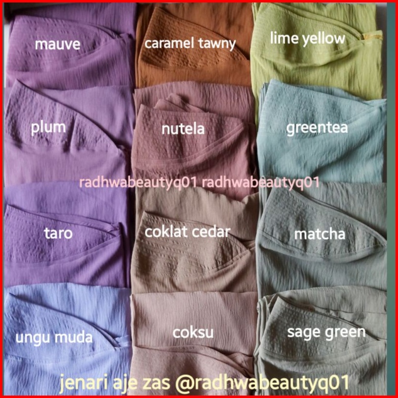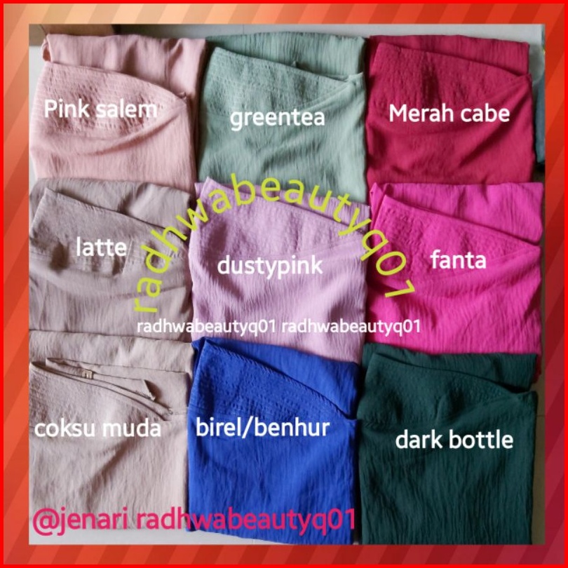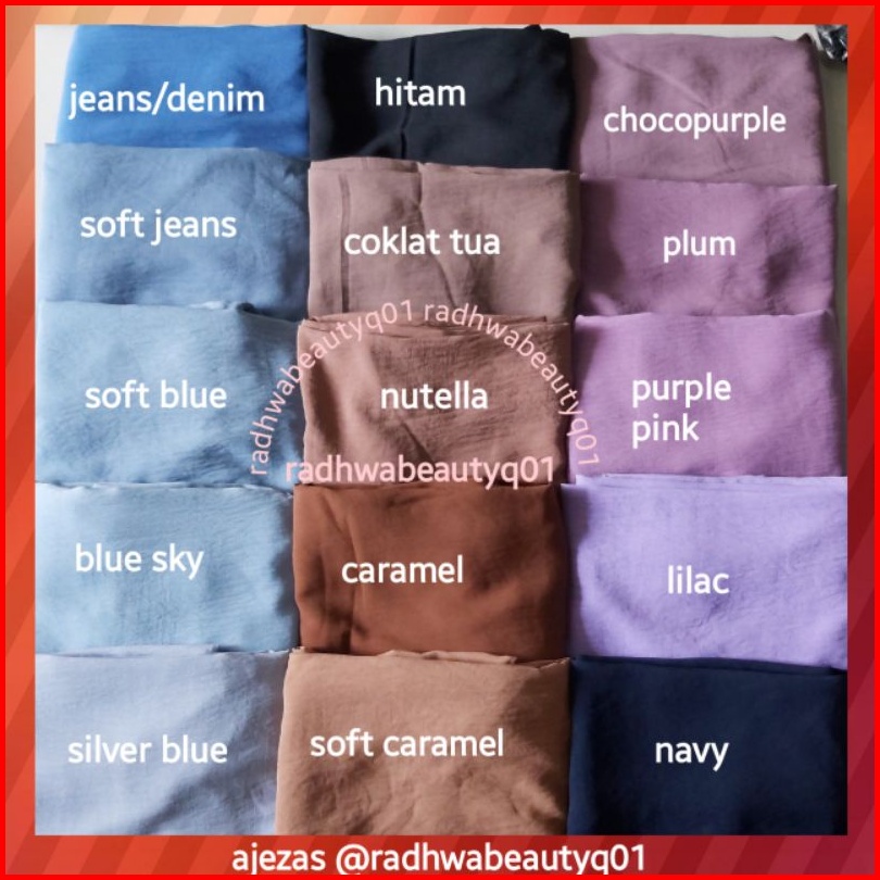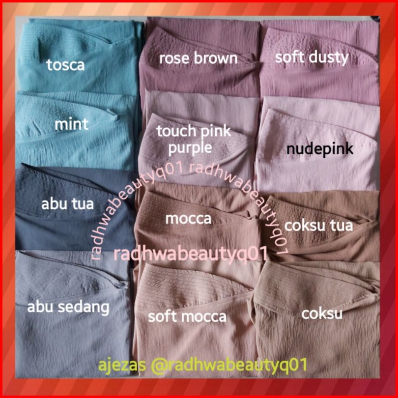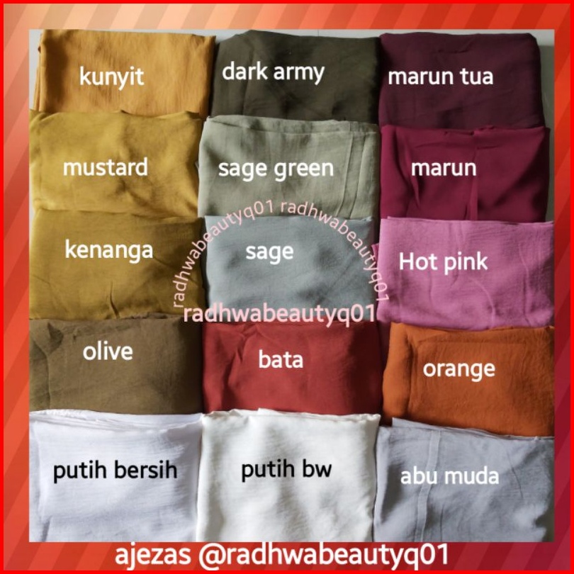 HITAM, NAVY, BOTOL TUA, SOFT MILO, NUDEPINK, CARAMEL, MILO, UNGU TUA, MARUN, GREENTEA, BABY PINK, PEACH, CHOCO PEACH, MERAH CABE/BENDERA, PURPLE, KUNYIT, JEANS, HIJAU TOSCA, OLIVE TUA, SOFT PINK, KENANGA, FANTA, NAVY GELAP, MARUN TUA /BURGUNDY, KHAKI, HIJAU BOTOL, DUSTYPINK, ABU, SOFT DUSTYPURPLE, PUTIH BW, PUTIH BERSIH, SILVER, COKLAT TUA, PINK SALEM, DARK ARMY, CHOCOPURPLE ON FOTO, BABY BLUE, GUAVA, ABU GELAP, CHOCOPURPLE VIDIO, ARMY, CREAM, ORANGE, DUSTY GREEN, COKLAT KOPI, TOSCA TUA, HIJAU PUPUS, MERAH HATI, SAGE GREEN, BIREL/BENHUR