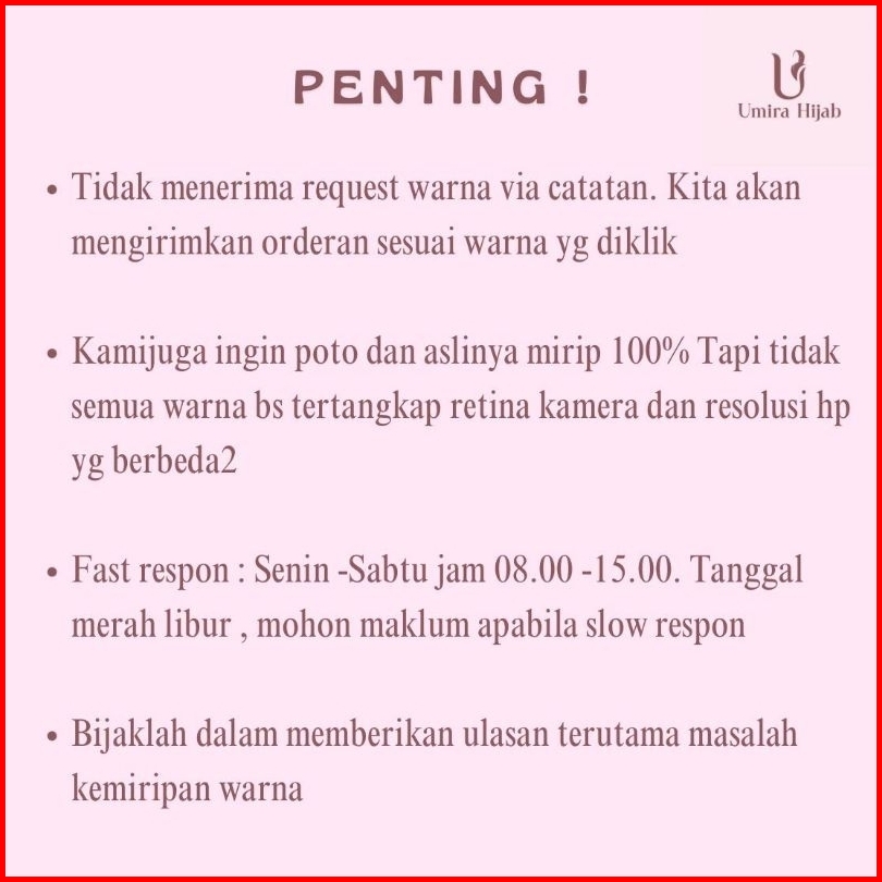 Black, Navy, Maroon, Abu, Dusty Pink, Tan, Matcha, Brown, Army, White, Silver, Rose Brown, Cappucino, Taupe, Dusty Purple, Broken White, Milo, Cream, Khaky, Mocca, Latte, Baby Blue, Dove, Beige, Dark Grey, Denim Tua, Beige Tua, Burgandy, Mauve, Stone, Soft denim, Purple, Wardah, Hazelnut, Matte Green, Soft Matcha, Soft Cream, Charcol, Ash, Dusty Blue, Macaron, Maroon Muda, Grey Denim, Bata, Light Cream, Smoke Grey, Frappuccino, Ovaltine, Grey, Ivory, Forest, Mustard, Denim, Sea blue, Peach pearl, Steel blue, Sea Green, Charcoal, Blue Grey, Anchor, Silver Grey, Sepia, Cammile Pink, Camel, Creamy, Walnut, Merah Cabe, Khaky muda, Cinamon
