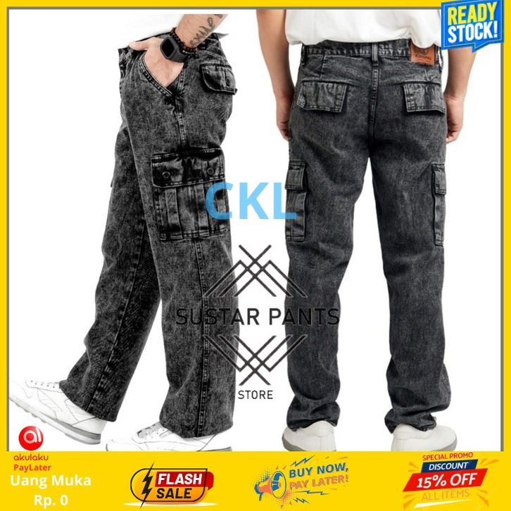 Promo Long Cargo pants jeans Celana cargo jeans loose fit Reguler Standard Black Sandwash
