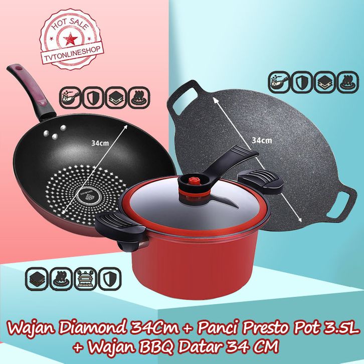 Paket Komplit Triple Ekonomis Panci Panggangan 34cm Panci Presto Pot 3.5L Wajan Diameter 32cm Anti Karat Tahan Lama