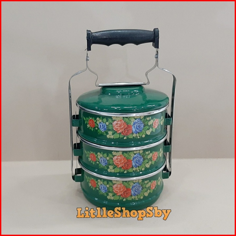 Rantang Enamel Susun 3 Ukuran 14cm Motif Mawar Hijau