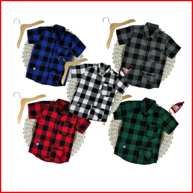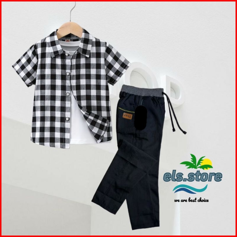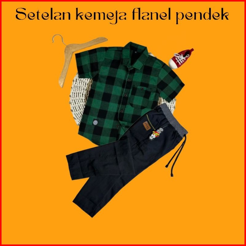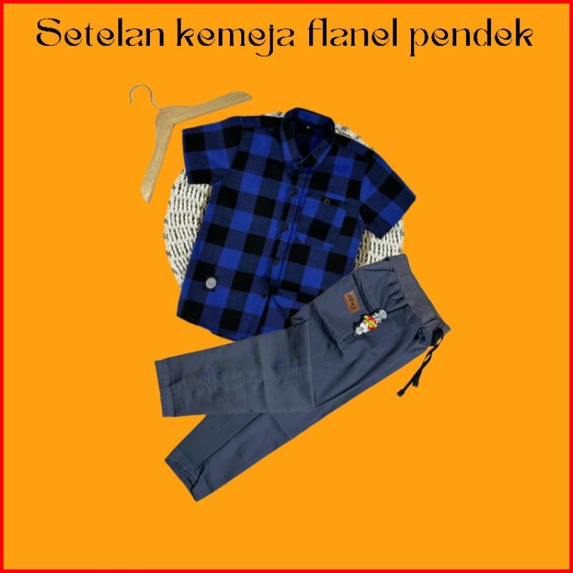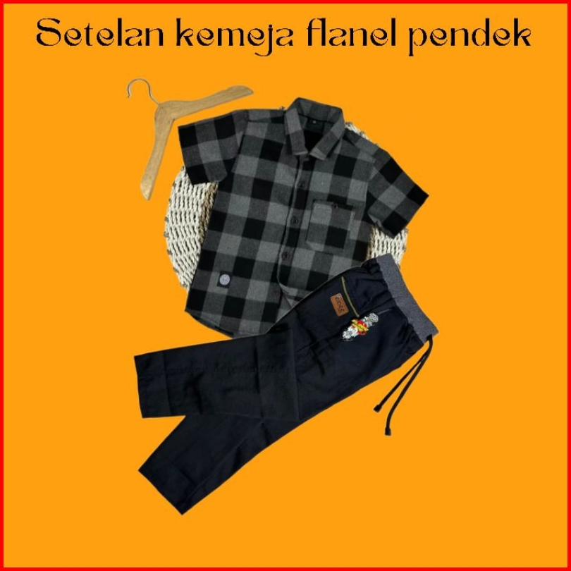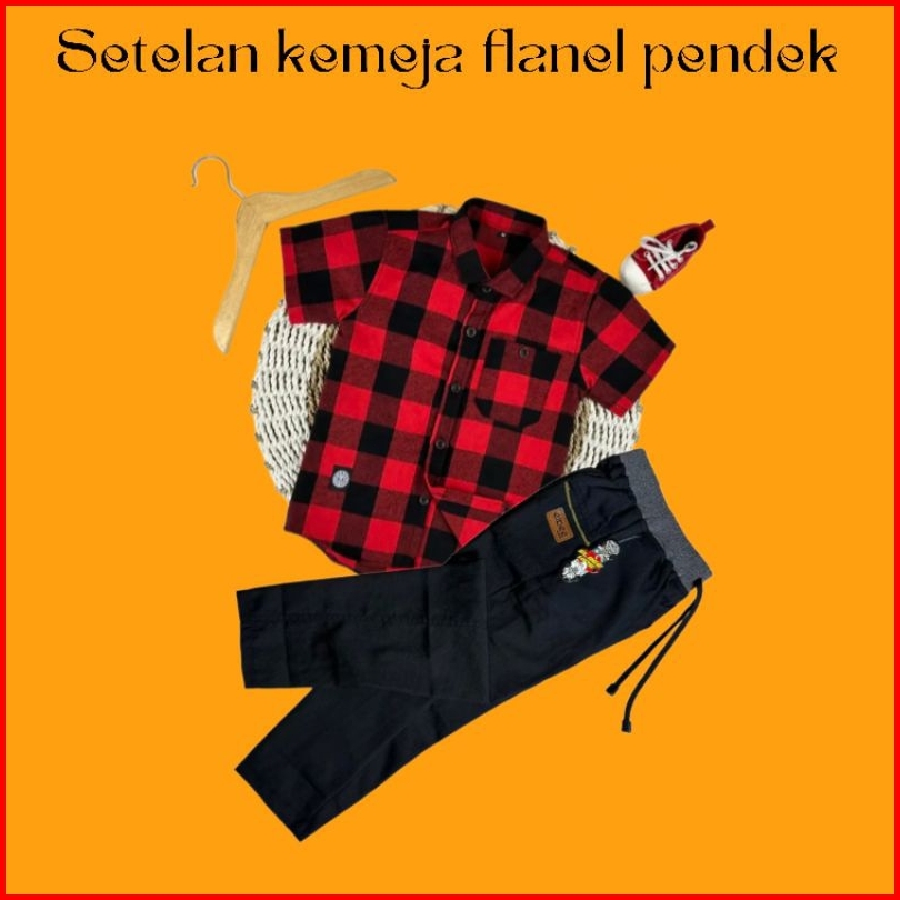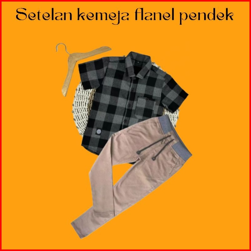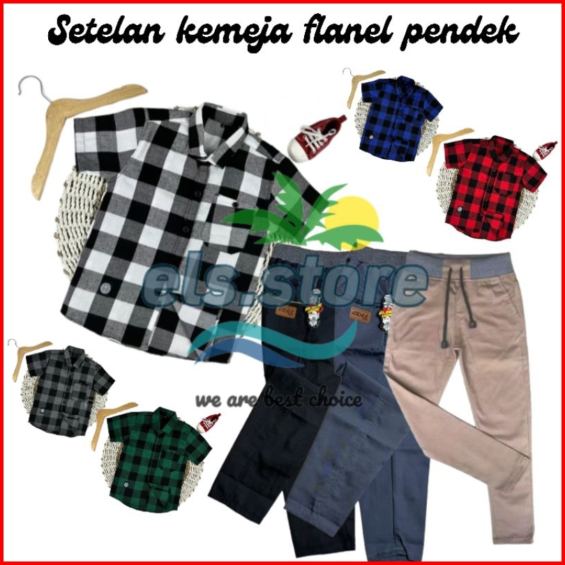 Setelan Kemeja Flanel Anak 3-14 Tahun Kemeja Flanel Lengan Pendek Anak Premium Celana Chino Set Atasan Baju Anak Kemeja