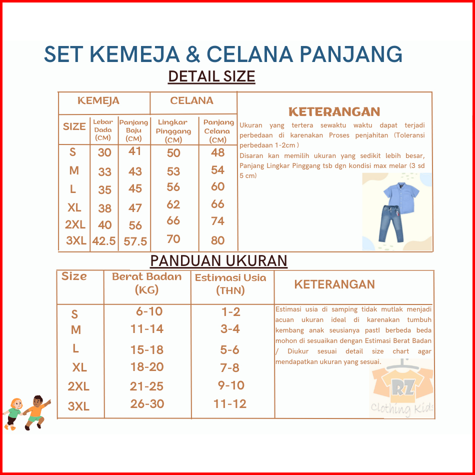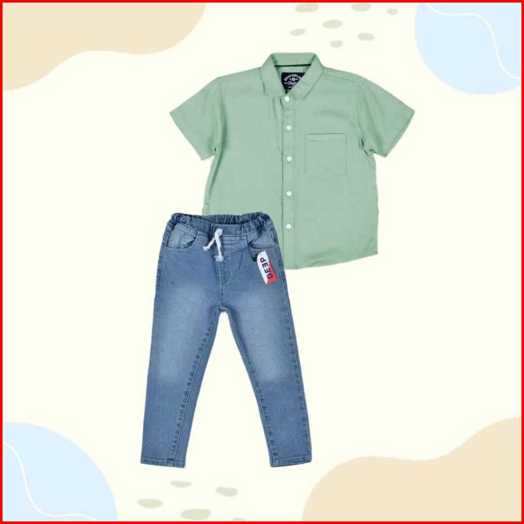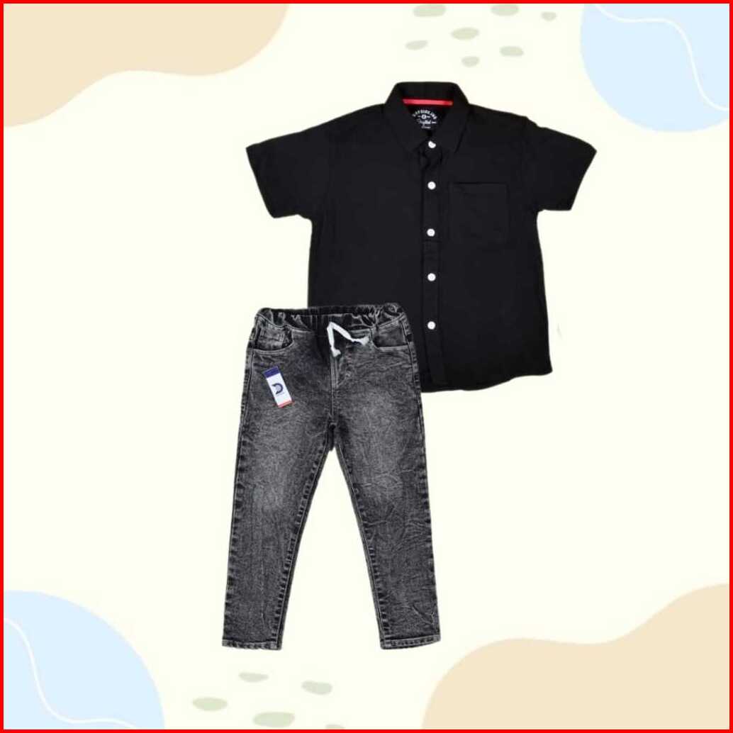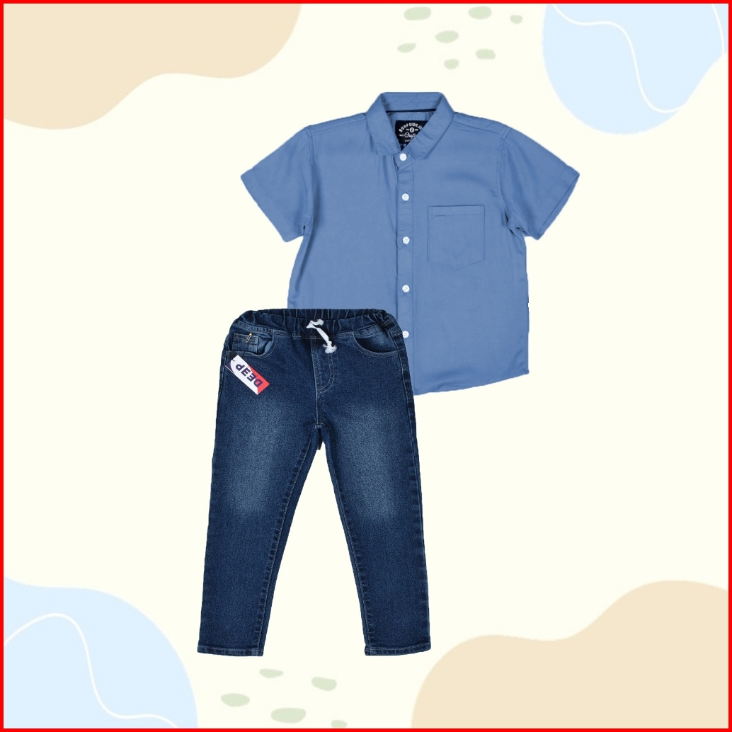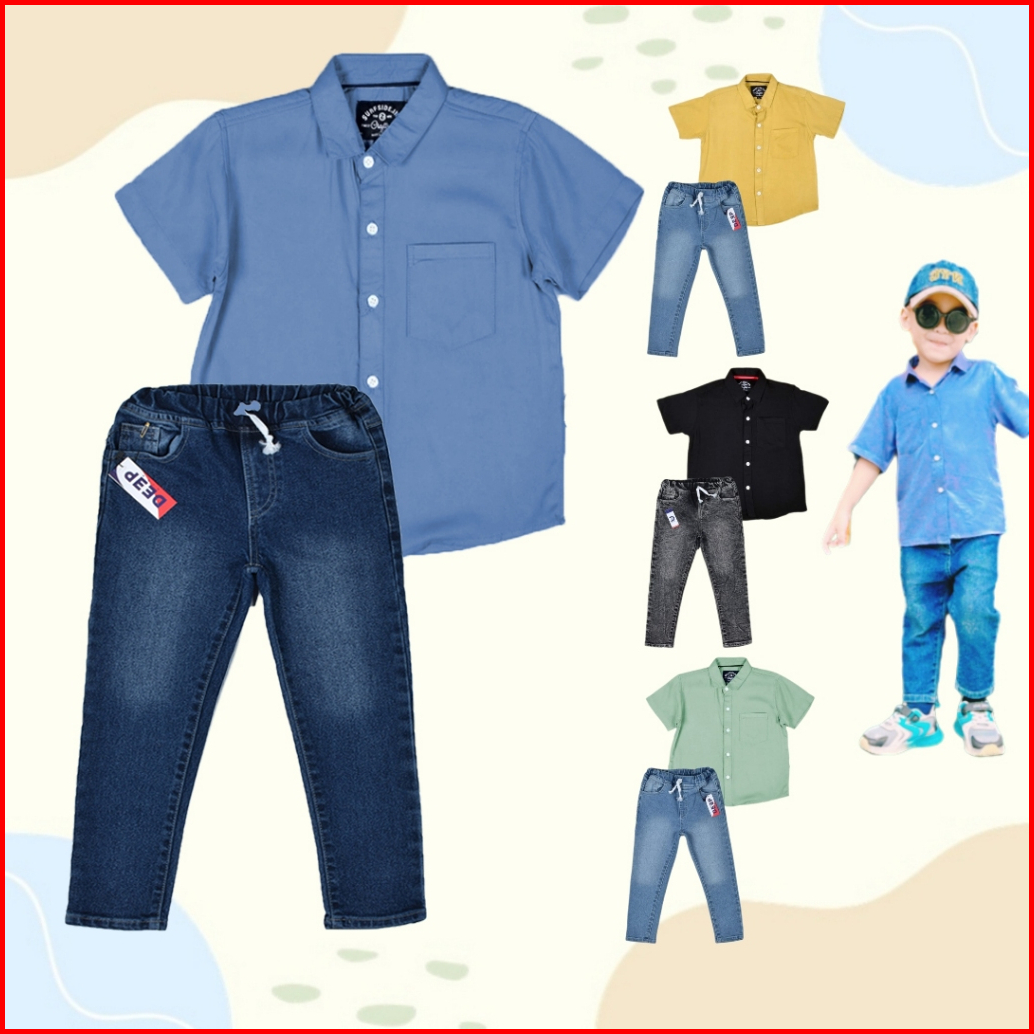 Setelan Anak Laki Laki Kemeja Pendek Celana Jeans Panjang Premium Usia 1-12 Tahun Set Kemeja Jeans Panjang Bahan Cotton