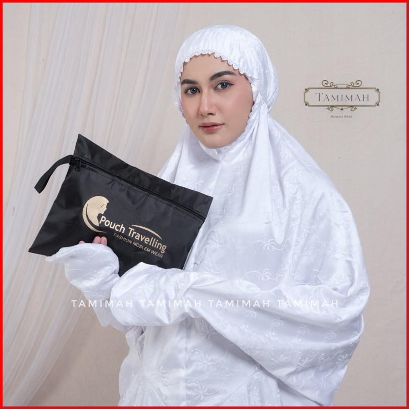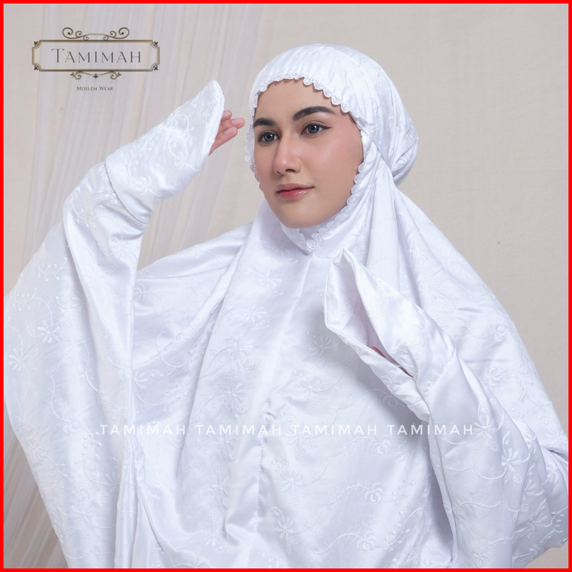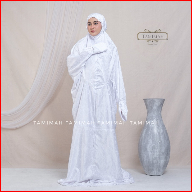 Tamimah - Mukena Terusan Dewasa Sutra Paris Putih Catalina Mukena Lajuran