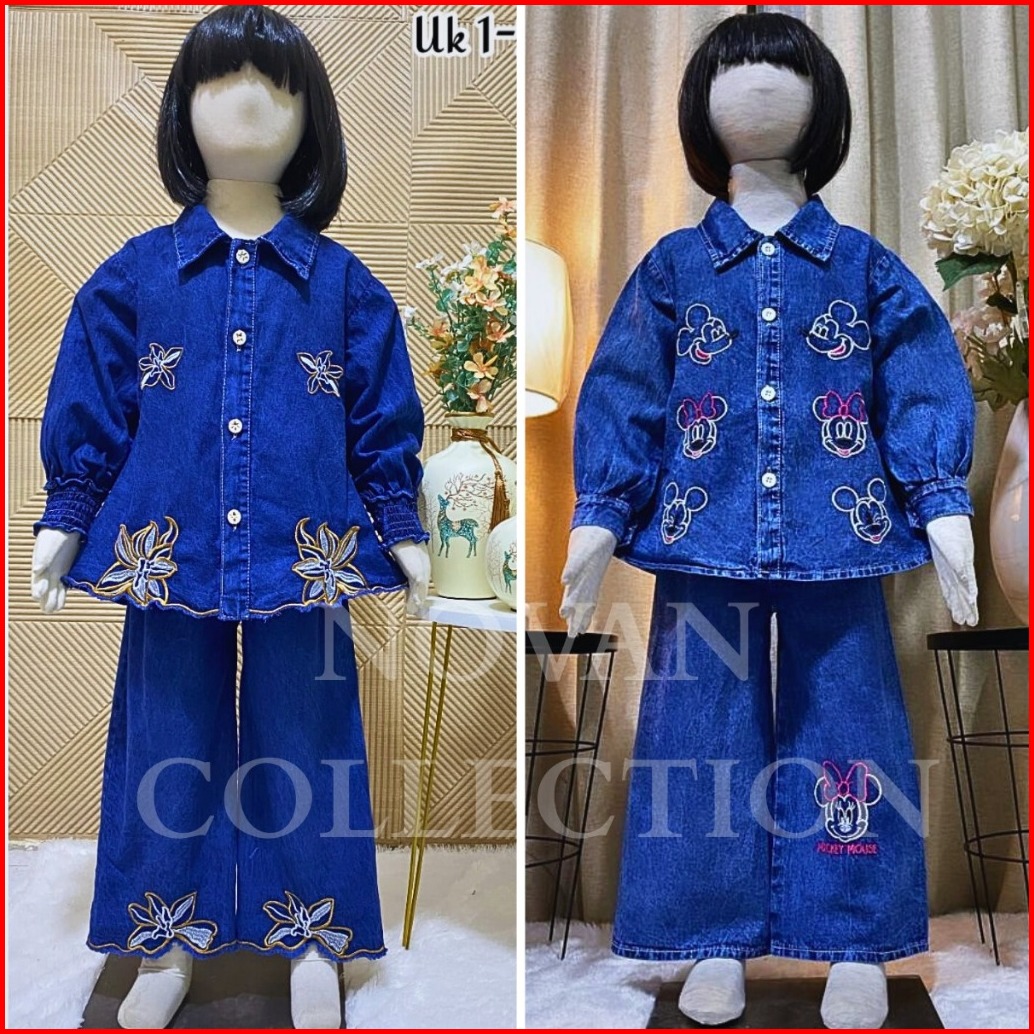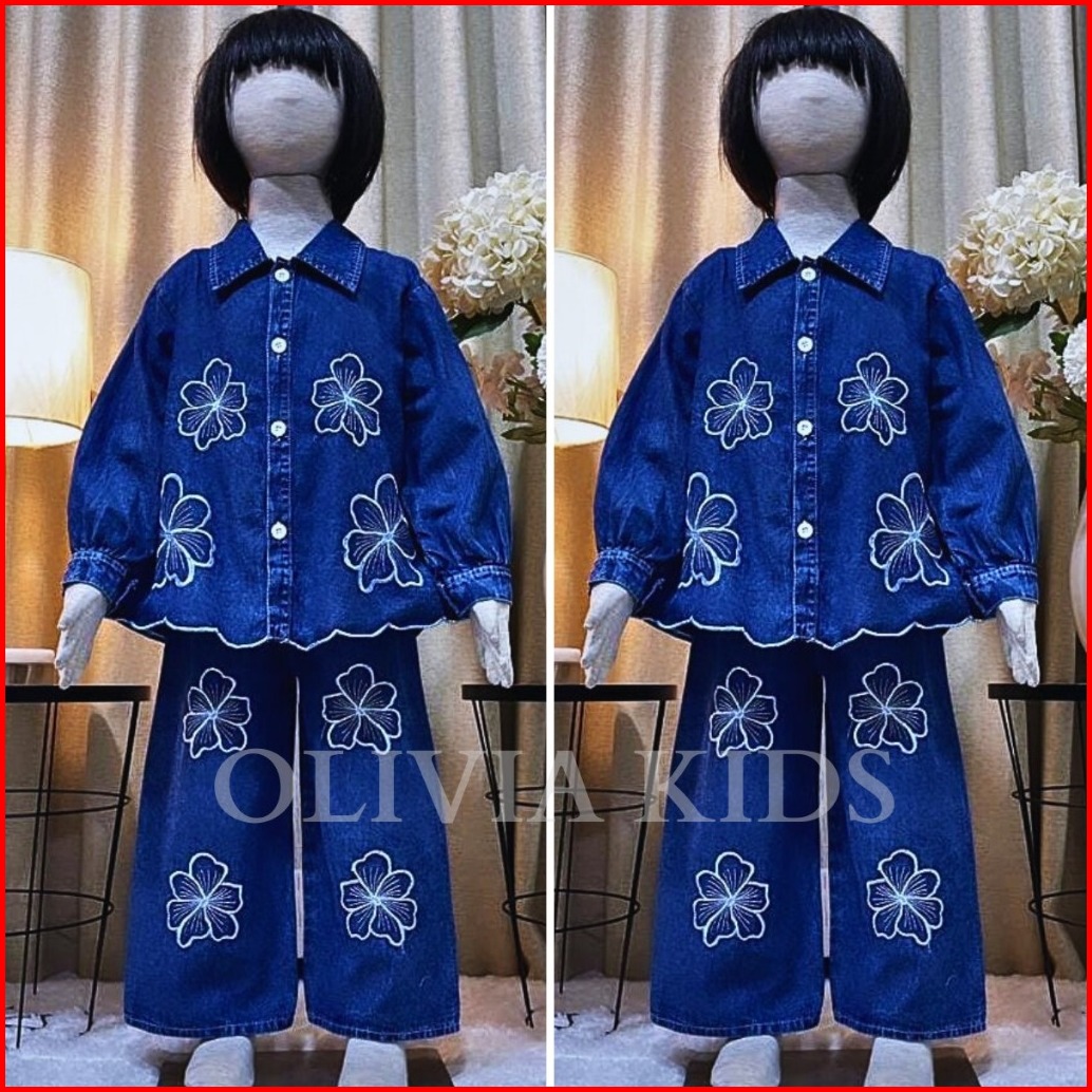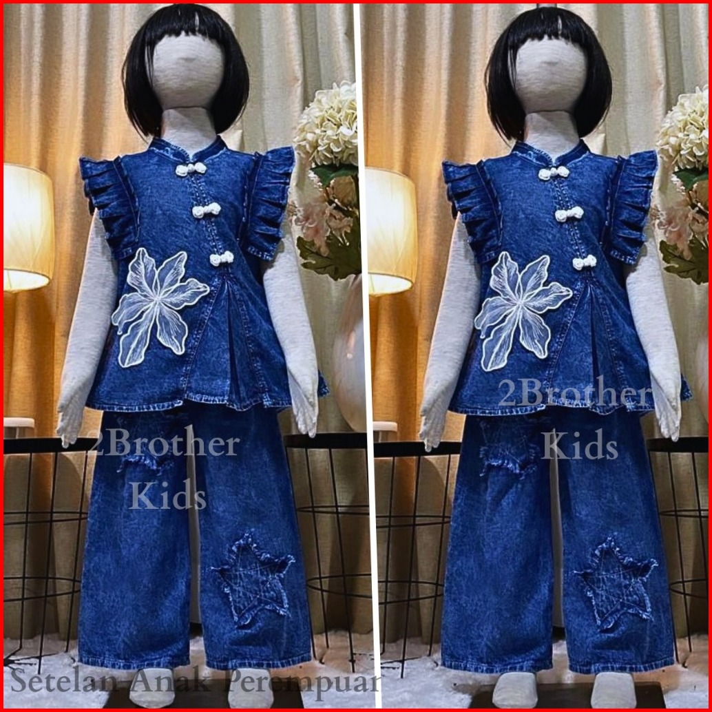 Stelan Skena Anak Perempuan Korean Style Kombinasi Bunga Bordir Usia 3 - 10 Tahun Celana Kulot Skena Jeans Terbaru 2025