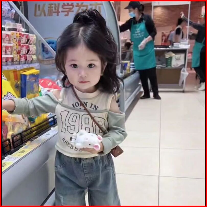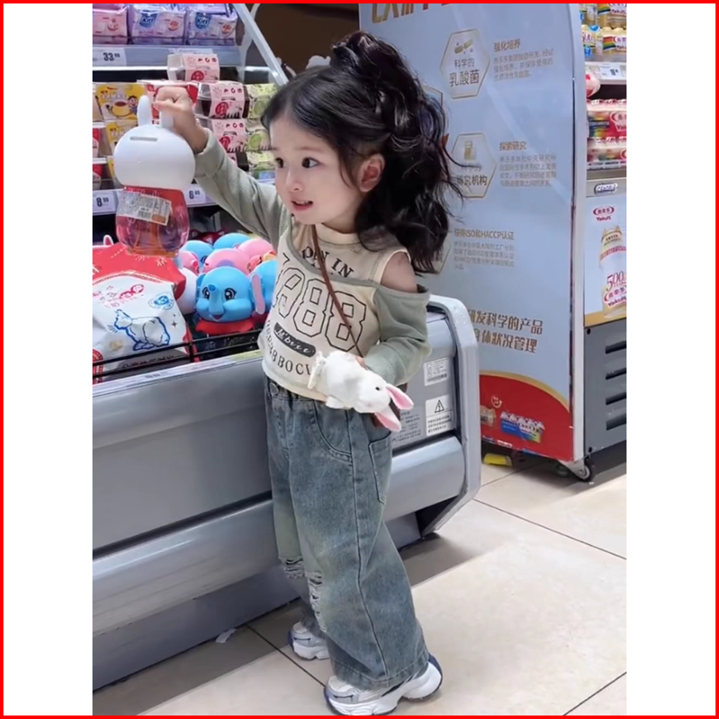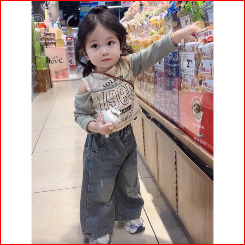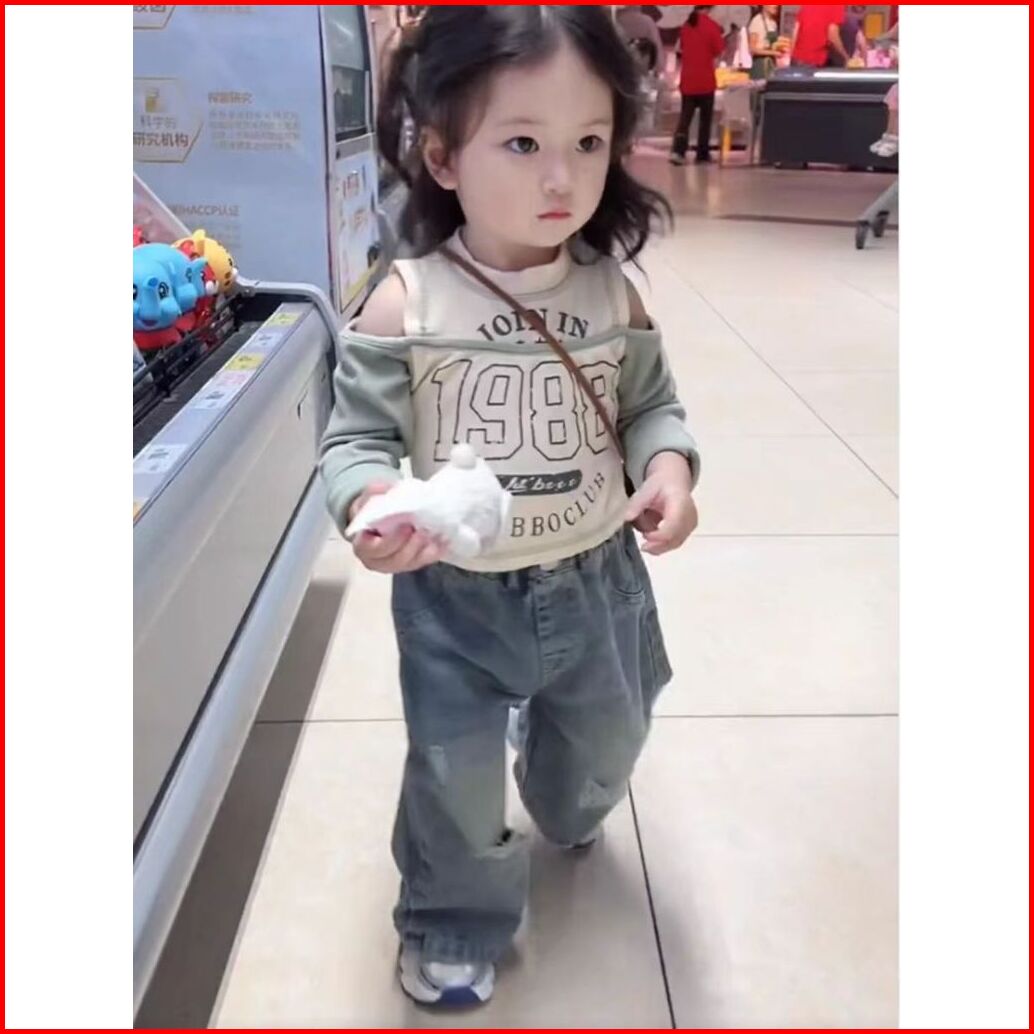 Style Terbaru One Set Jeans Anak Perempuan Atasan Shoulder Off Motif Huruf Celana Jeans Panjang Sobek Kulot Baju Impor A