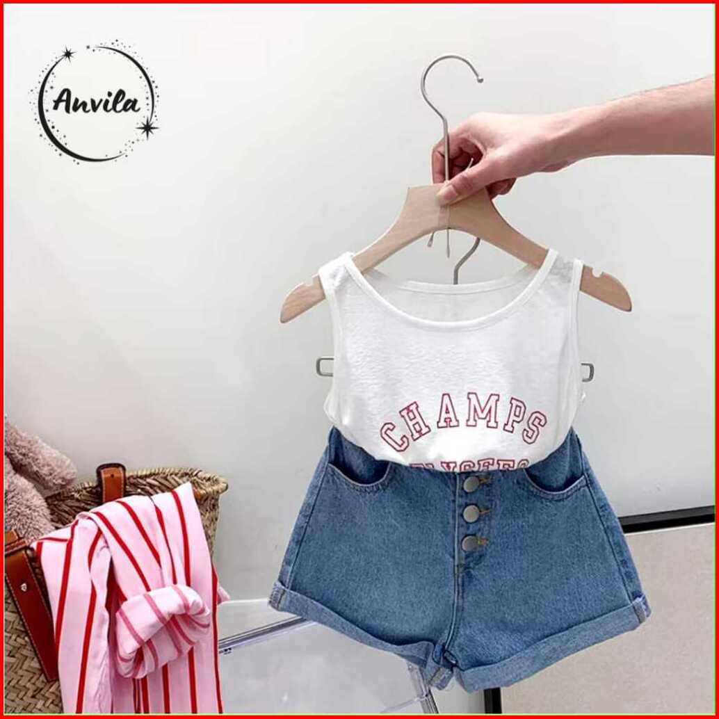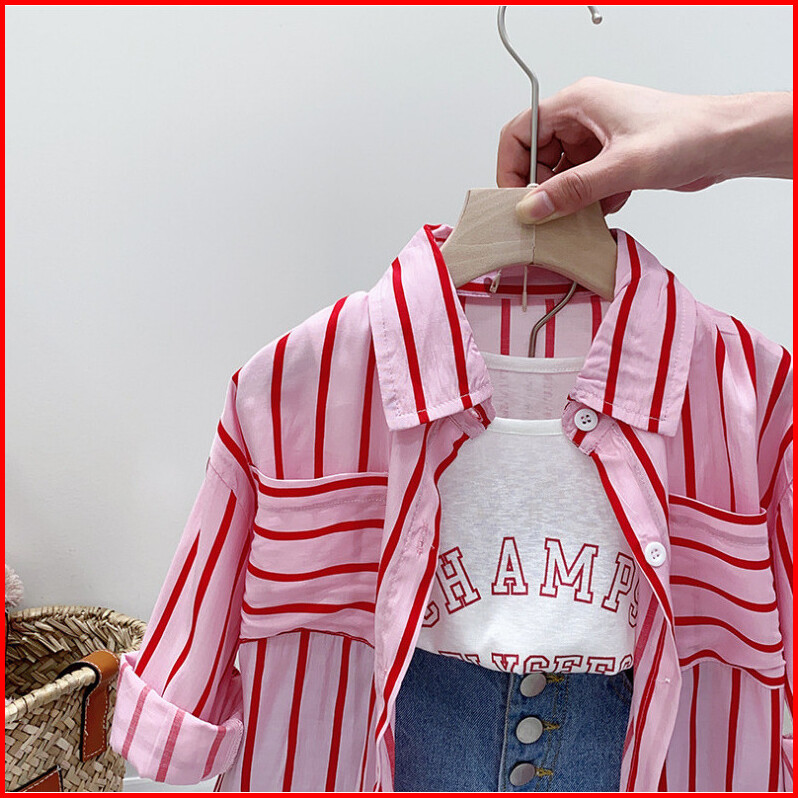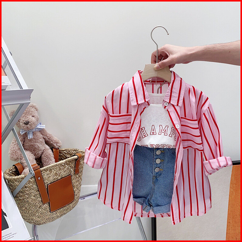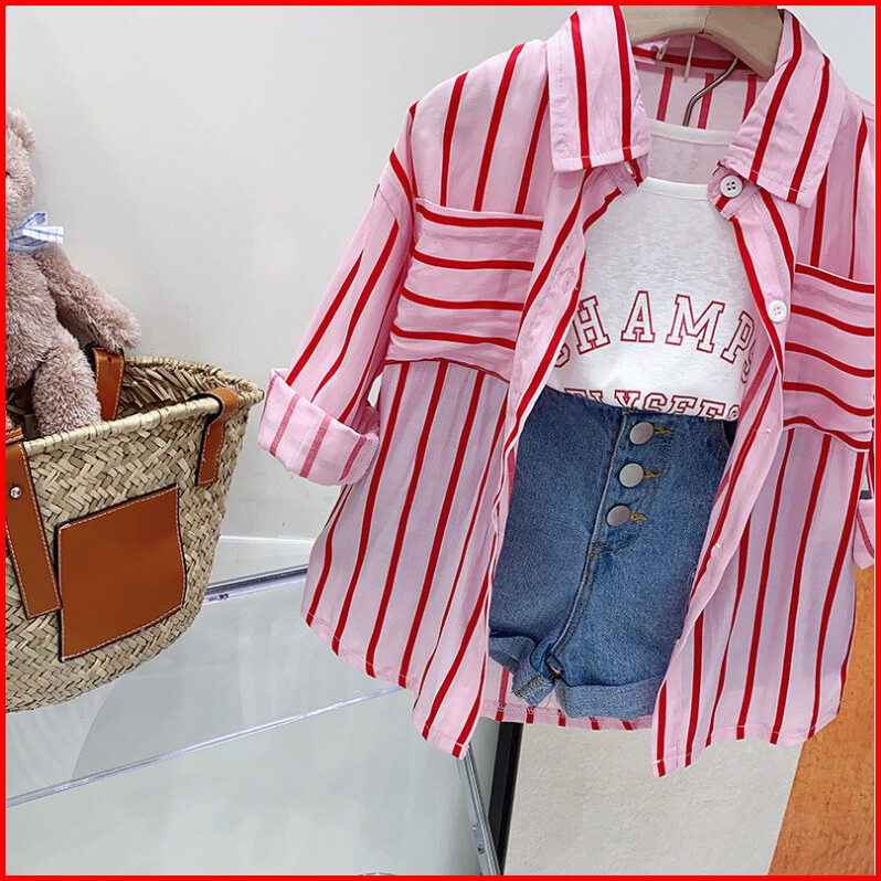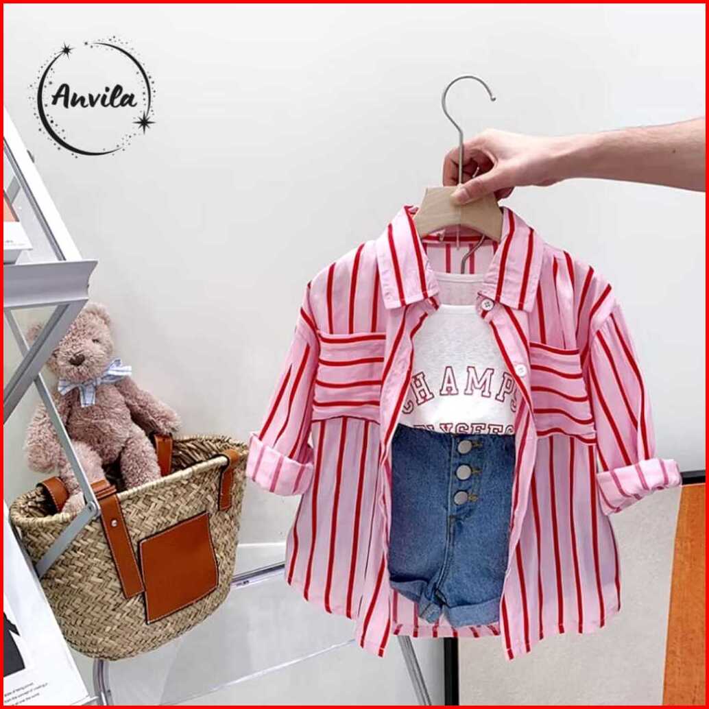 Setelan Anak Perempuan Import Model Kemeja Garis 3in1 Short Pants Variasi Champs Terbaru