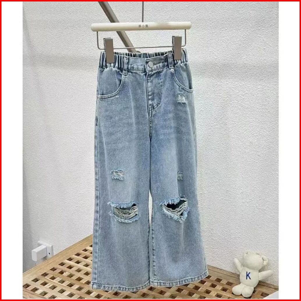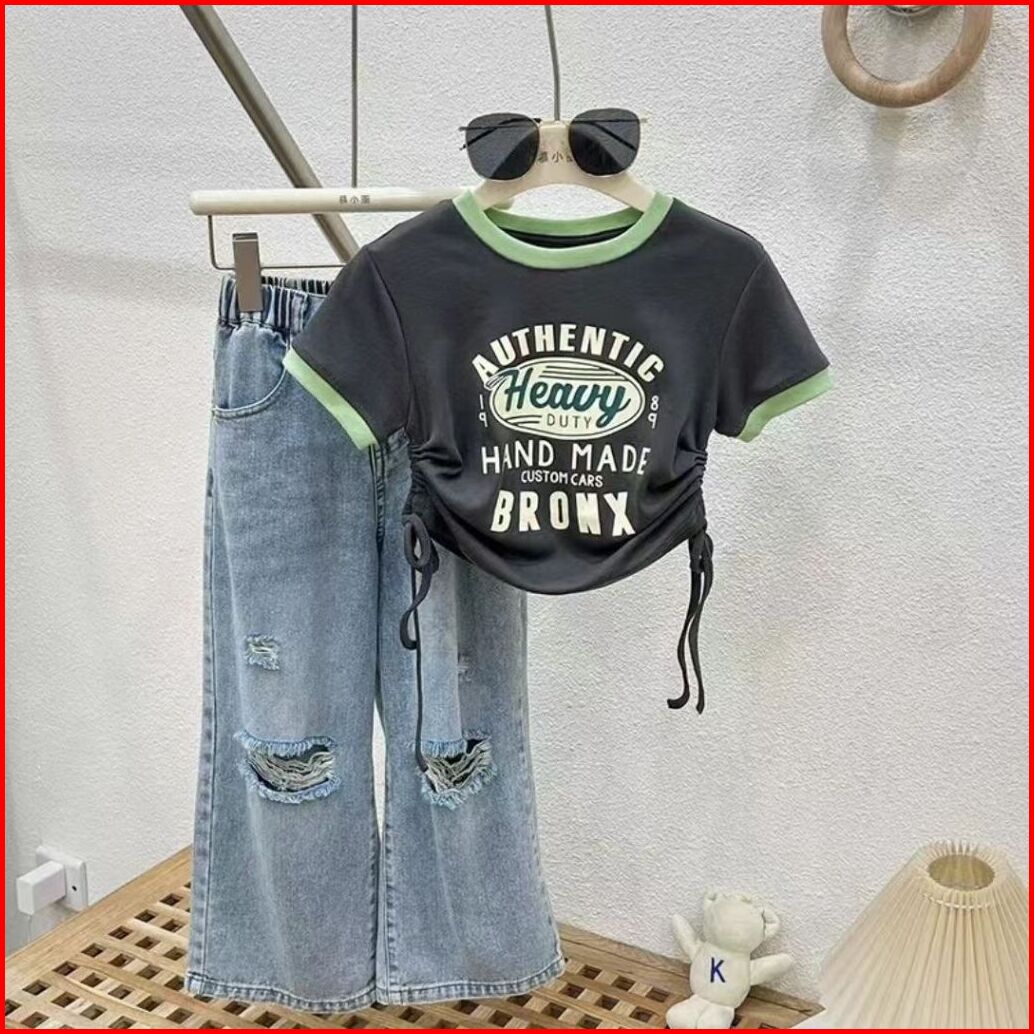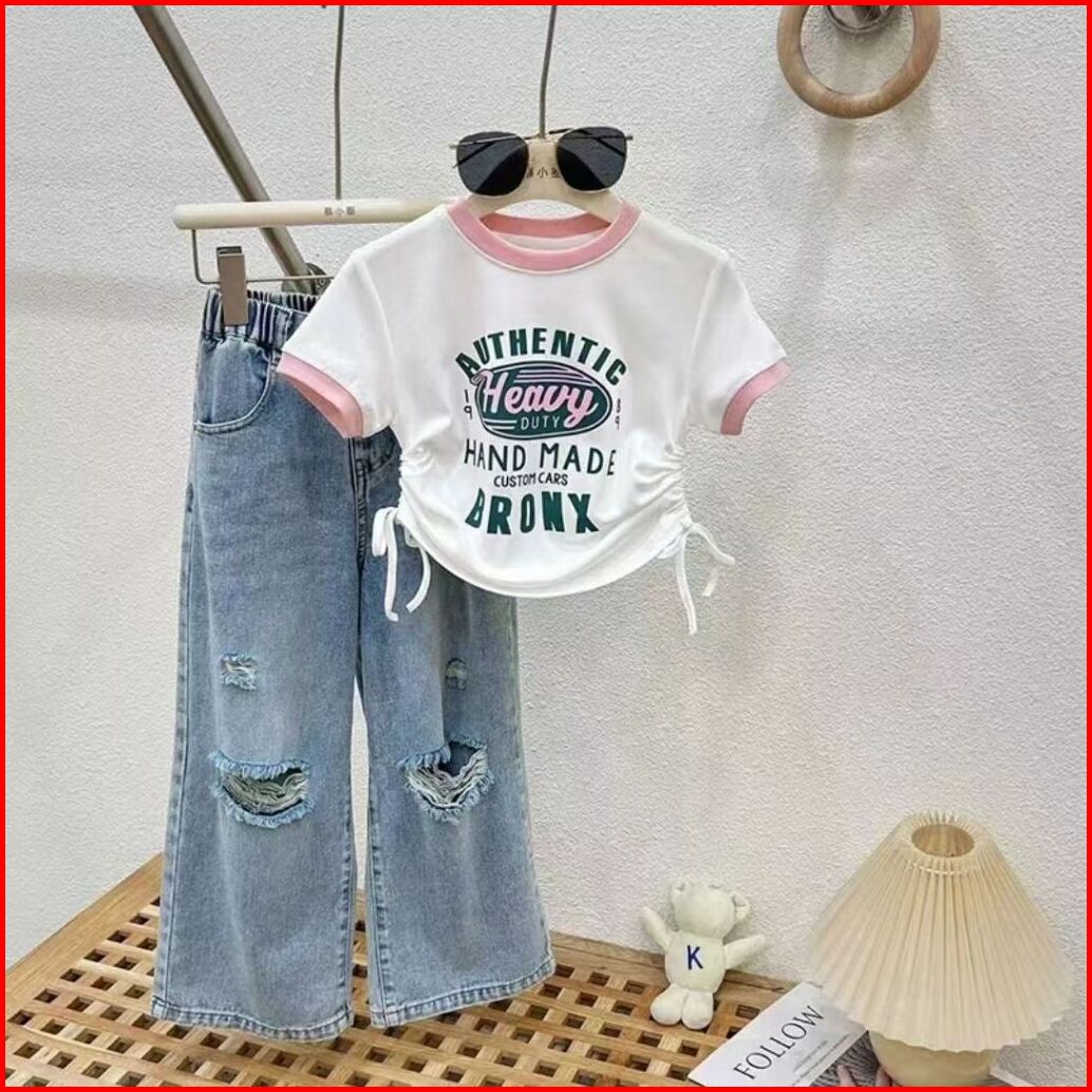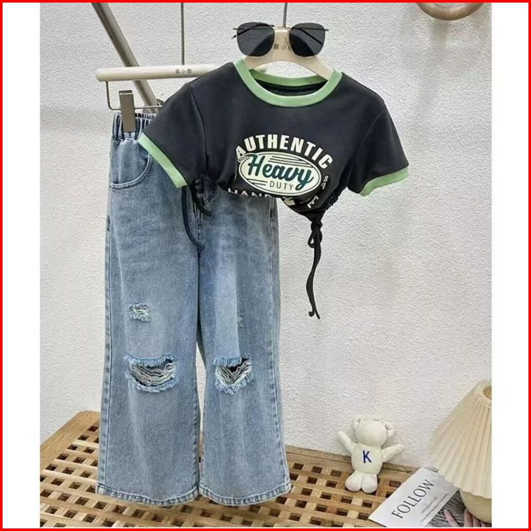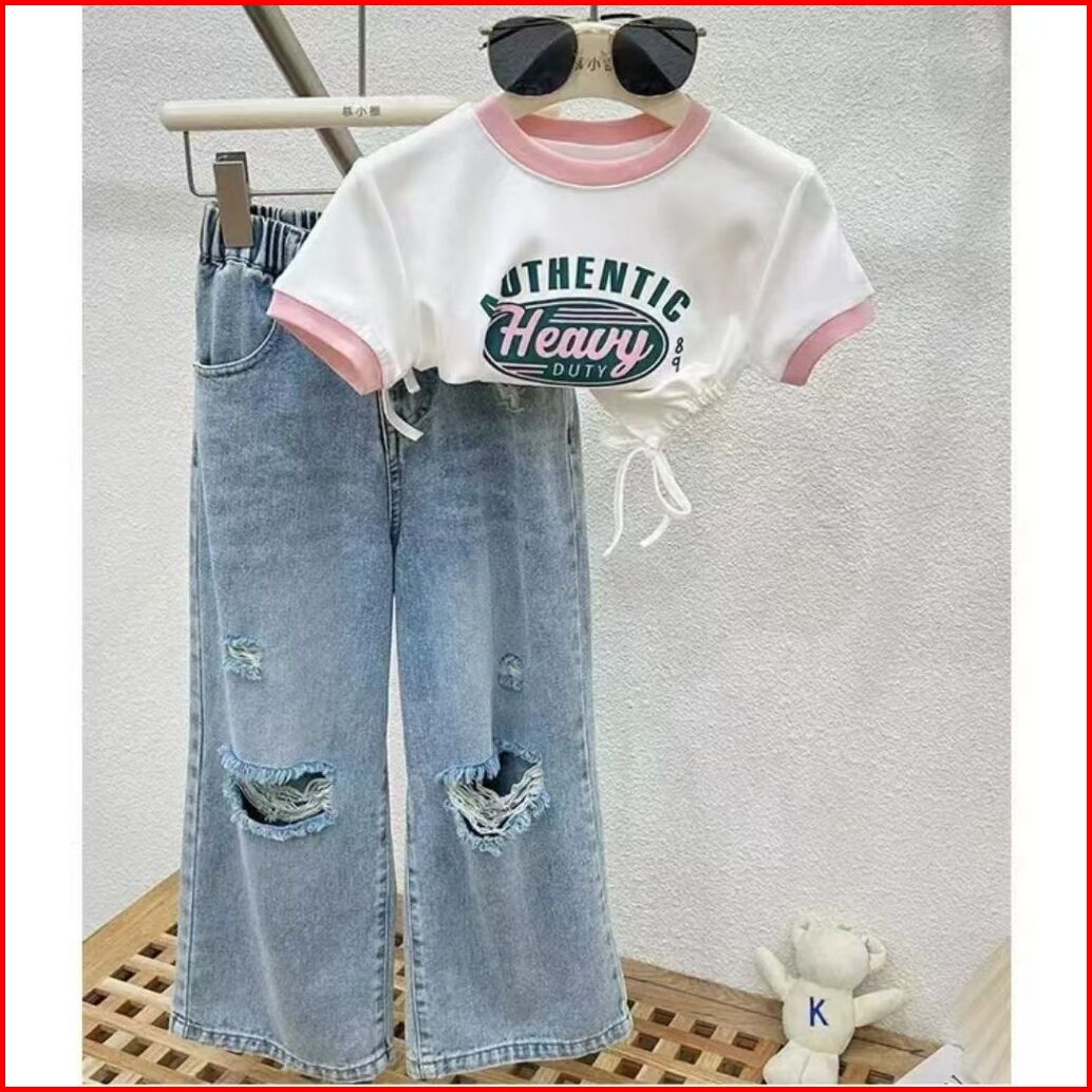 Korea Style Setelan Jeans Anak Perempuan Atasan Croptop Motif Lucu Celana Jeans Panjang Sobek Kulot Baju Impor Anak Pere