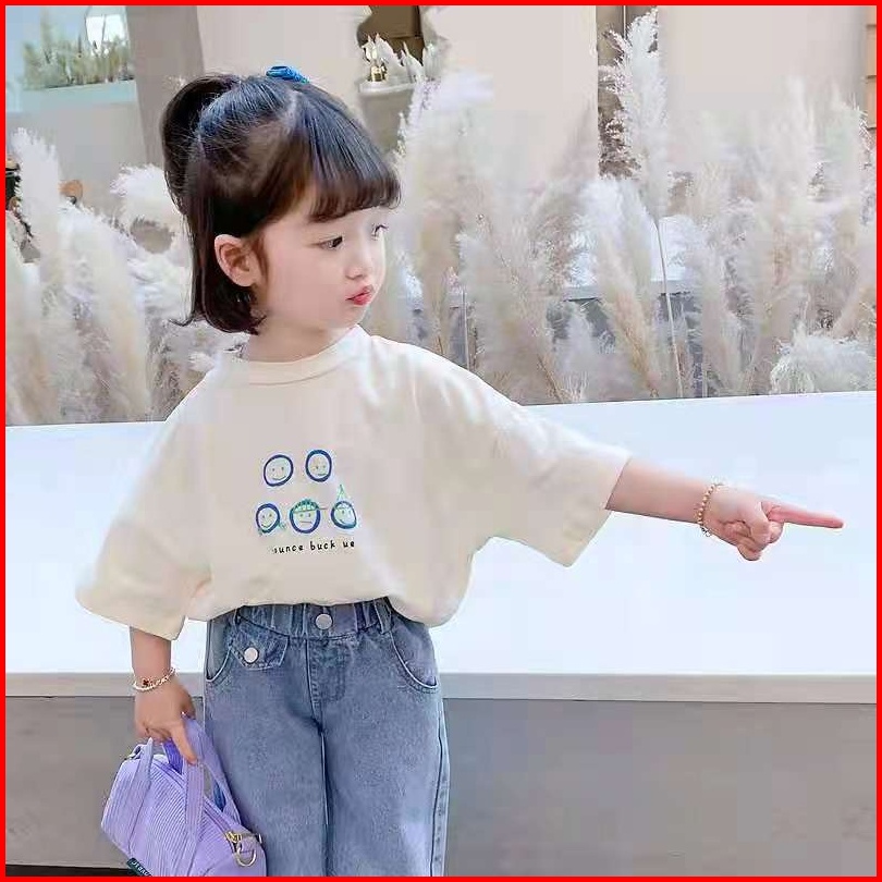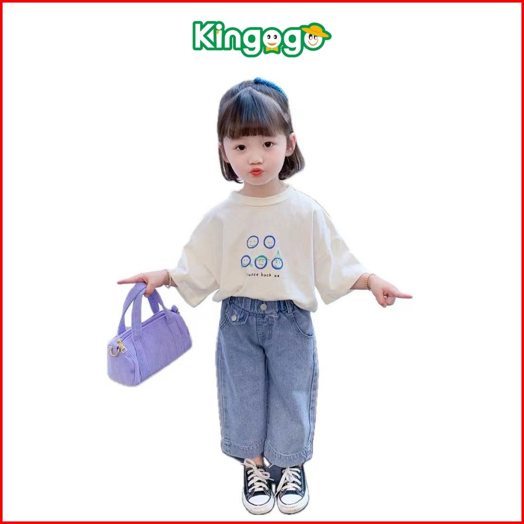 Kingogo Setelan Anak Perempuan Set Anak Perempuan Baju Anak Motif Lucu T-shirt Bahan Soft Celana Jeans Kaki Lebar Panjan