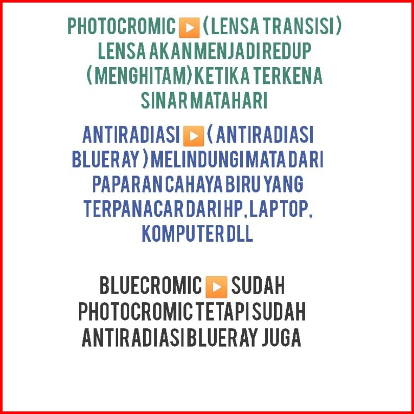 Photocromic normal, Photocromic minus, Antiradiasi normal, Antiradiasi minus, BLUEcromic normal, BLUEcromic MINUS, PHOTOCROMIC 425/600, Antiradiasi 600/800, PhotoCromic 625/800, Photocromic Plus, Progresif