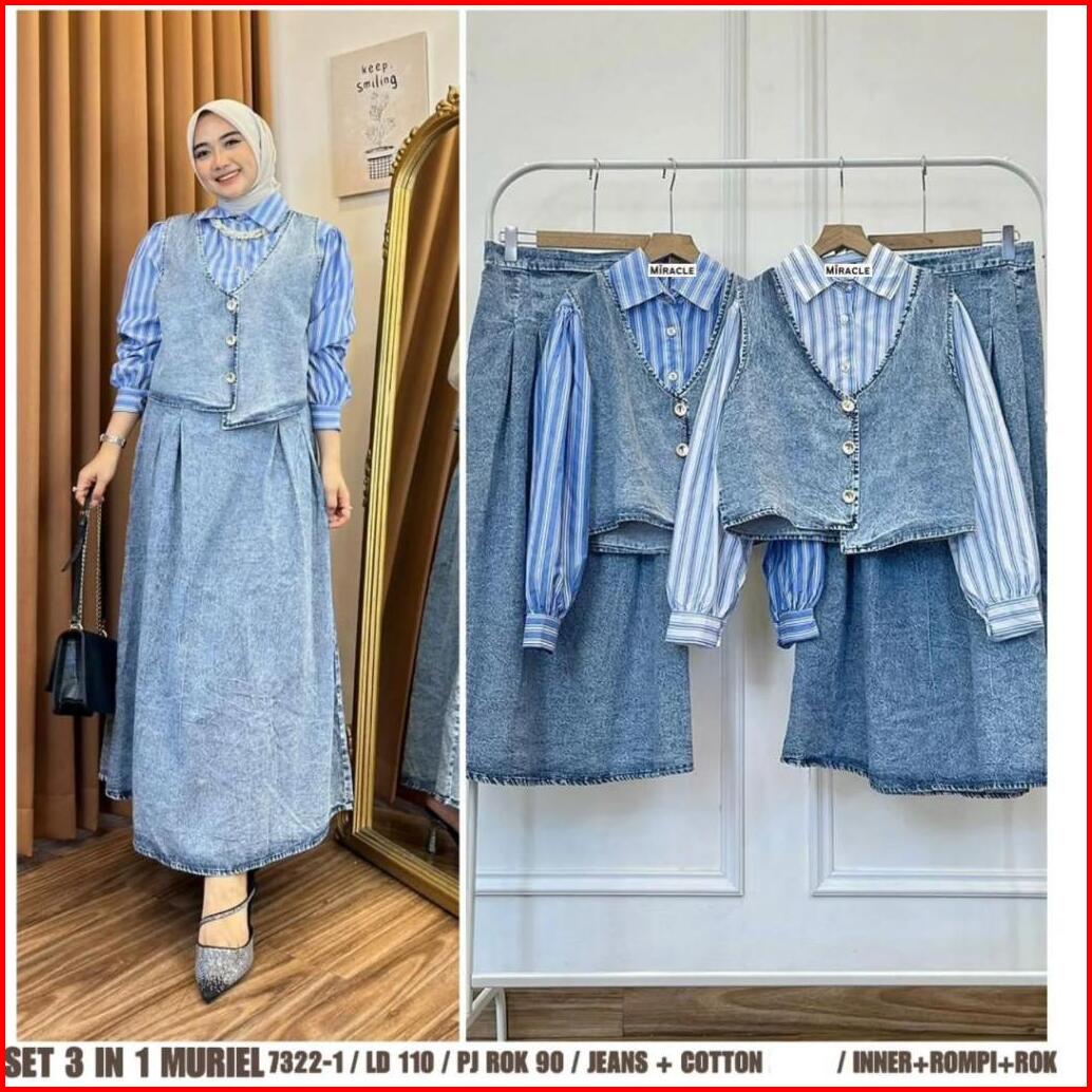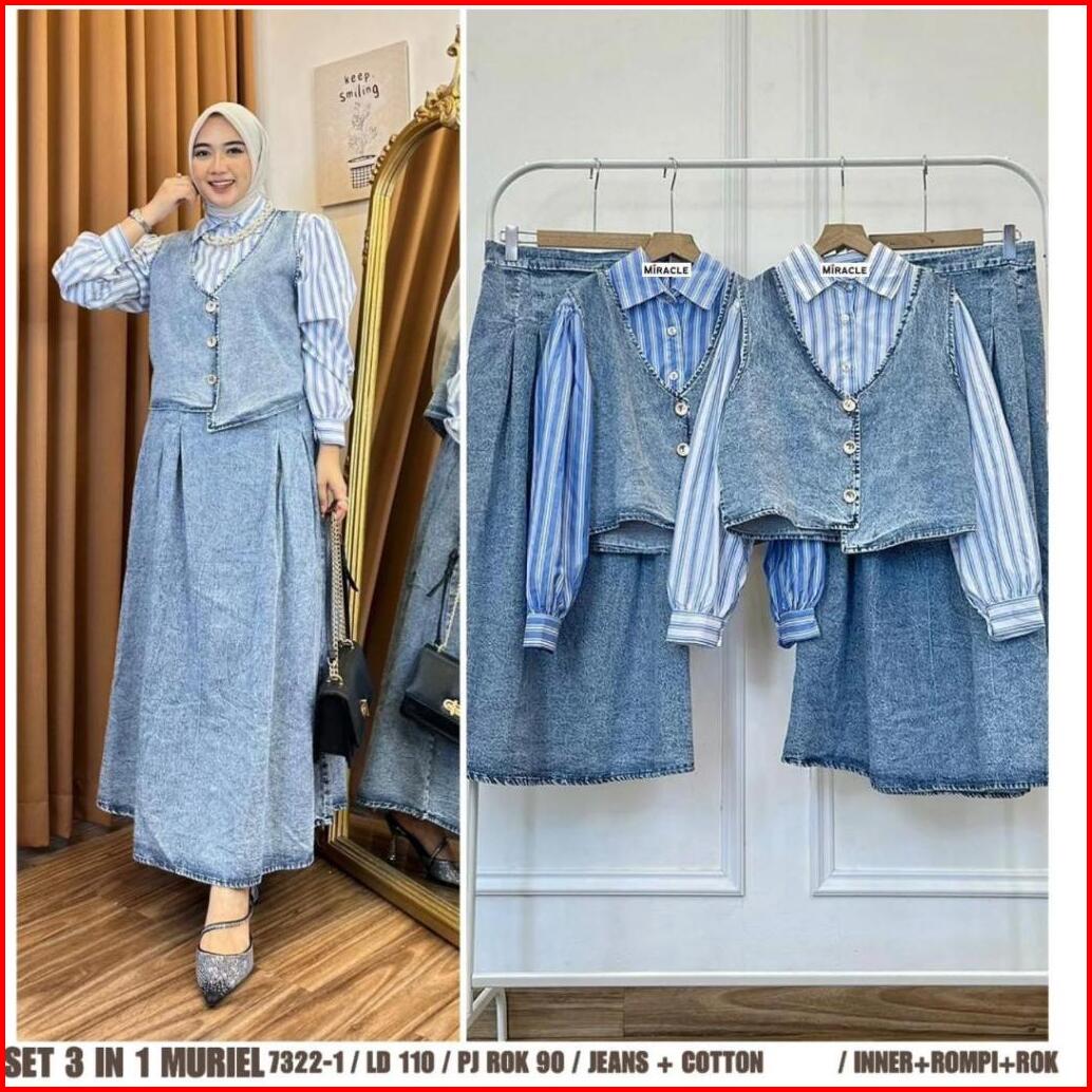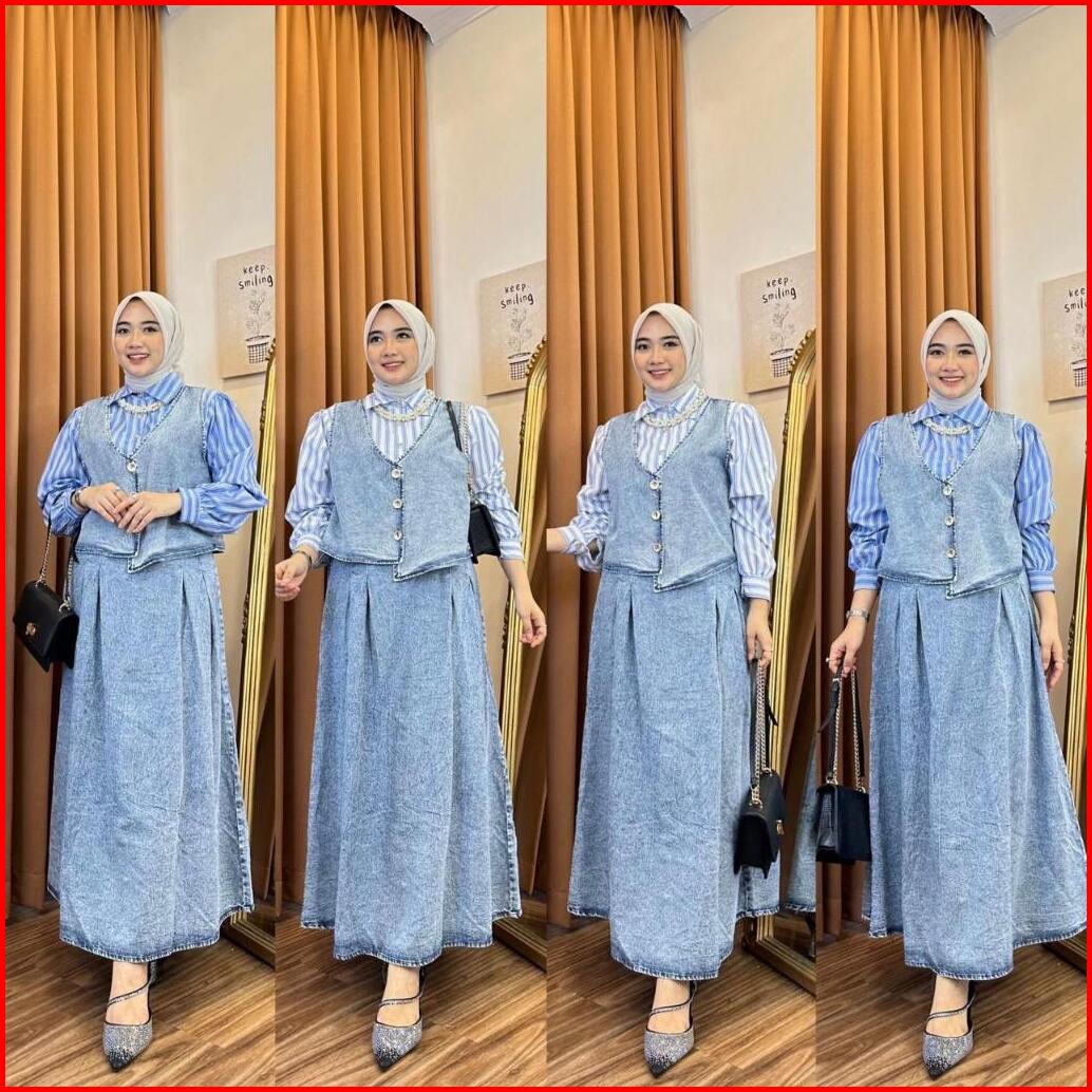 Muriel Set 3in1 Bahan Denim Wash Kombinasi Katun Salur Premium Atasan Rompi Rok Set