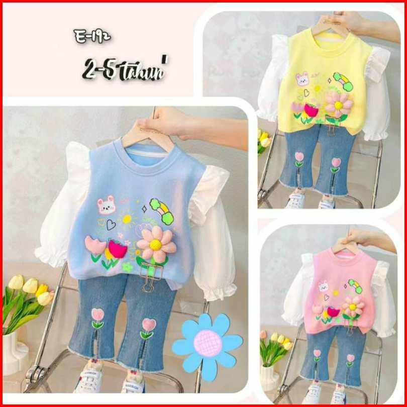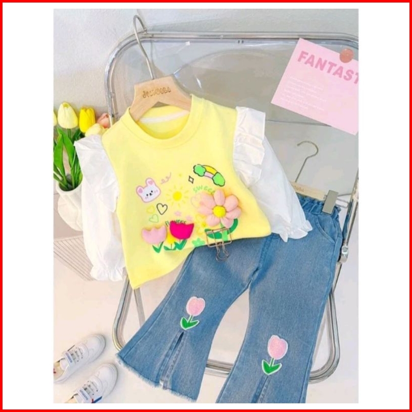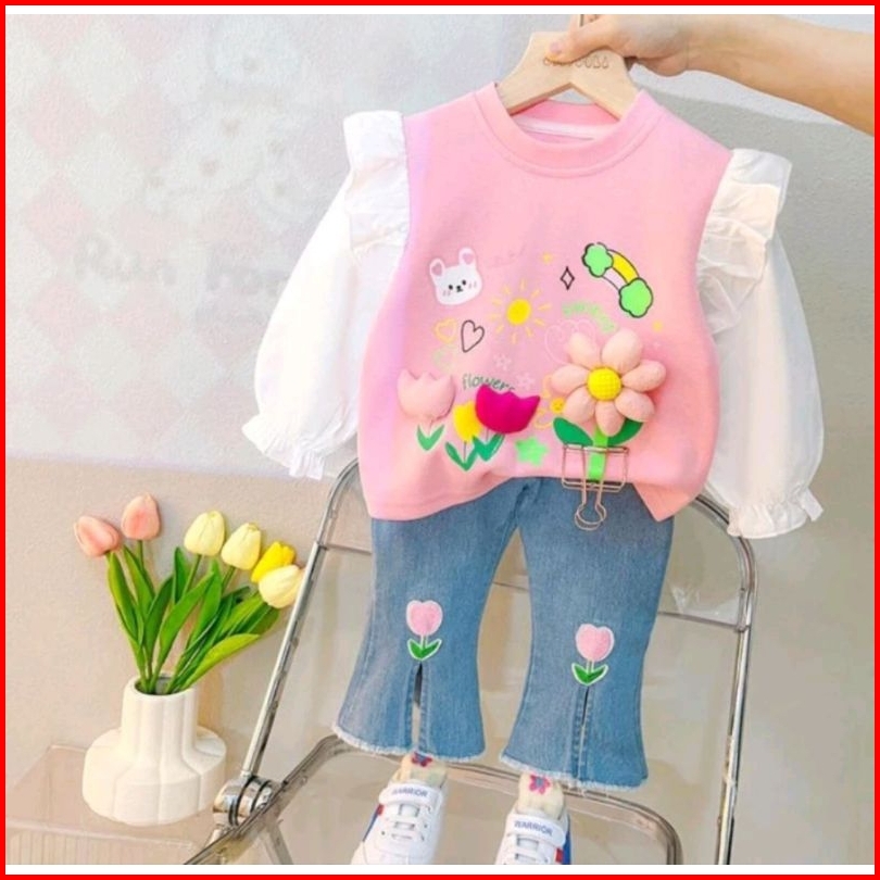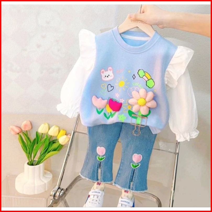 Setelan Anak Perempuan 2tahun - 5tahun Setjins Panjang Baju Anak Vewek Motif Bunga Sweater Jeans Rawis Kaos Biru Pink Ku