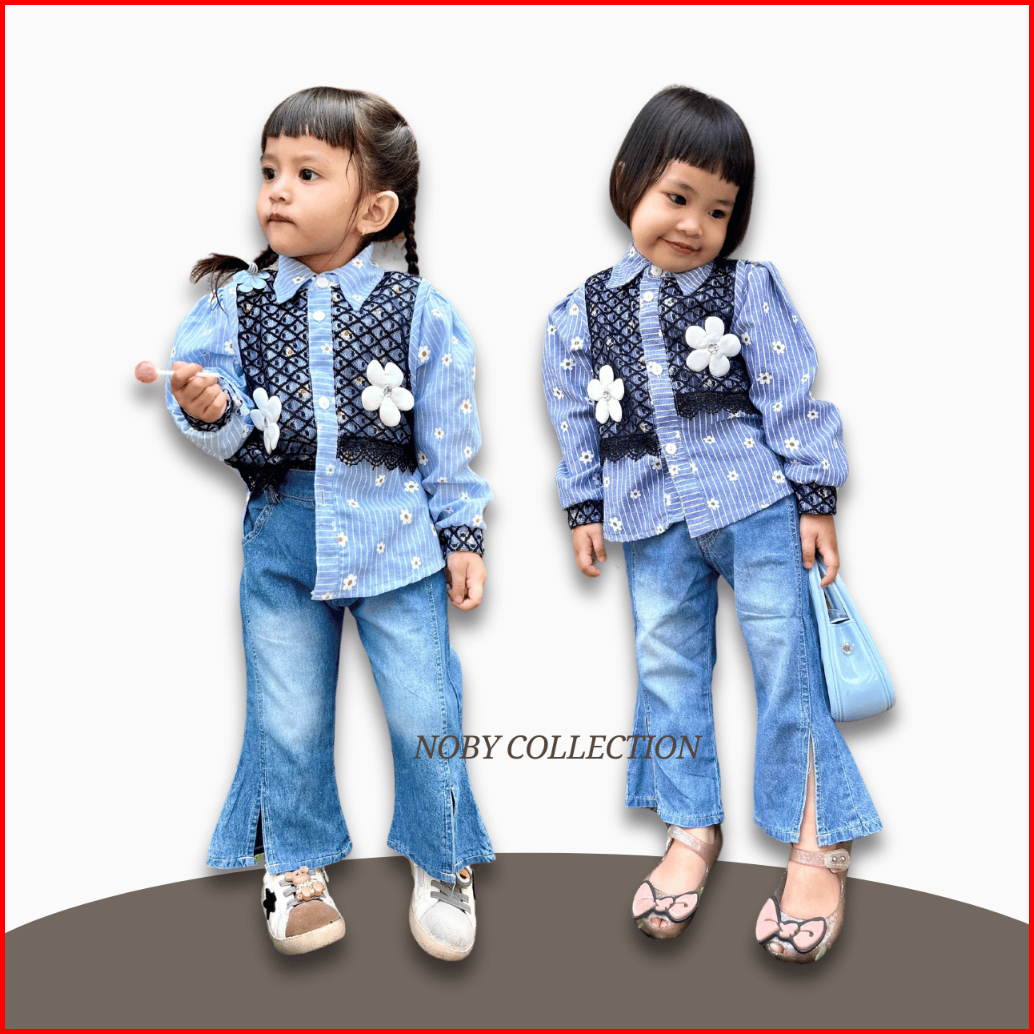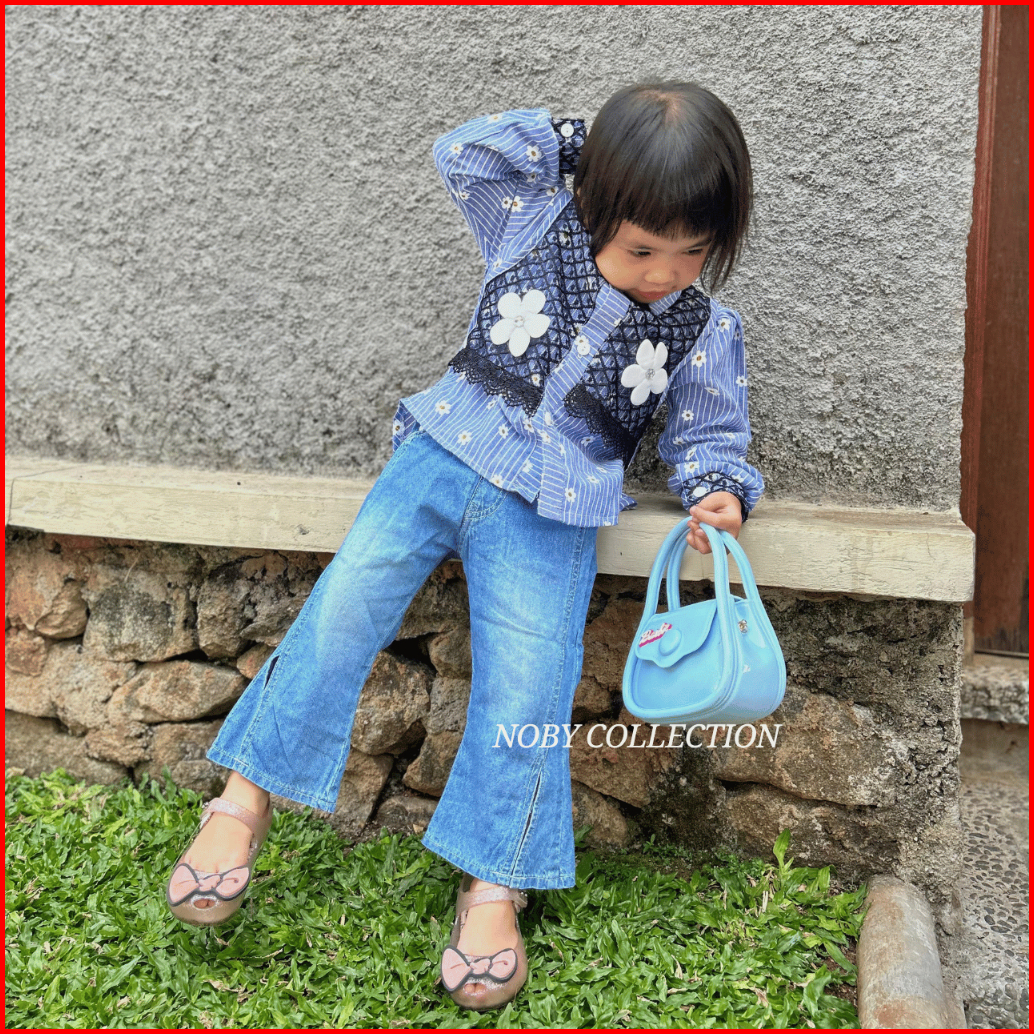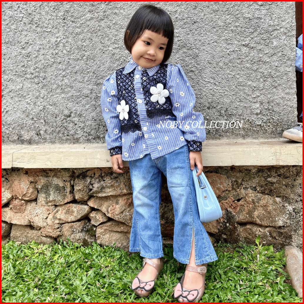 Setelan Celana Cutbray Baju Anak Perempuan Motif Salur Bunga Kombinasi Burkat