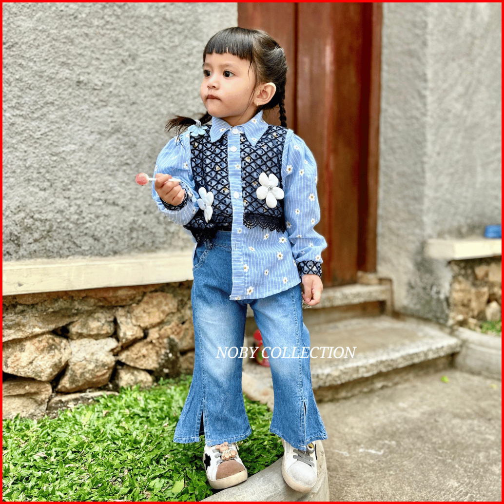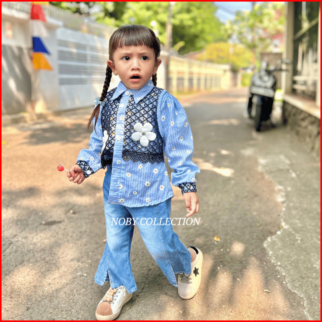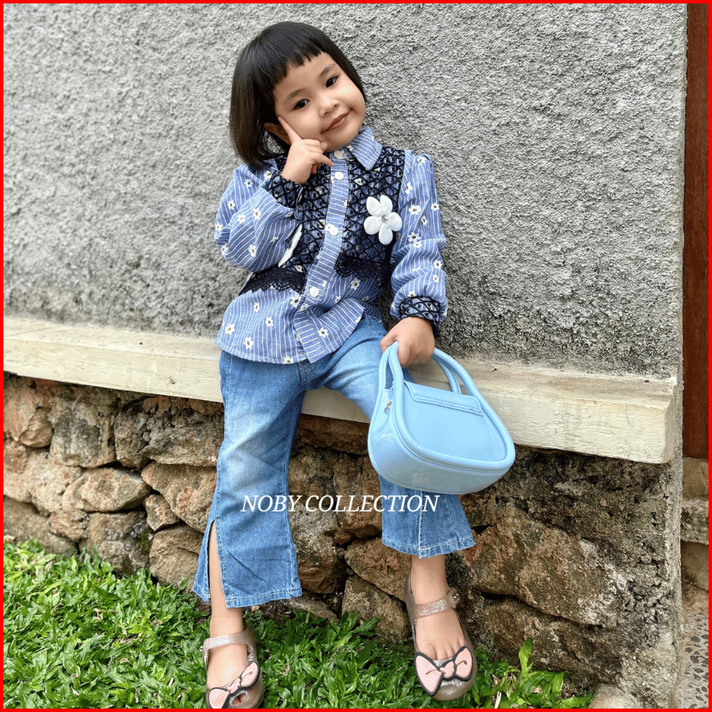 Setelan Celana Cutbray Baju Anak Perempuan Motif Salur Bunga Kombinasi Burkat