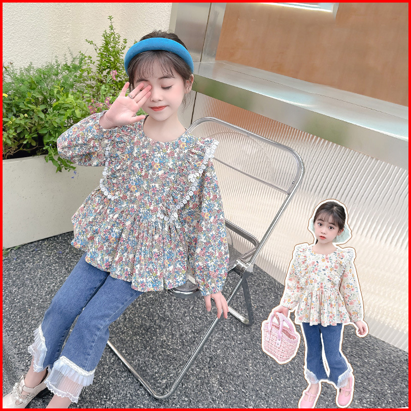 Rabbit Kids One Set Baju Anak Perempuan Katun Flower Celana Jeans Renda Elegan