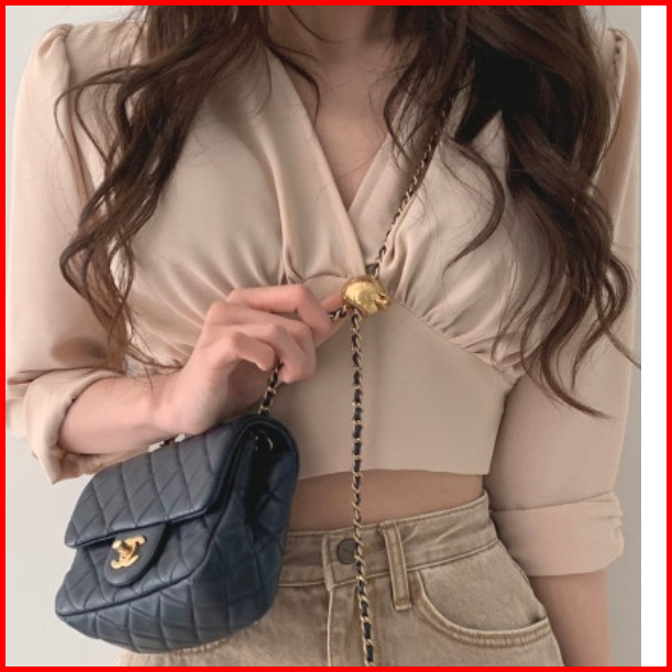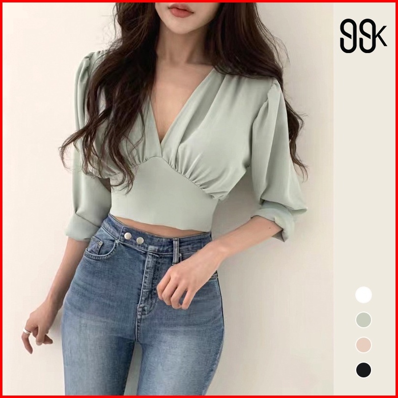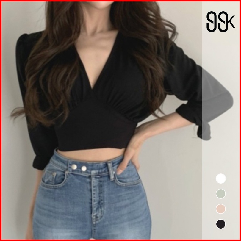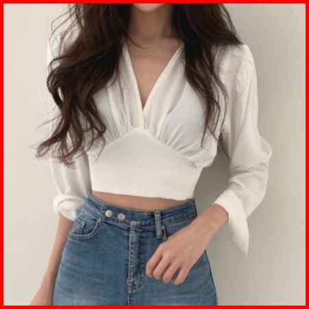 V Neck Long Sleeve Crop Top Blouse 1296 S - Xl