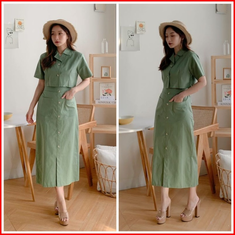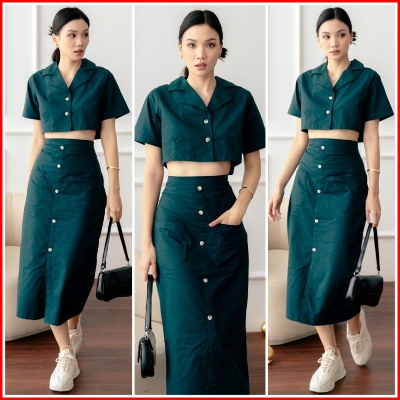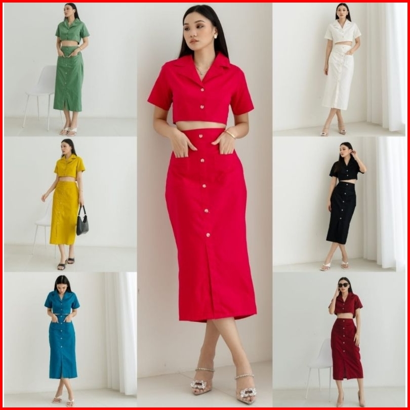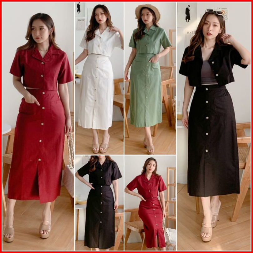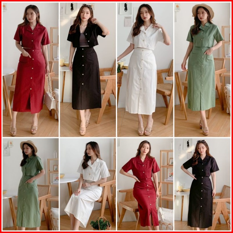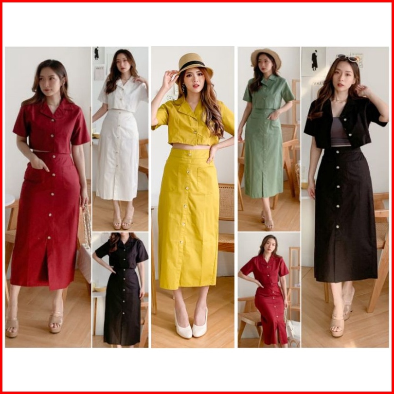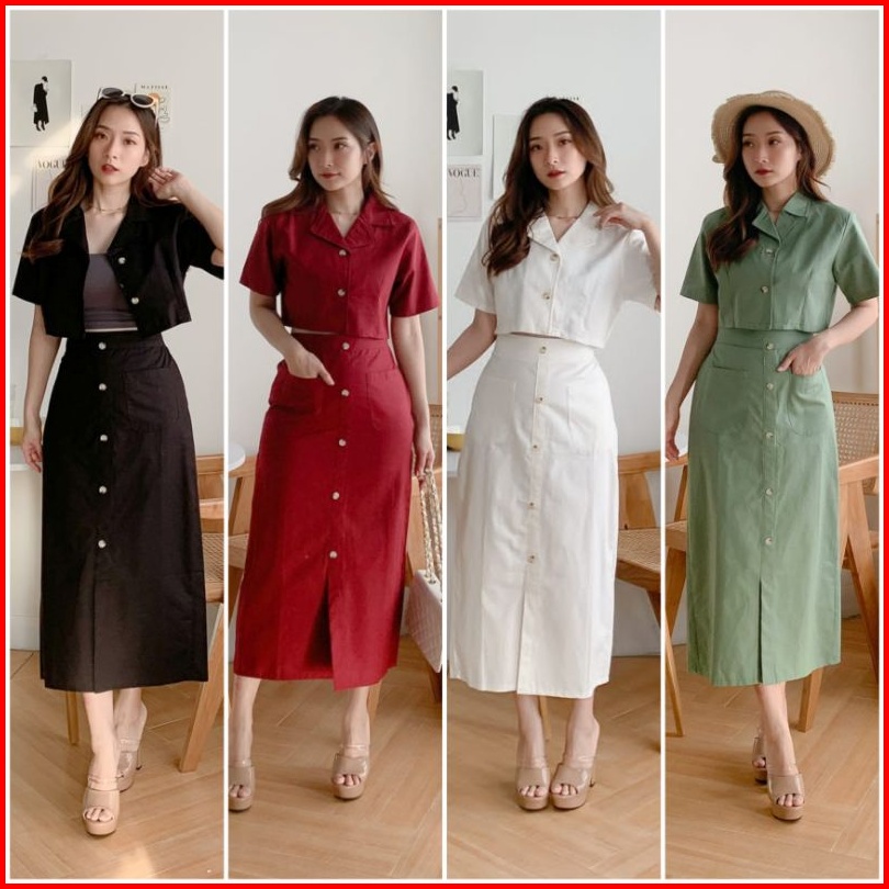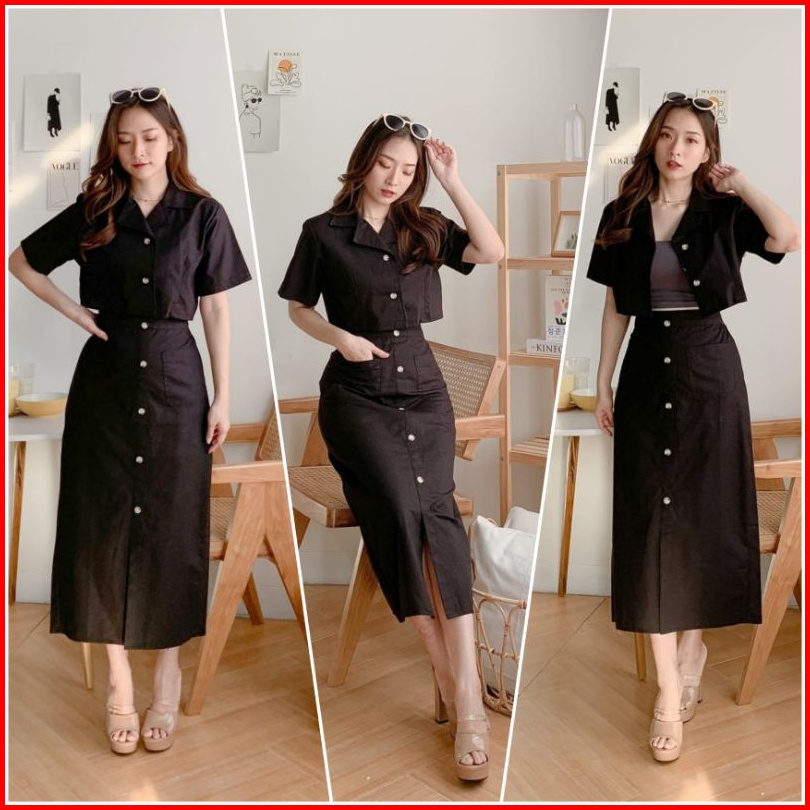 Super Sale Penghabisan Best Seller Premium Dannisa 2 In 1 Button Set Collar Crop Shirt With Midi Skirt Setelan Kemeja Pe
