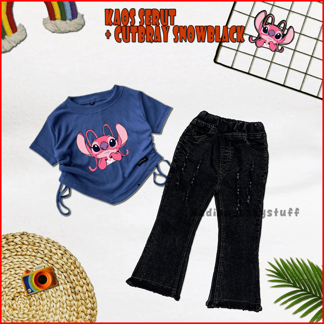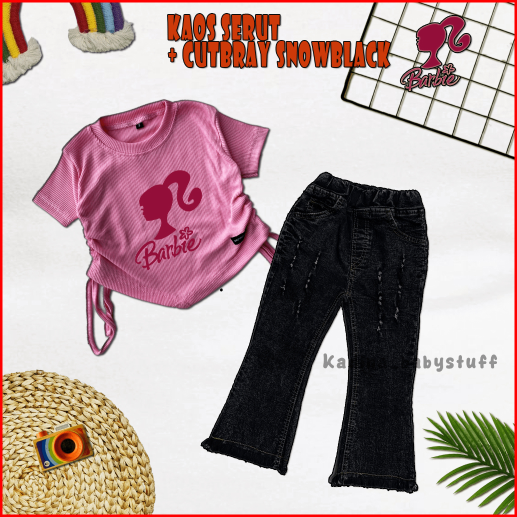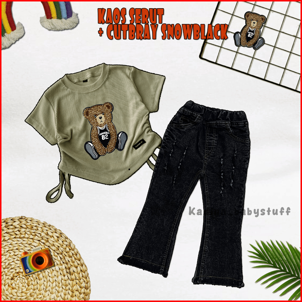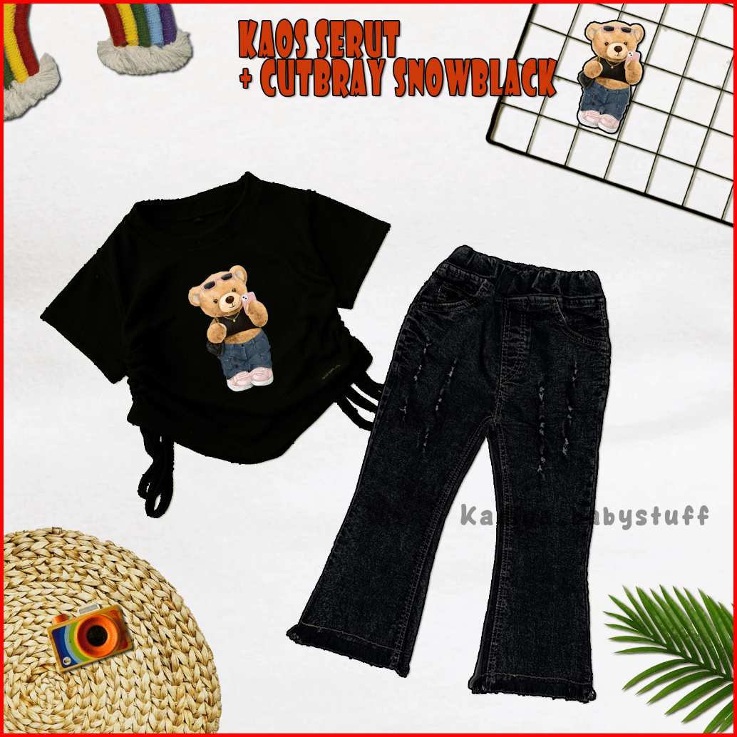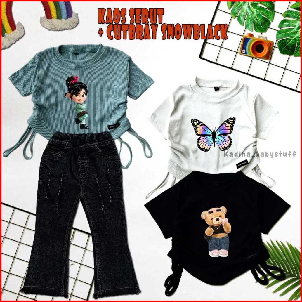 Setelan Anak Kekinian Cutbray Jeans Snowblack Kaos Serut Pendek Motif Sablon 1-12 Thn