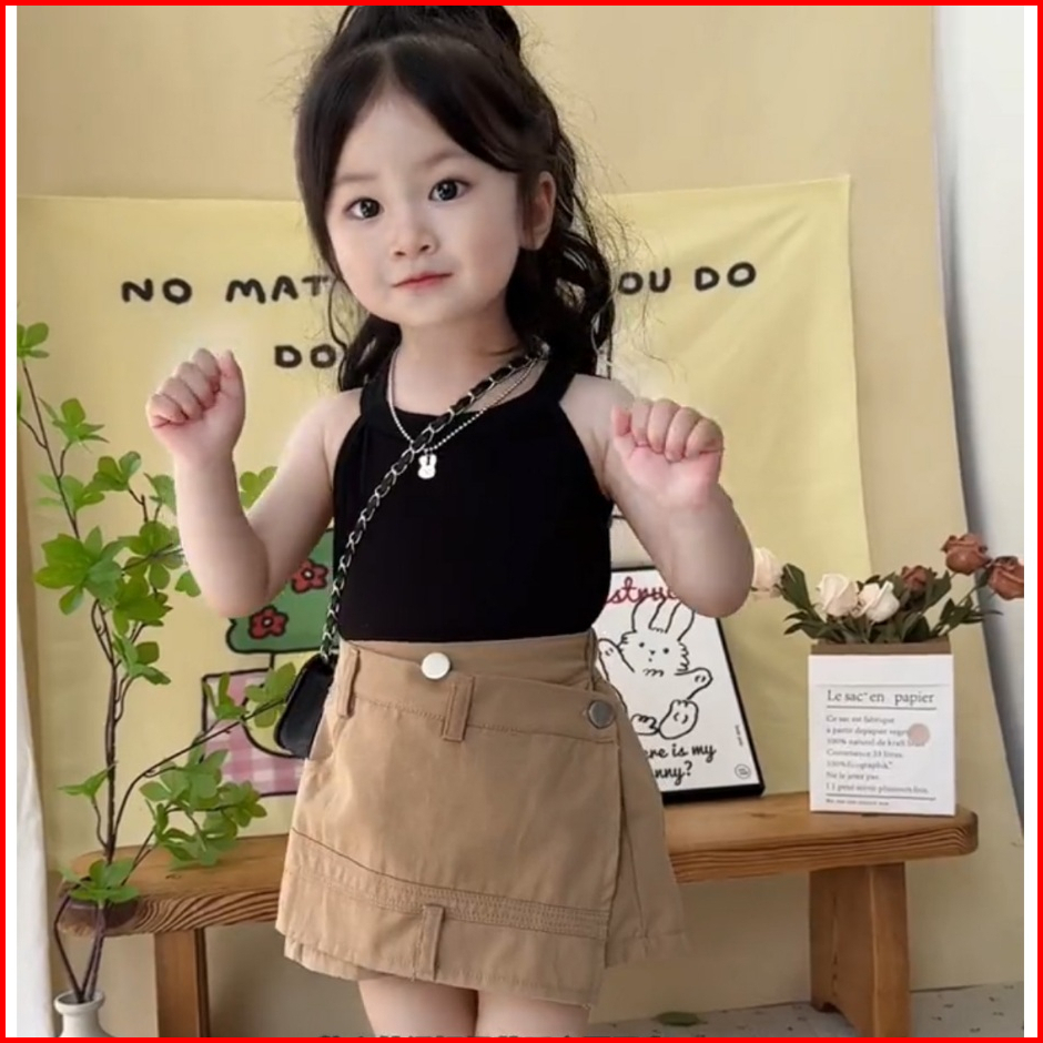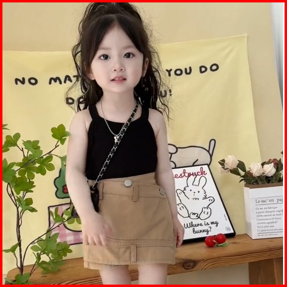 Kingogo Setelan Anak Perempuan Vest Hitam Rok Pendek Denim Musim Panas Produk Baru Import Fashion Set