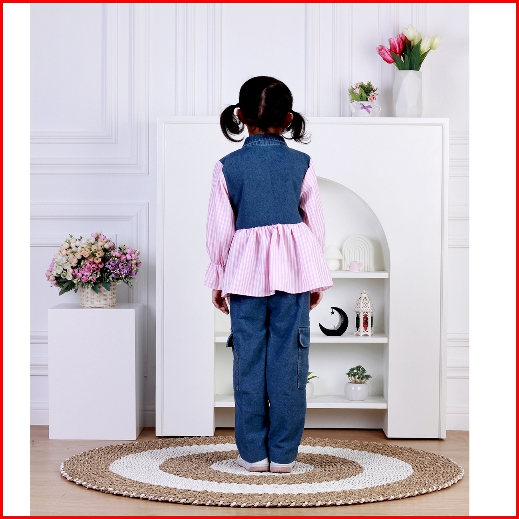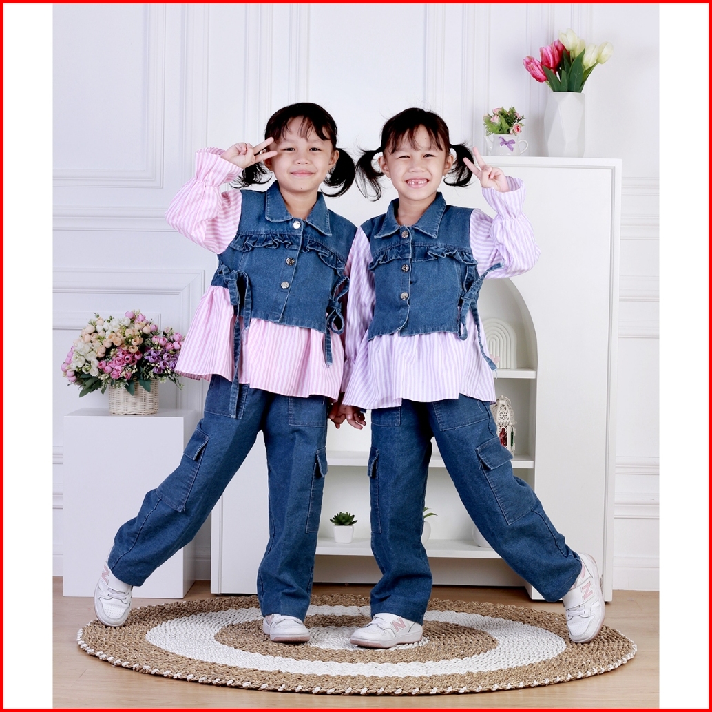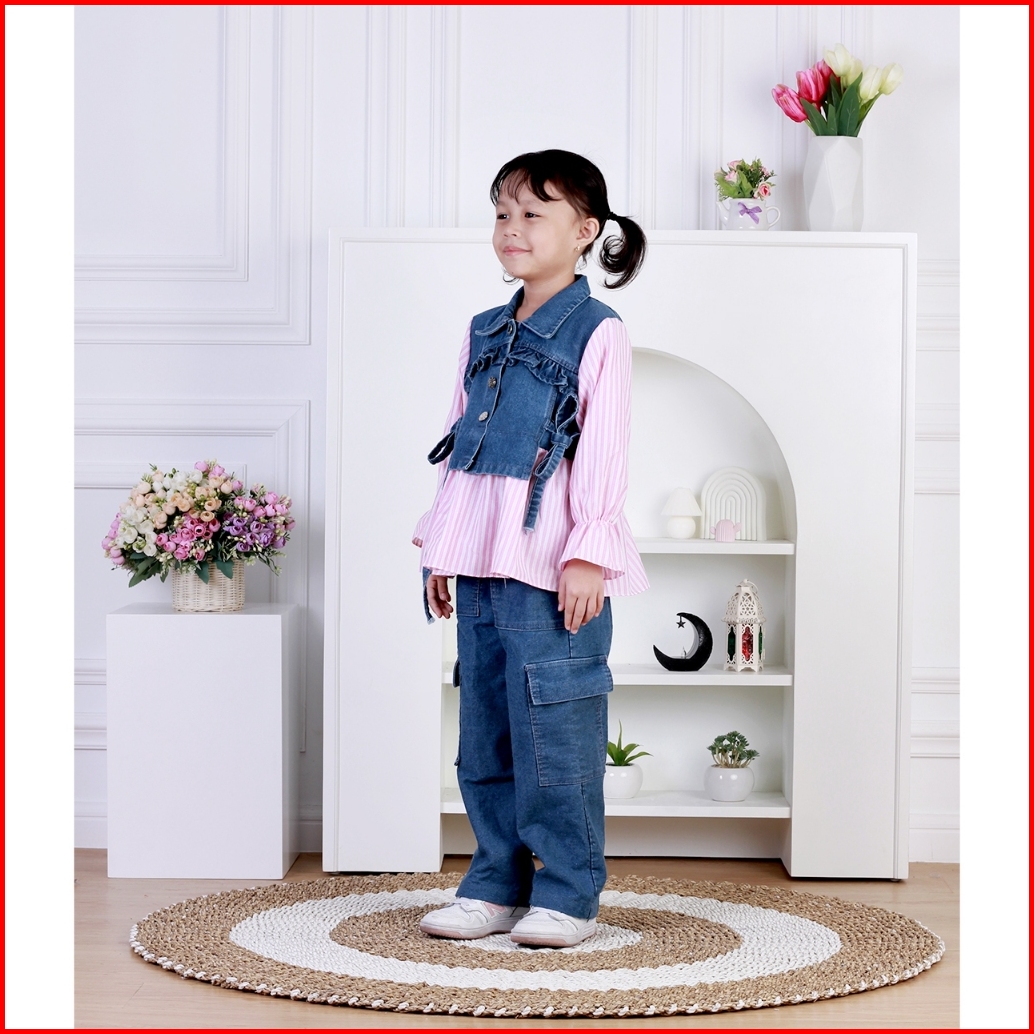 Dungdungkids Setelan Anak 3 In 1 Sonia Rompi Jeans Kargo Katun Salur 3 - 11 Tahun