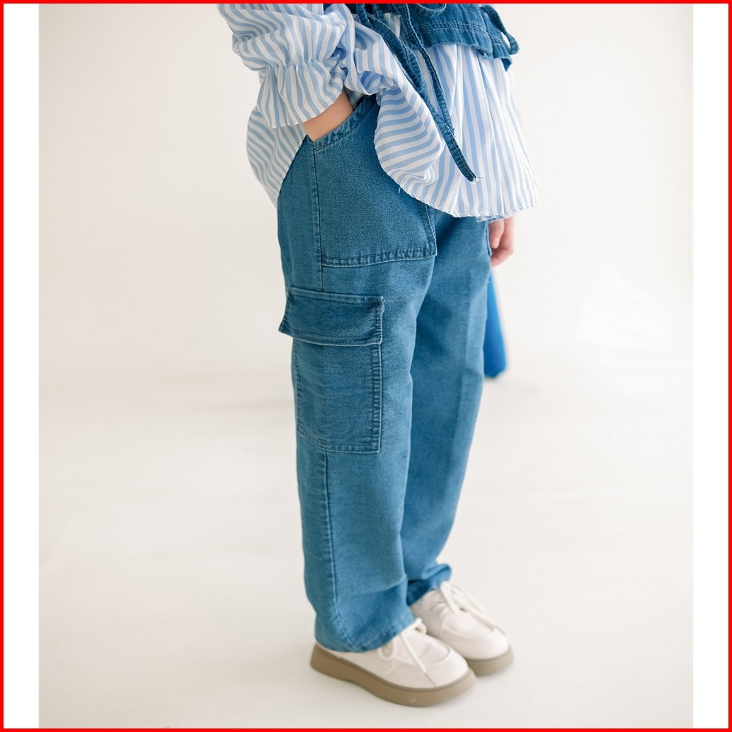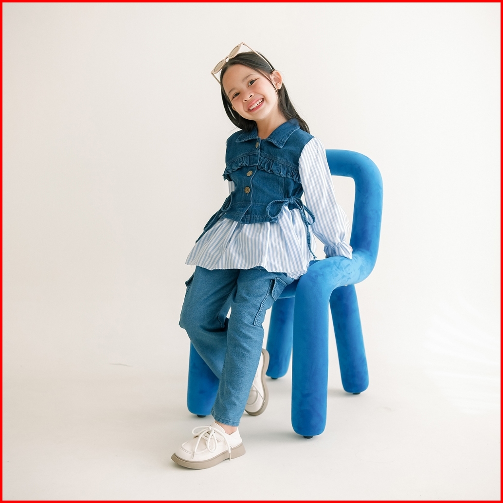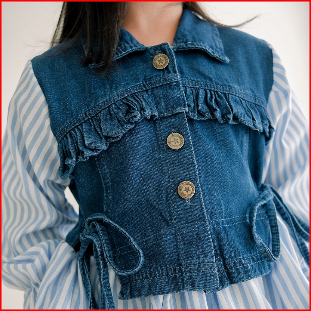 Dungdungkids Setelan Anak 3 In 1 Sonia Rompi Jeans Kargo Katun Salur 3 - 11 Tahun