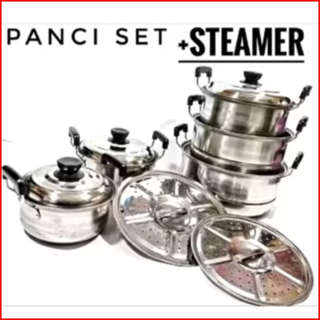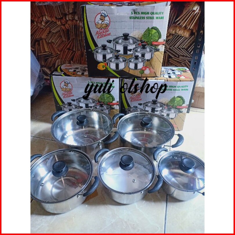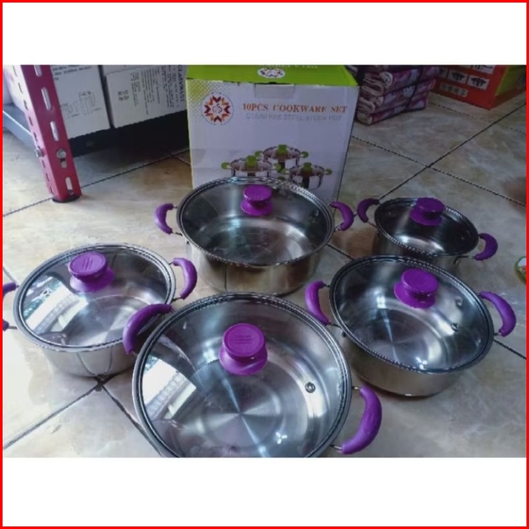 Tri j biru, sarang+tutup stanles, Tri j merah WARNA, Tri hijau, Panci tri j ungu, Hitam kaca+sarangan, Ungu kaca+sarang