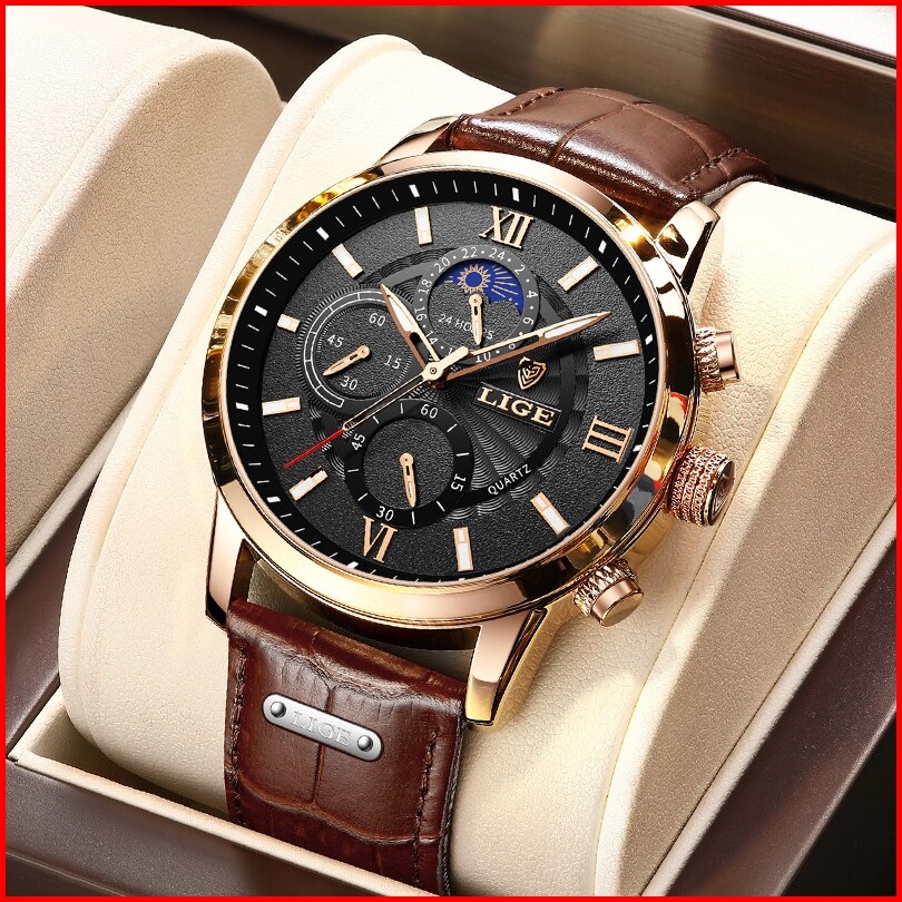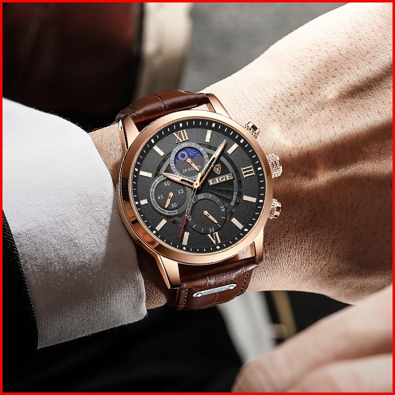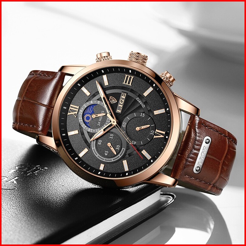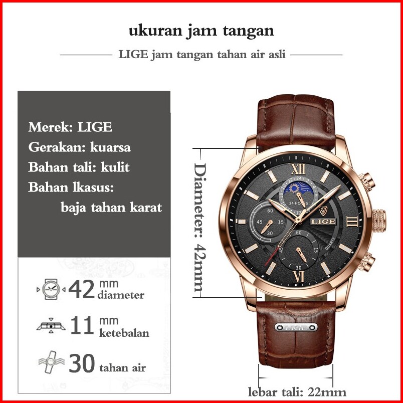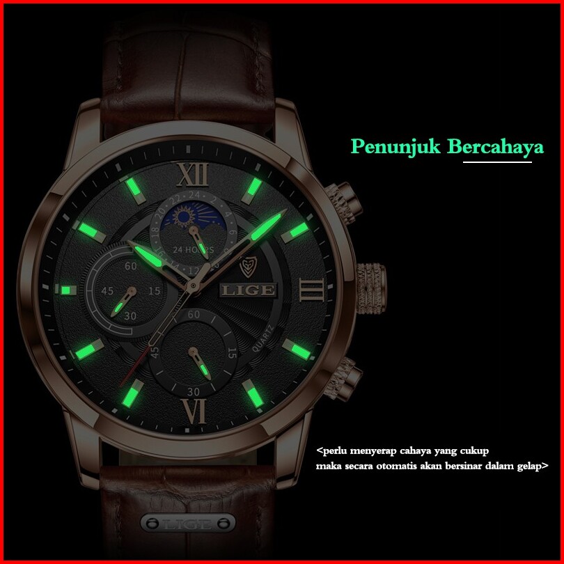 Lige Original Jam Tangan Pria Tali Kulit Anti Air Olahraga Kronograf Jam Tangan