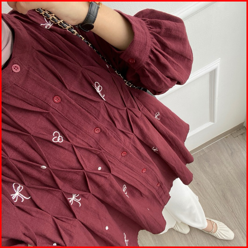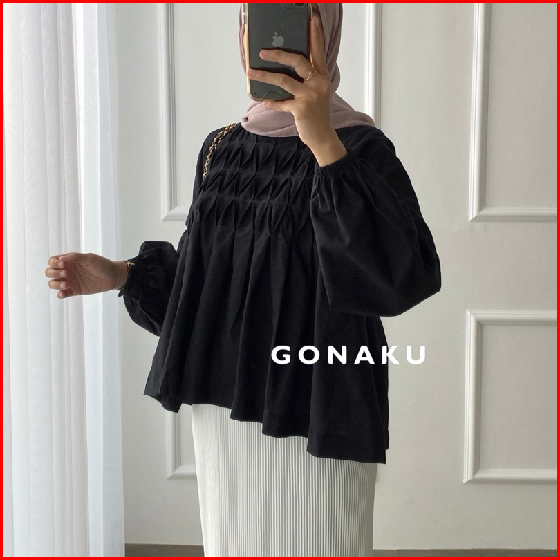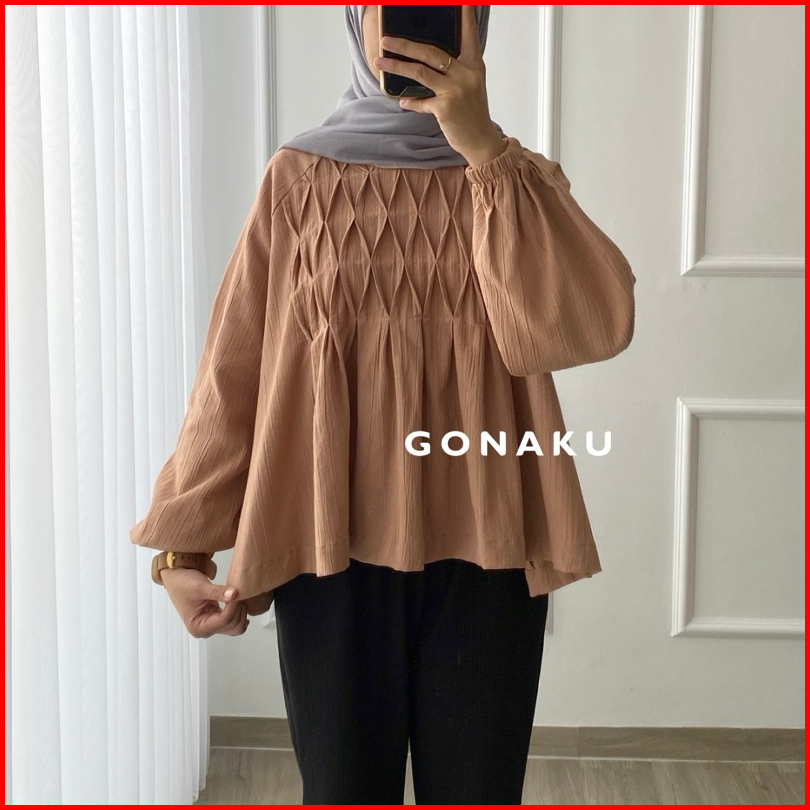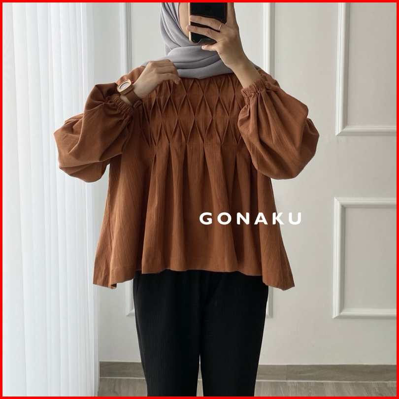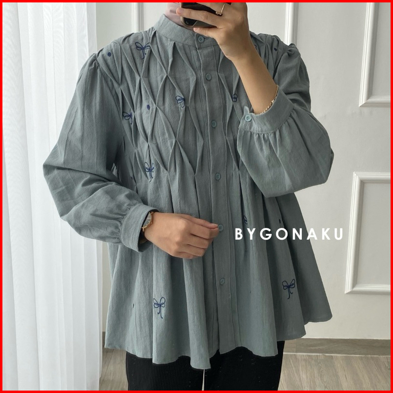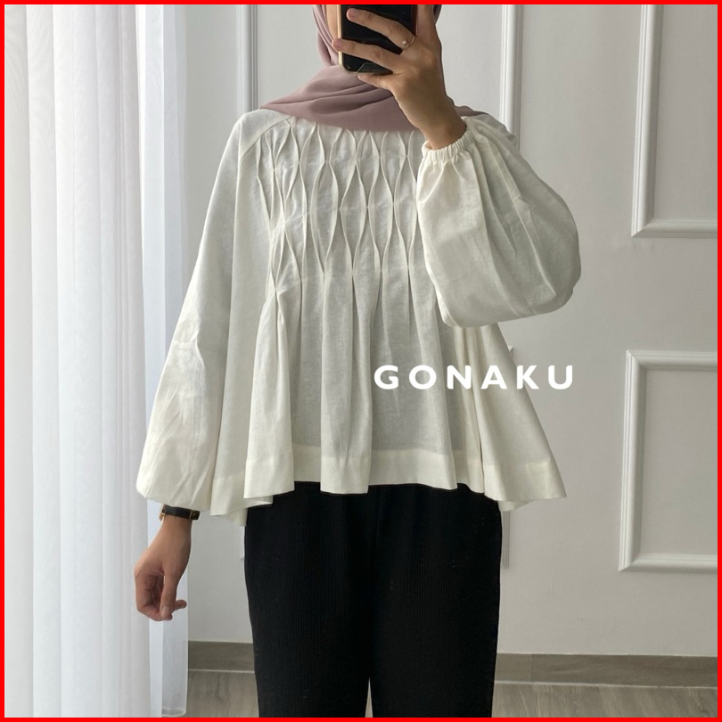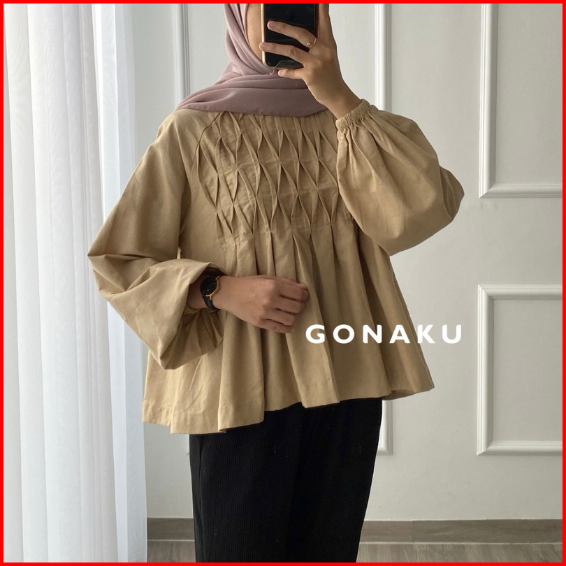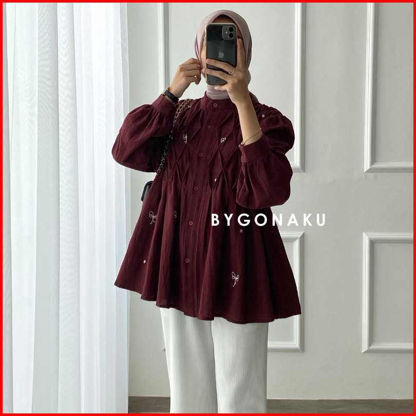 Gonaku Cherry Oversized Blouse Blouse Korea Crop Blouse Atasan Linen Baju Kerja Kuliah Blouse Linen Earth Tone Baju Puti