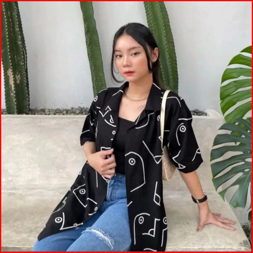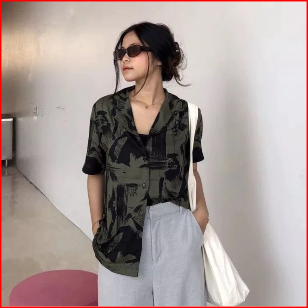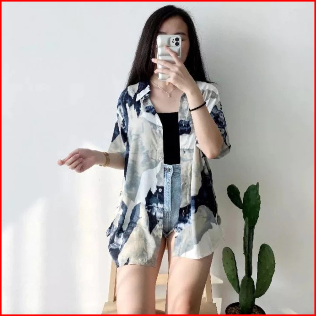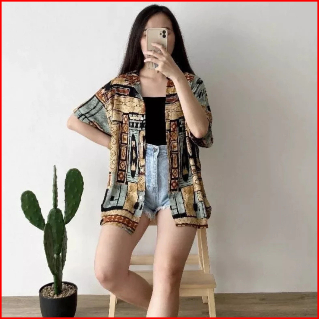 Kemeja Pattern Rayon Kemeja Oversize Lengan Pendek Wanita Blouse Atasan Wanita Vintage Kemeja Pantai