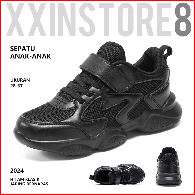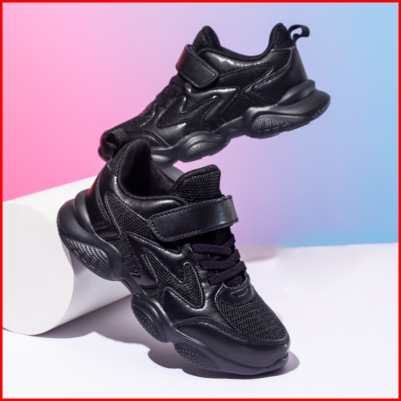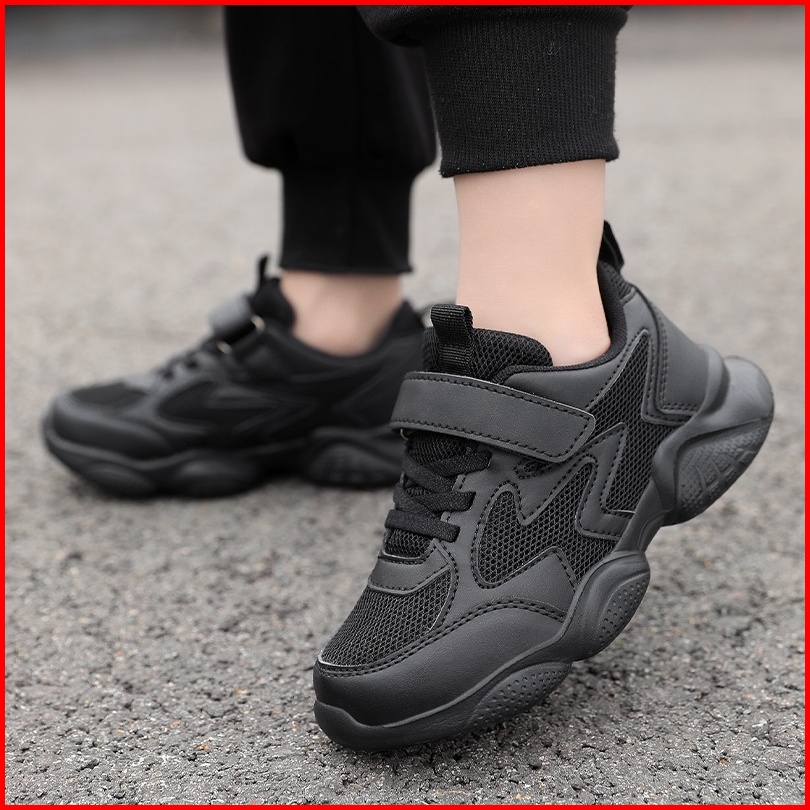 Sepatu Sekolah Anak Laki Laki Full Hitam Ukuran Sneakers Hitam Velcro Sepatu Anak-anak Berventilasi