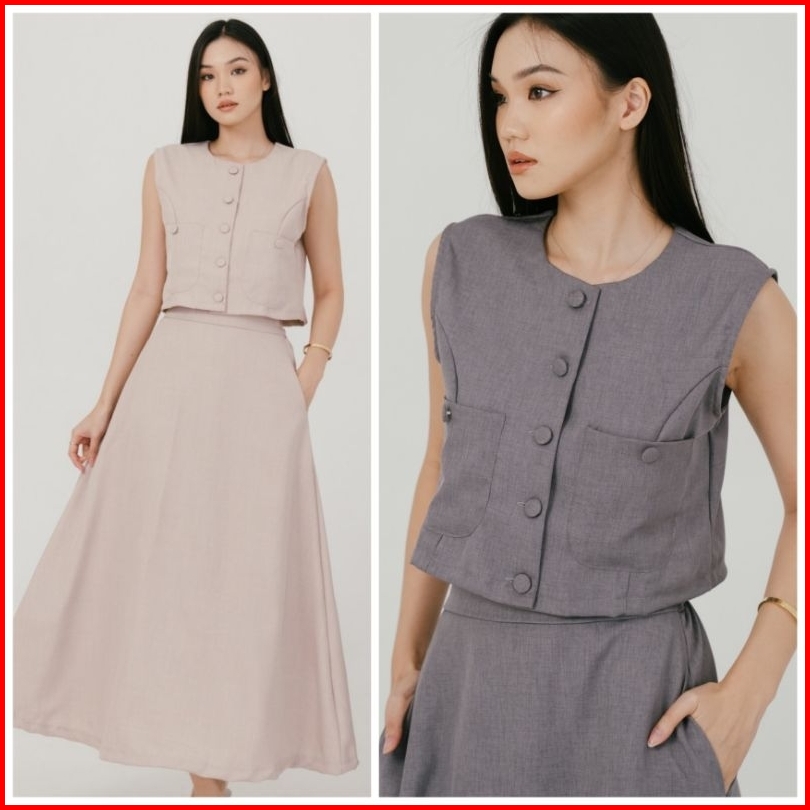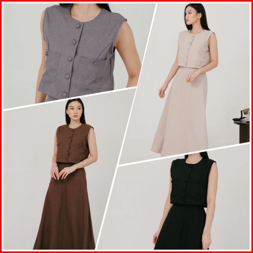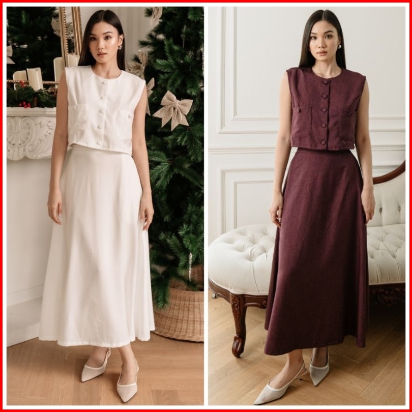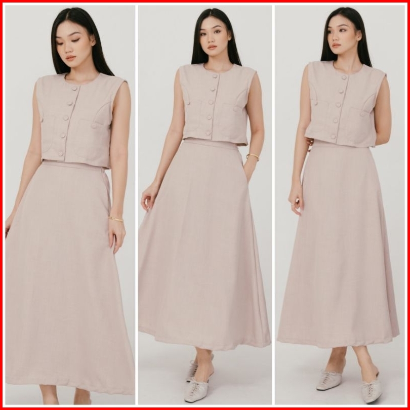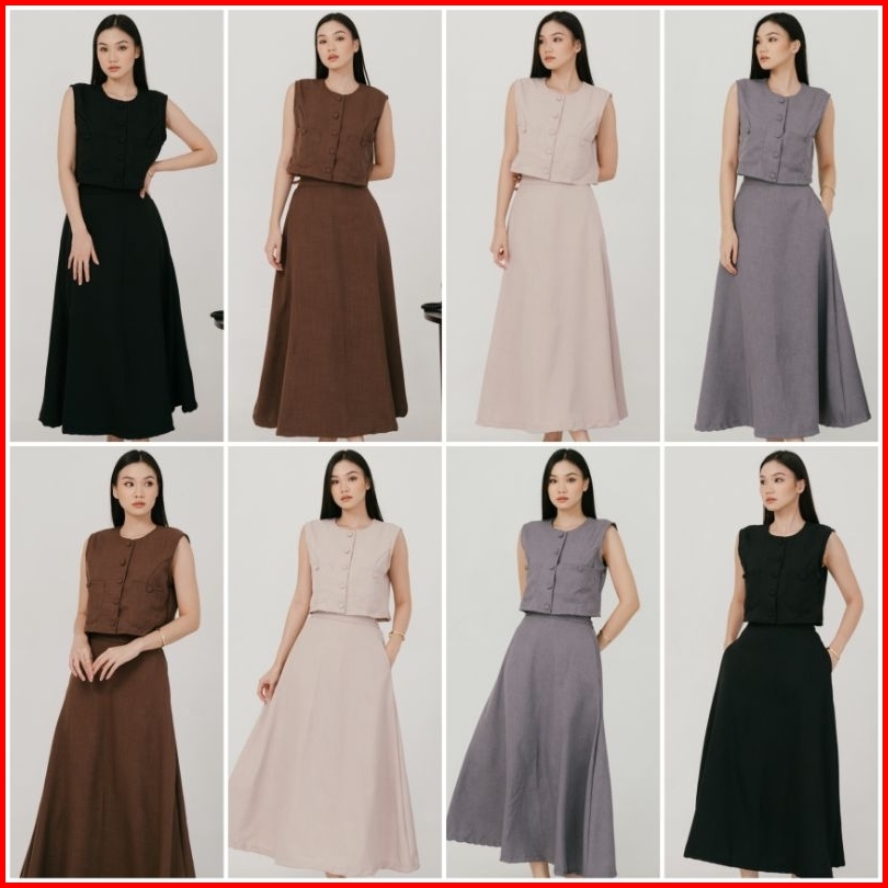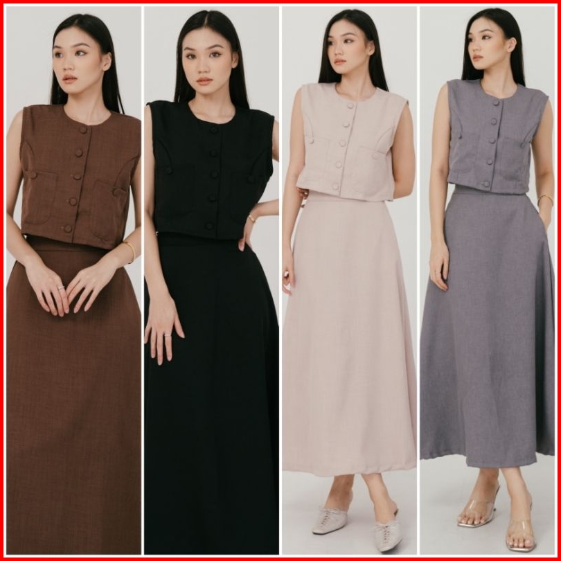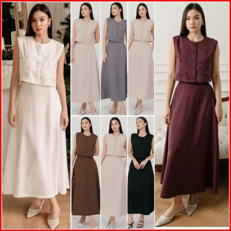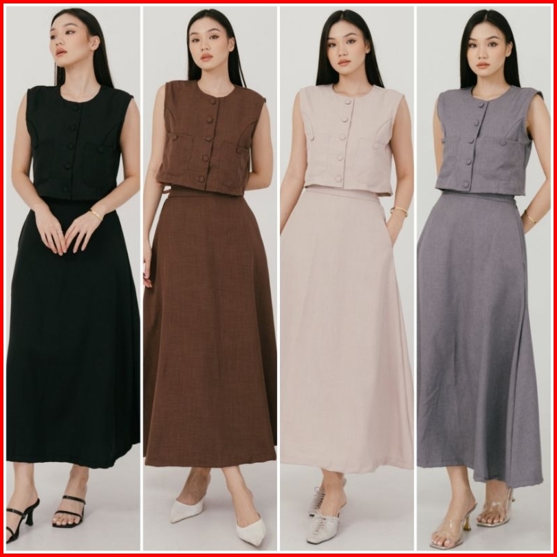 Best Seller Recommended Premium Theanna 2 In 1 Semiwool Set Button Less Sleve Blouse Vest With Midi Flare Skirt Shelicio