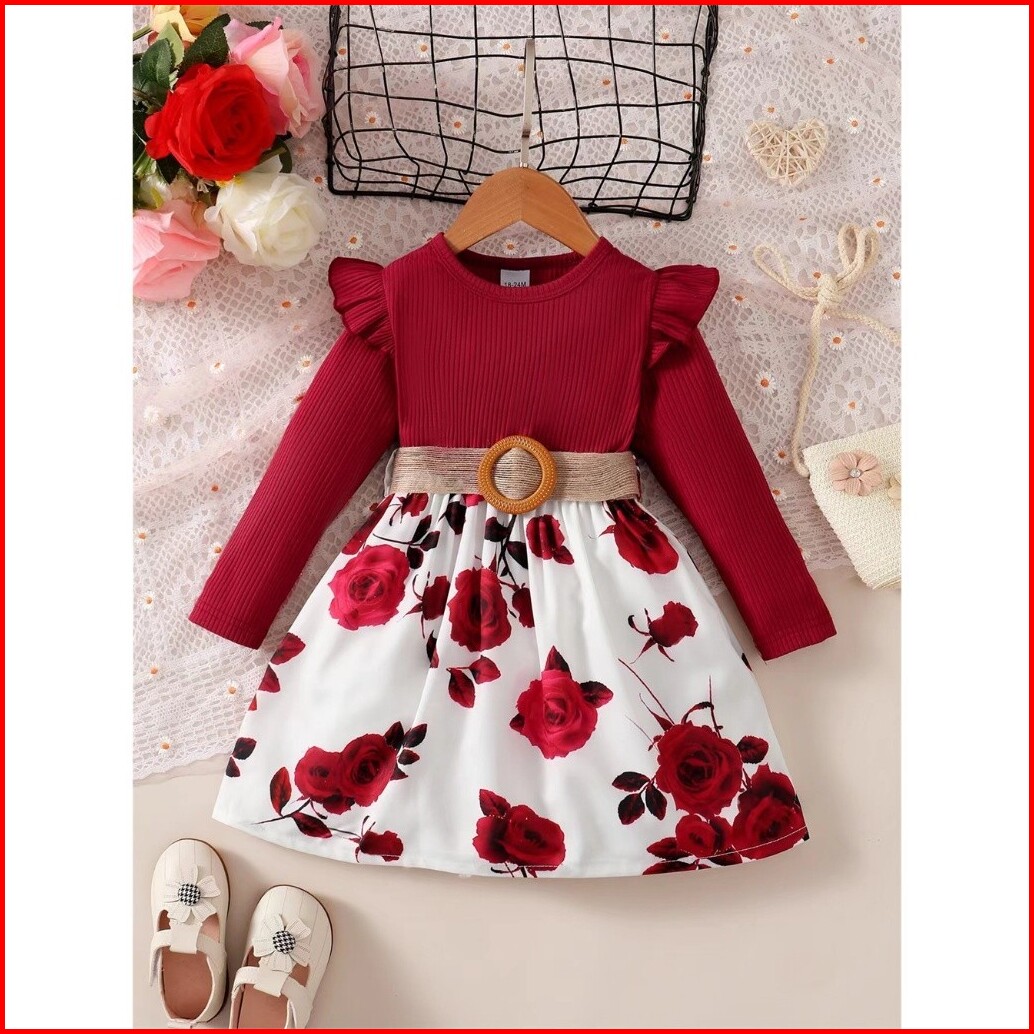 Haasya Kids 1-7y Kids Girl Fly Sleeve Floral Print Long Sleeve O-neck A-line Princess Dress Lovely Charming Baby Clothin
