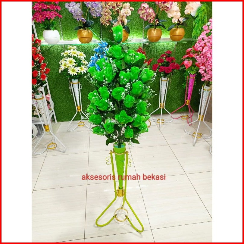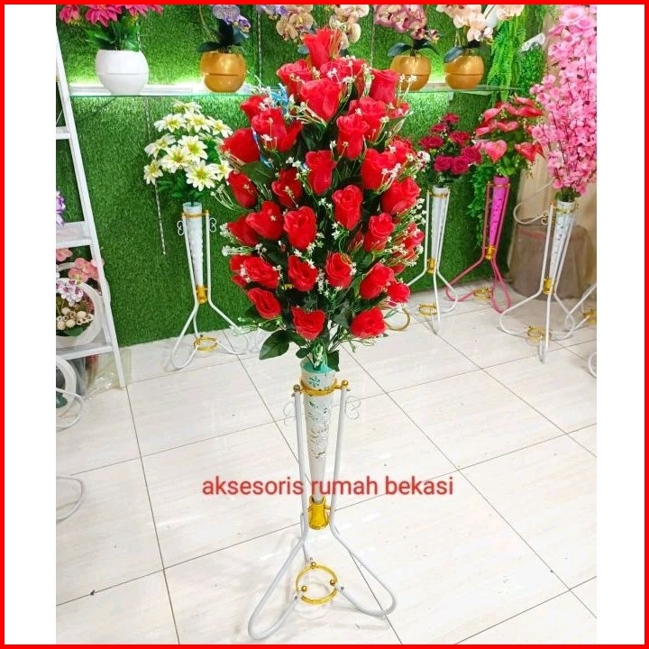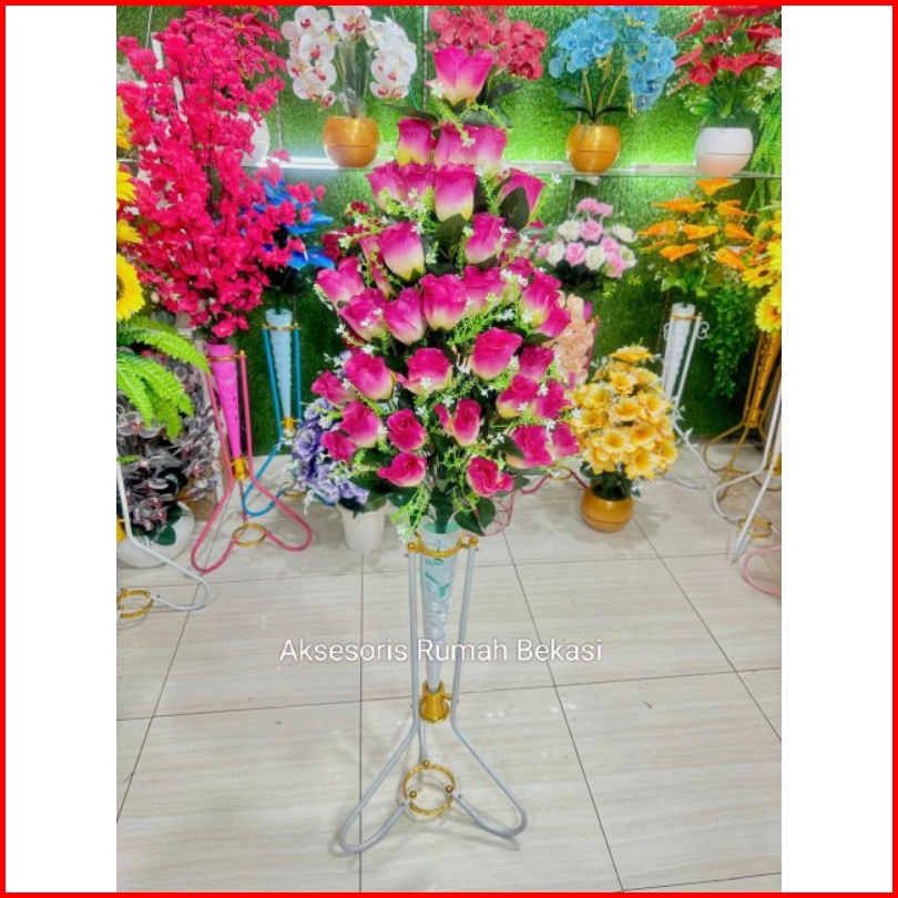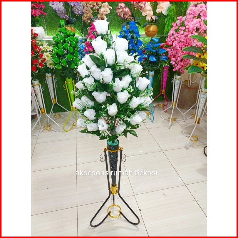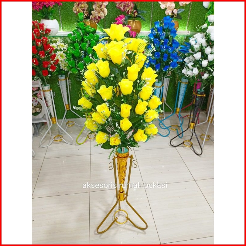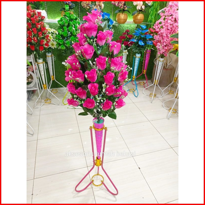 Bunga Sudut Mawar Kuncup Artificial Isi 48 Kuntum Dengan Pot Standing Besi