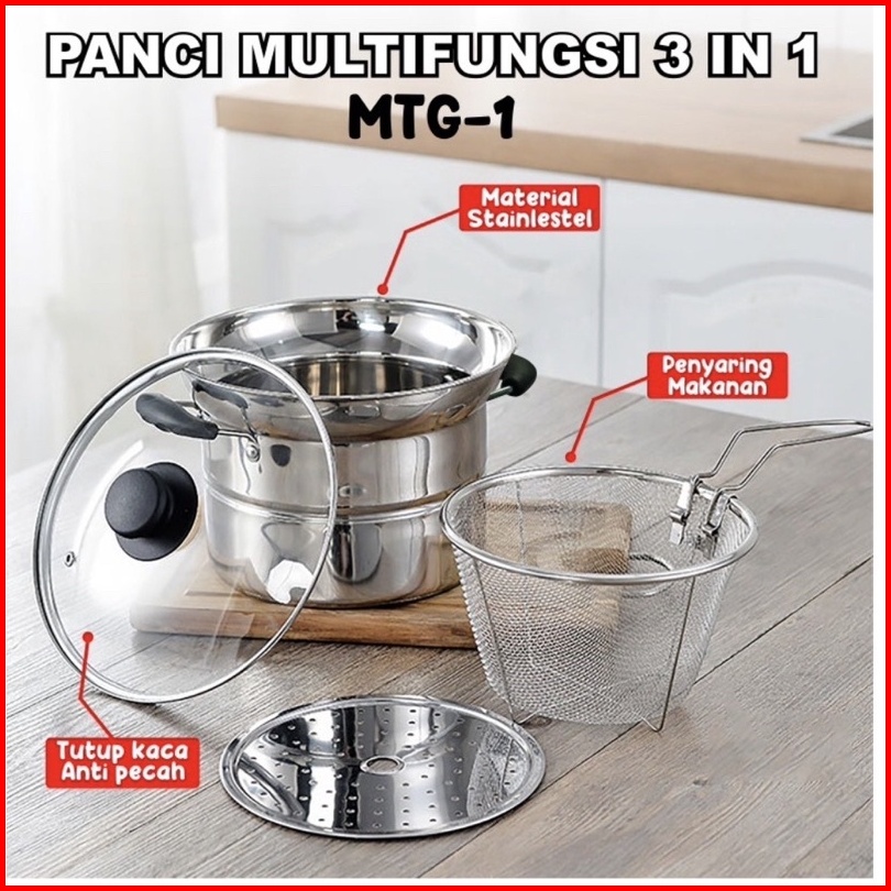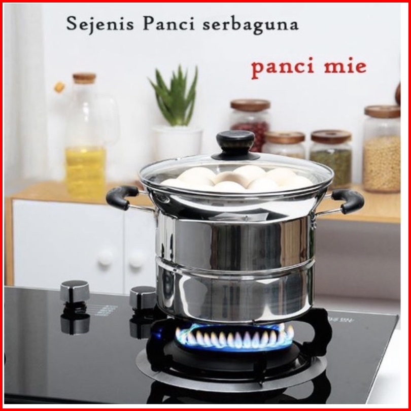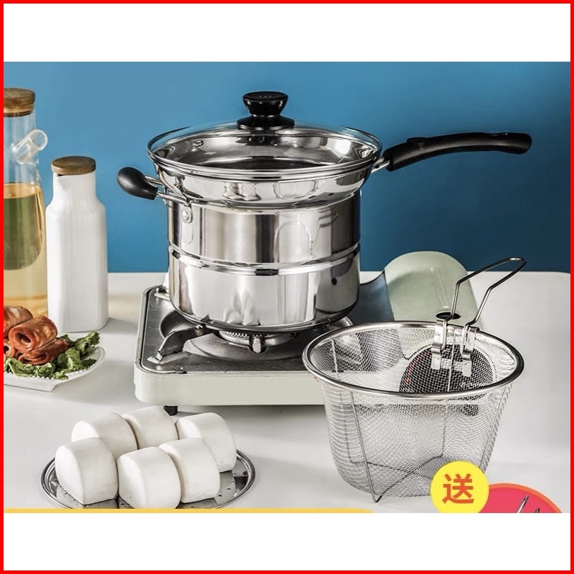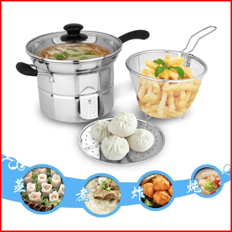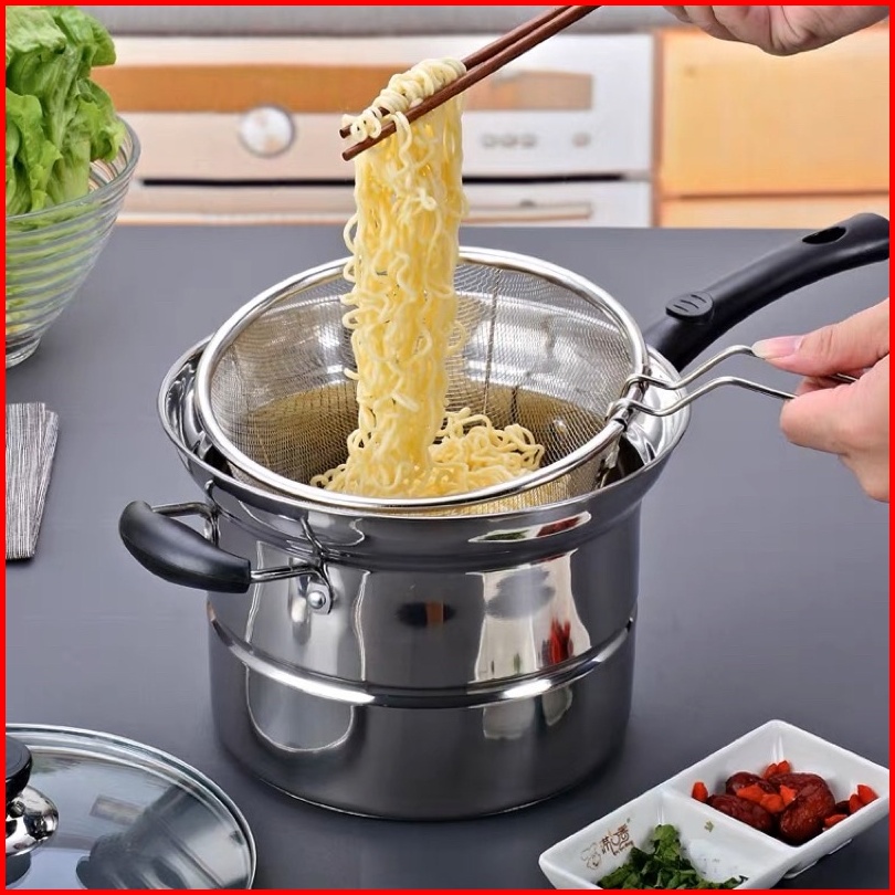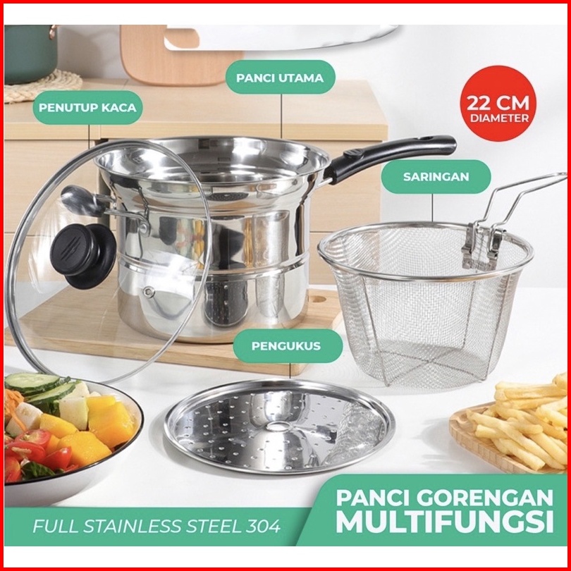 Is - Panci 3in1 Goreng Rebus - Deep Fryer Gagang Panjang Kuping 2 - Panci Mie Stainless - Panci Steamer Multifungsi