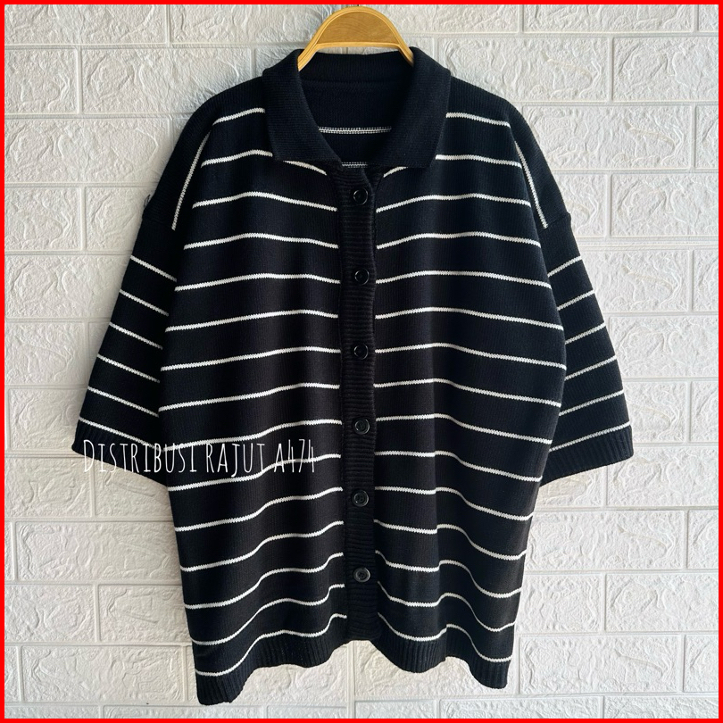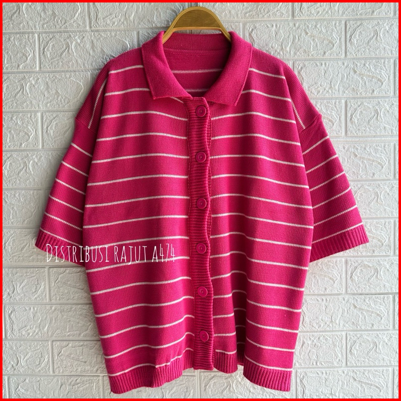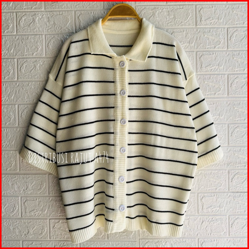 Emy Polo Cardigan Rajut Kancing Motif Stripe Wanita Lengan 3 4