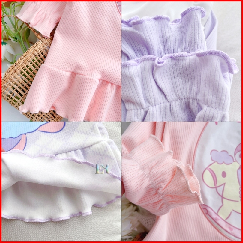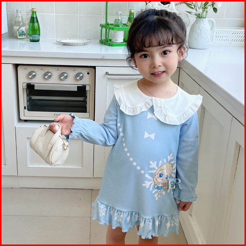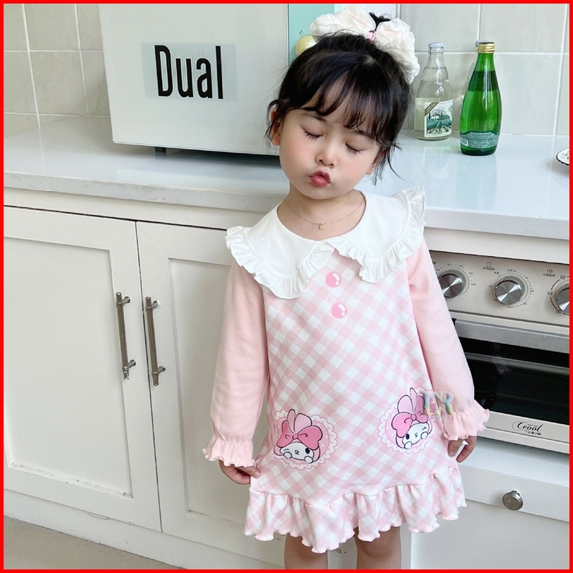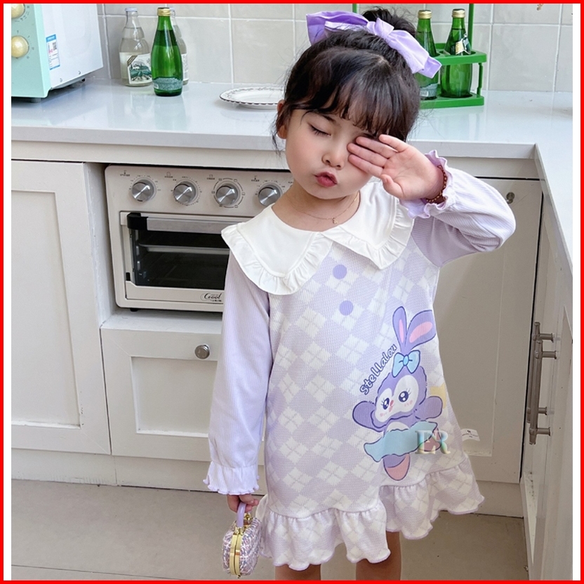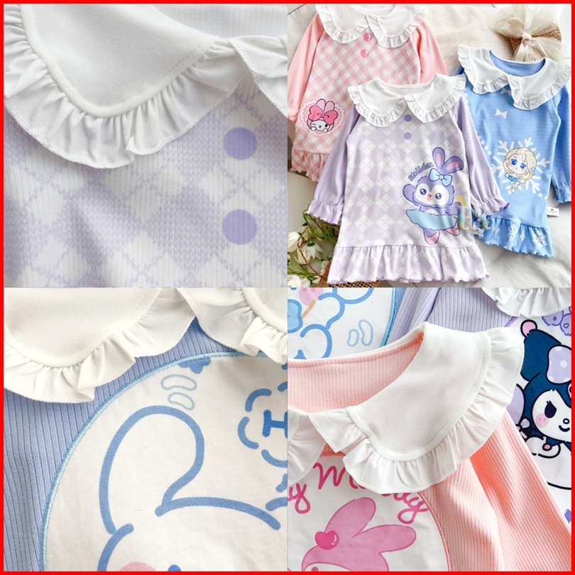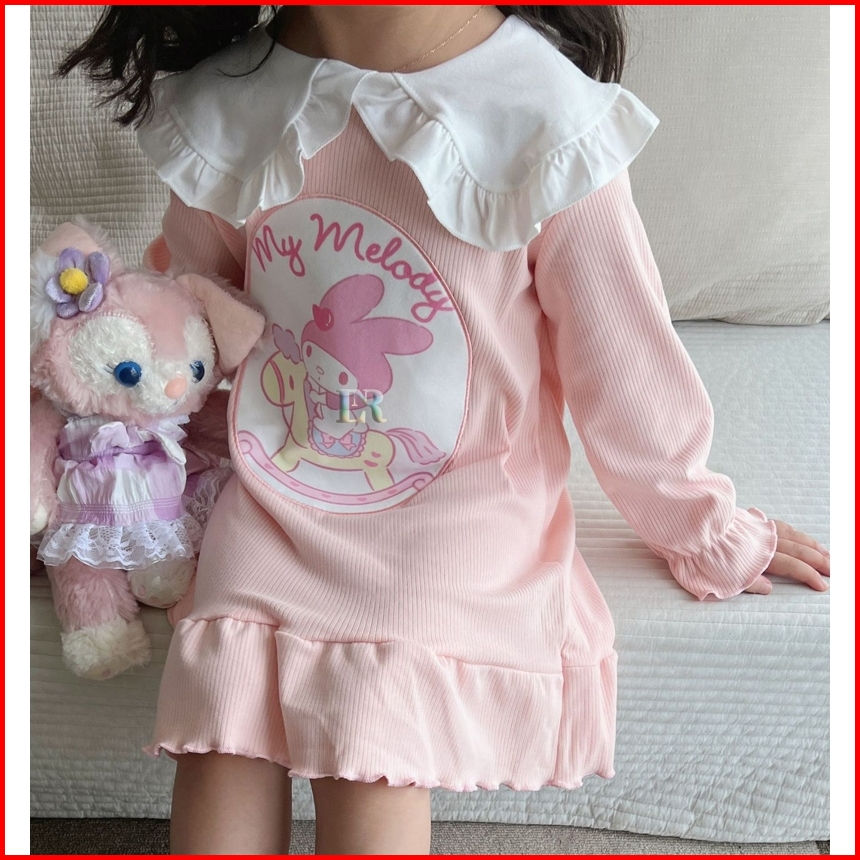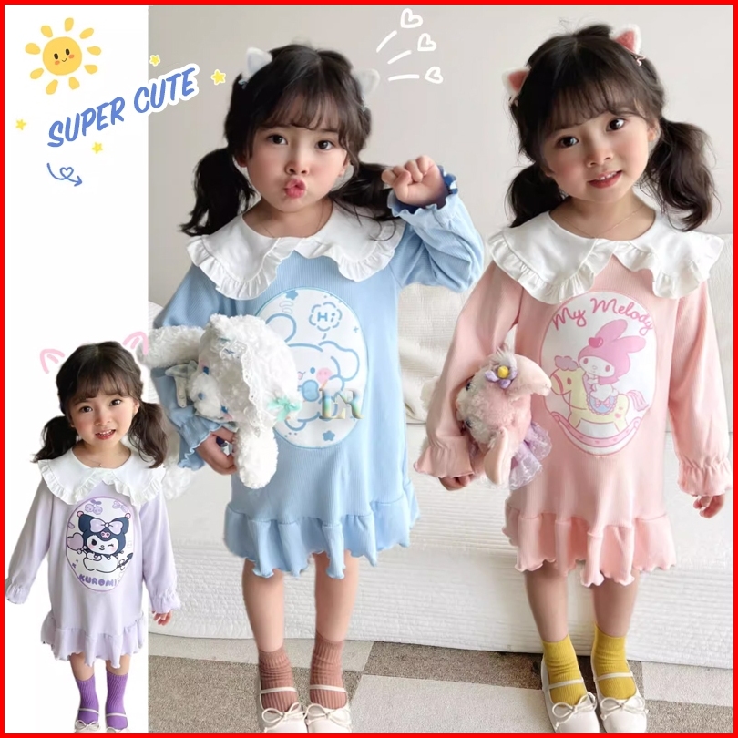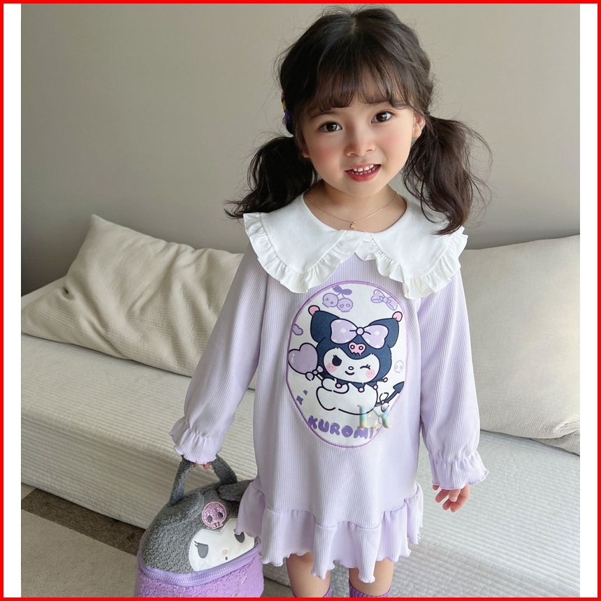 Lnr Shop Dress Gaun Sanrio Motif Kuromi Frozen Elsa My Melody Stella Lou Lengan Panjang Berkerah Ruffle Rok Midi Anak Pe