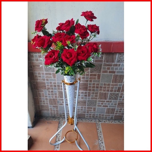 Bunga Mawar Bludru Kuntum 18 Pot Corong Standing Besi Bunga Pojok Ruangan