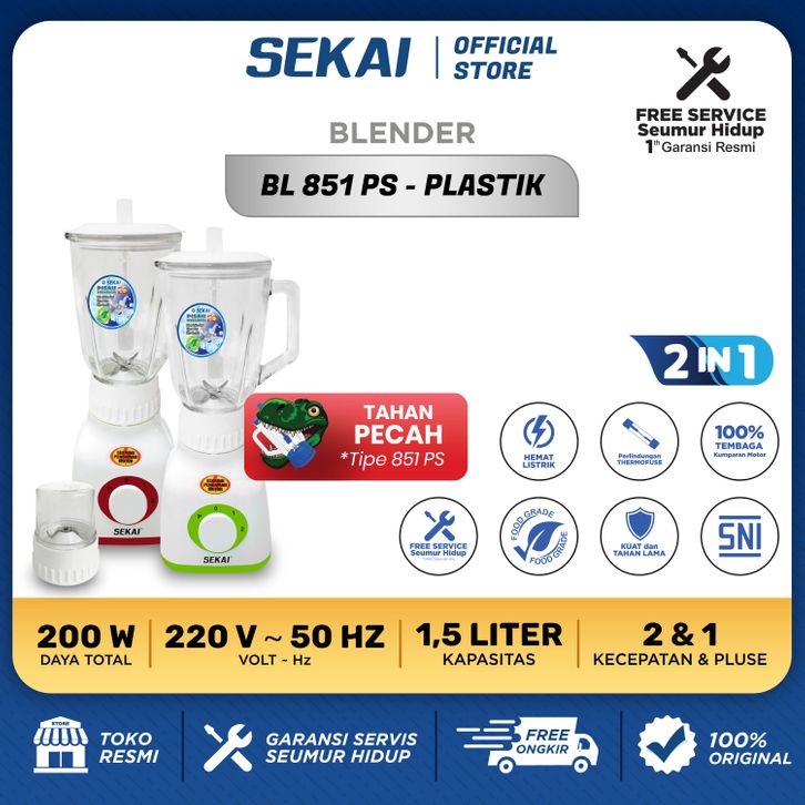 SEKAI Blender Plastik 1,5 Liter 2 in 1 Juicer & Dry Mill Blender Jus dan Bumbu Serbaguna - BL 851 PS