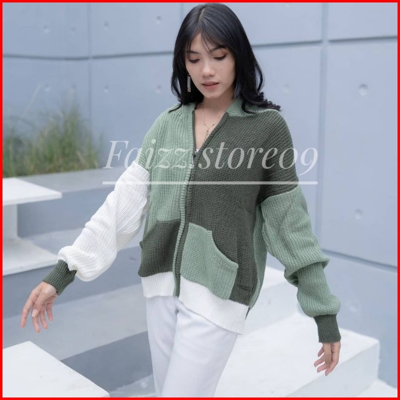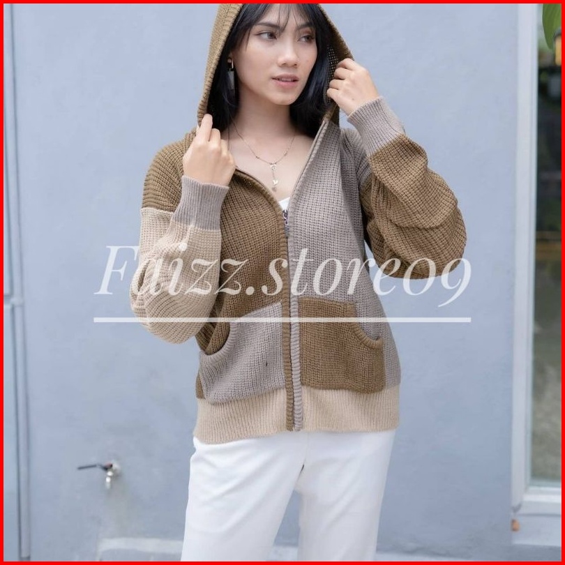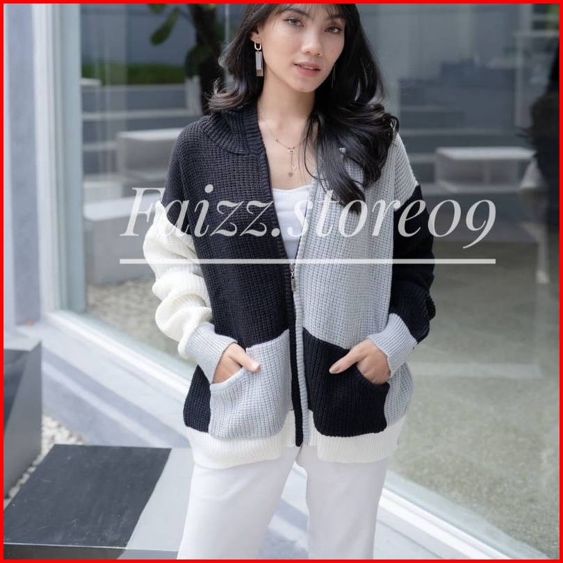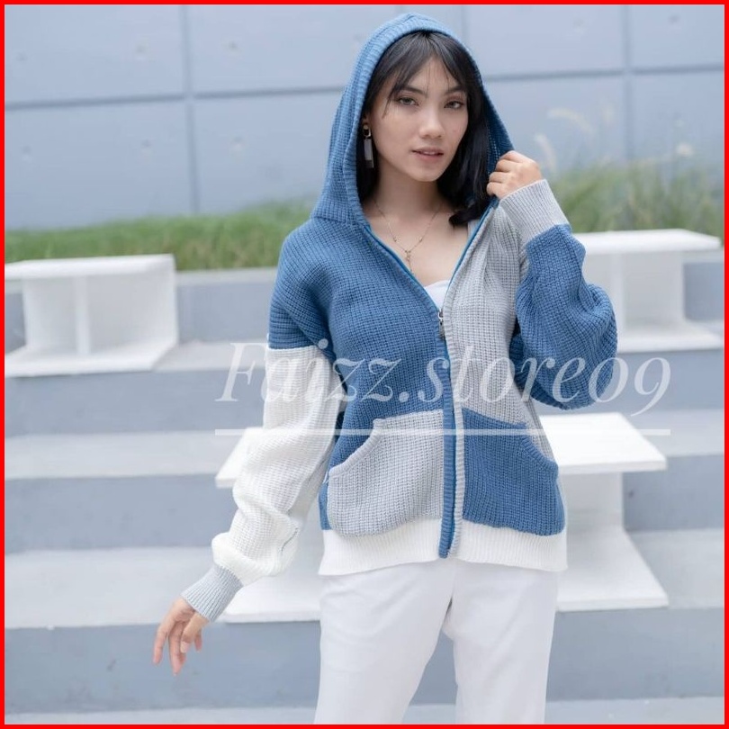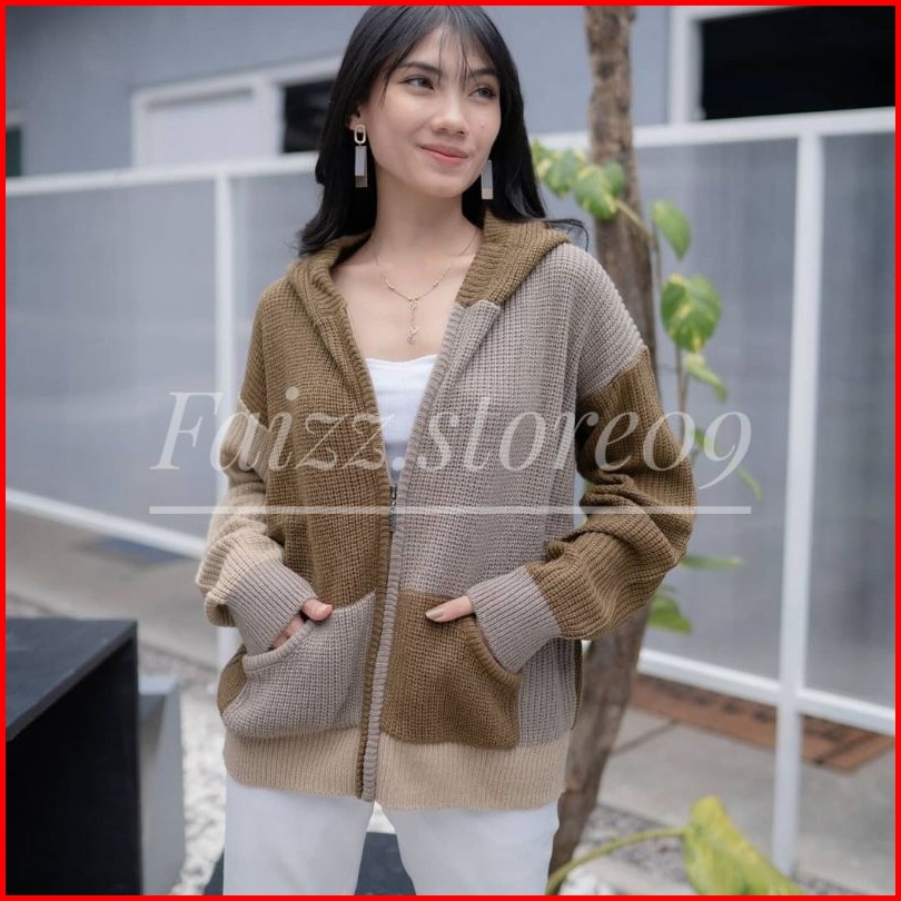 Hoodie Two-tone Jaket Rajut Oversize Zipper Sweater Rajut Wanita Hoodie Store09