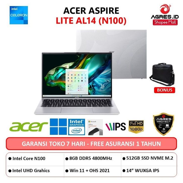 Laptop Notebook ACER ASPIRE LITE AL14 INTEL N100 8GB 512GB W11+OHS 14.0WUXGA SLV -31P.C0G4