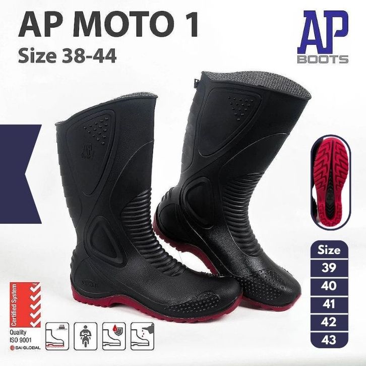 Sepatu Boot Tinggi AP MOTO 1 AP Boots Hitam Merah Karet Lokal Anti Air & Slip Sepeda Motor