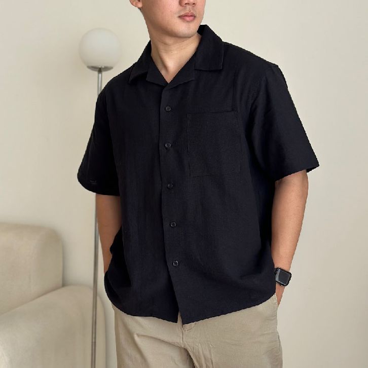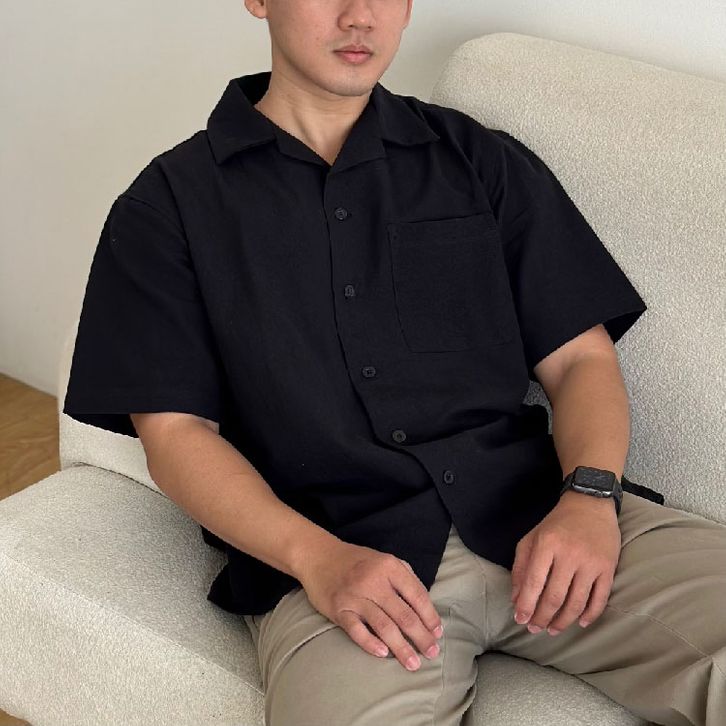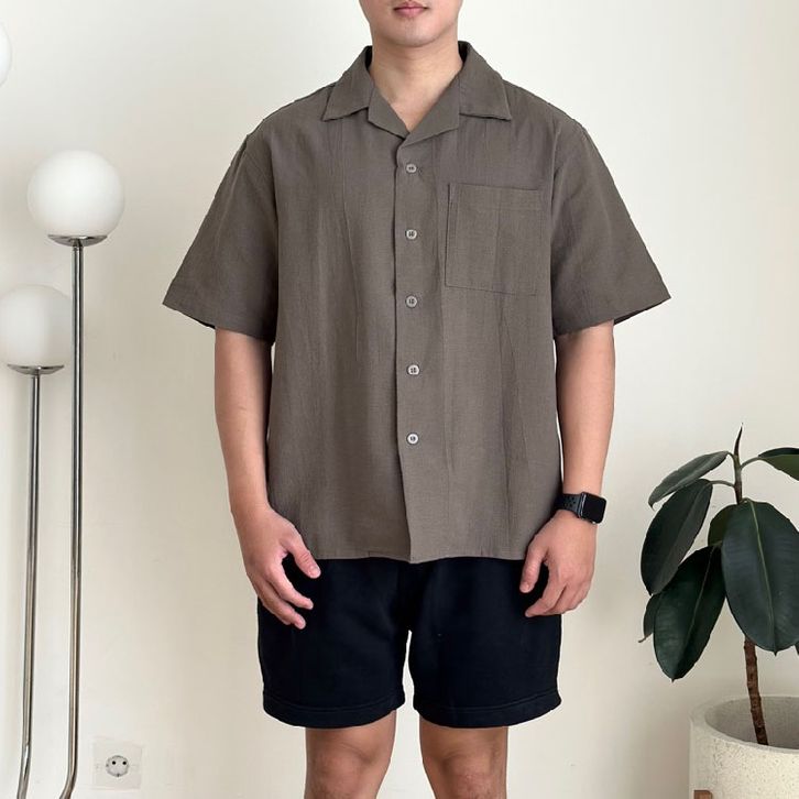COZYCLUB Cuban Bowling Boxy Oversized Linen Shirt Kemeja Linen Bowling Polos Pria Kerah Terbuka Lengan Pendek Original