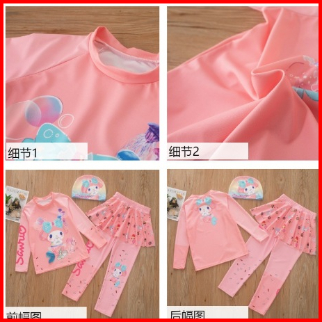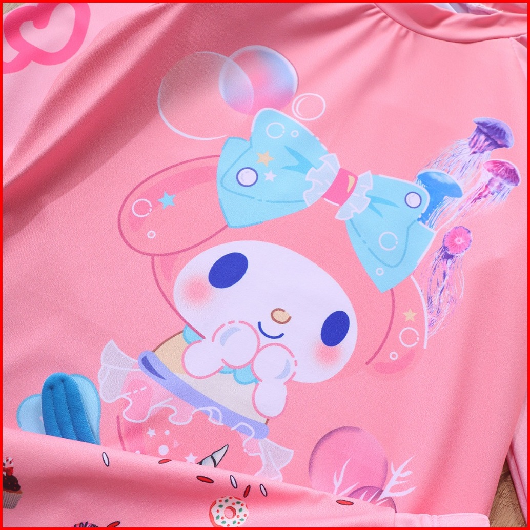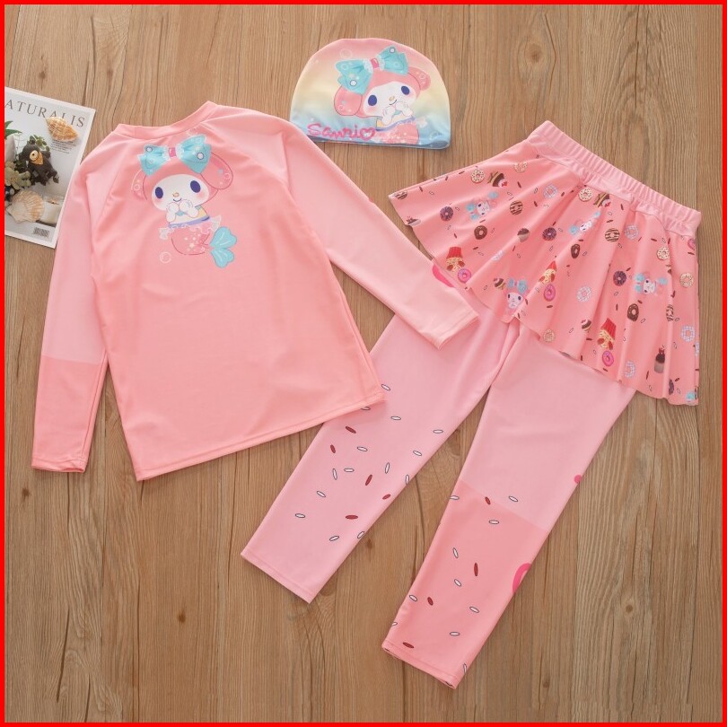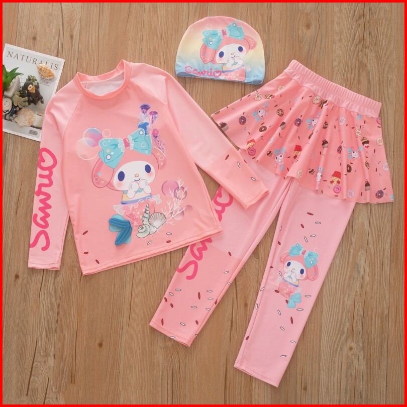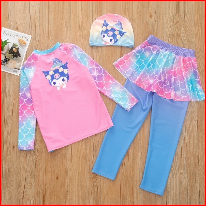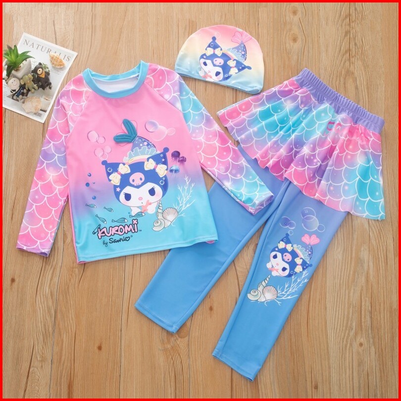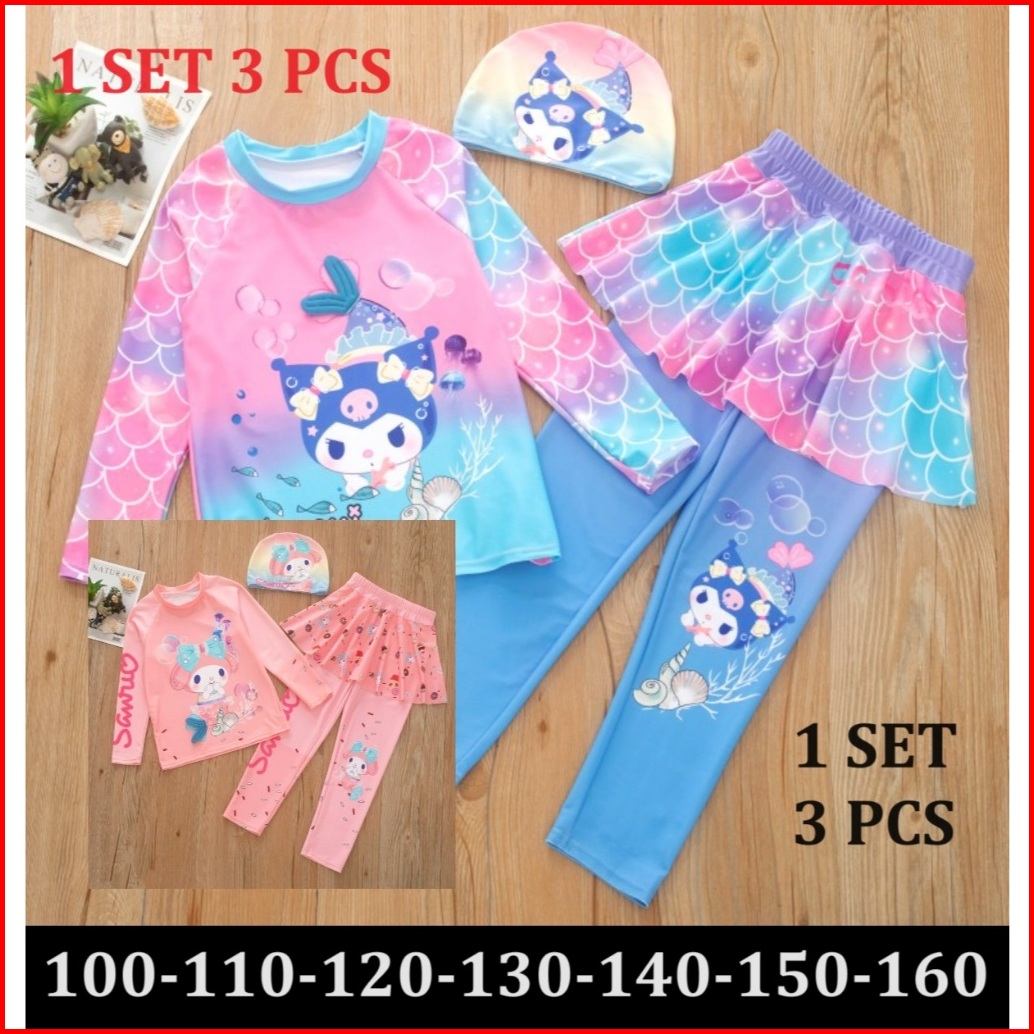 3in1 1 Set 3 Pcs Baju Renang Premium Lengan Celana Panjang Topi Sanrio Kuromi My Melody Mermaid Ikan Ungu Pink Nyaman Si