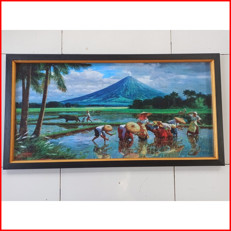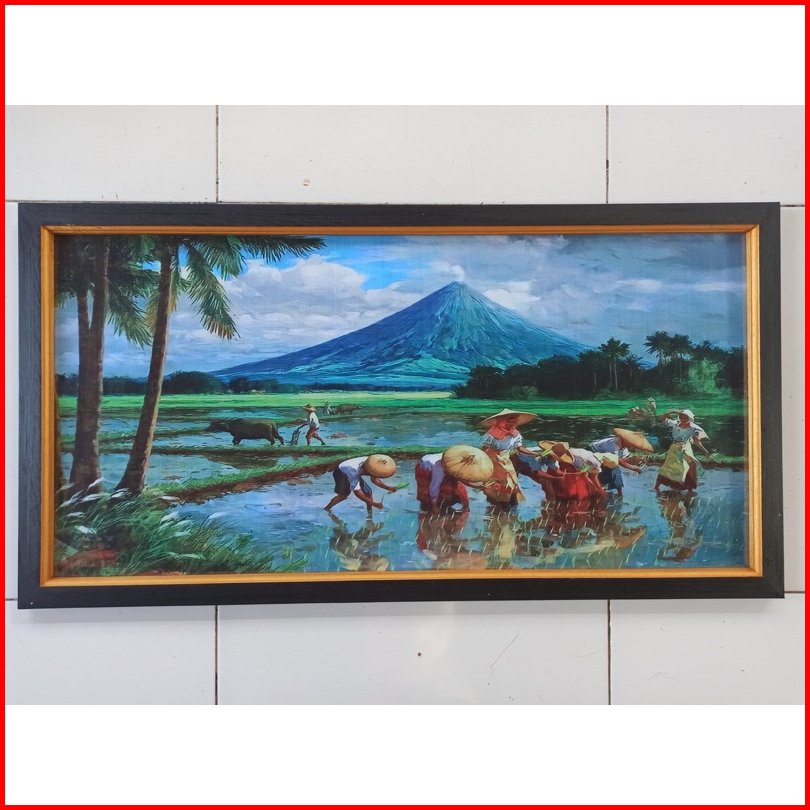 Hiasan Dinding Uk 50cm X 100cm Plus Bingkai Lukisan Cetak Pemandangan Sawah Orang-orang Di Sawah Menanam Padi Pemandanga