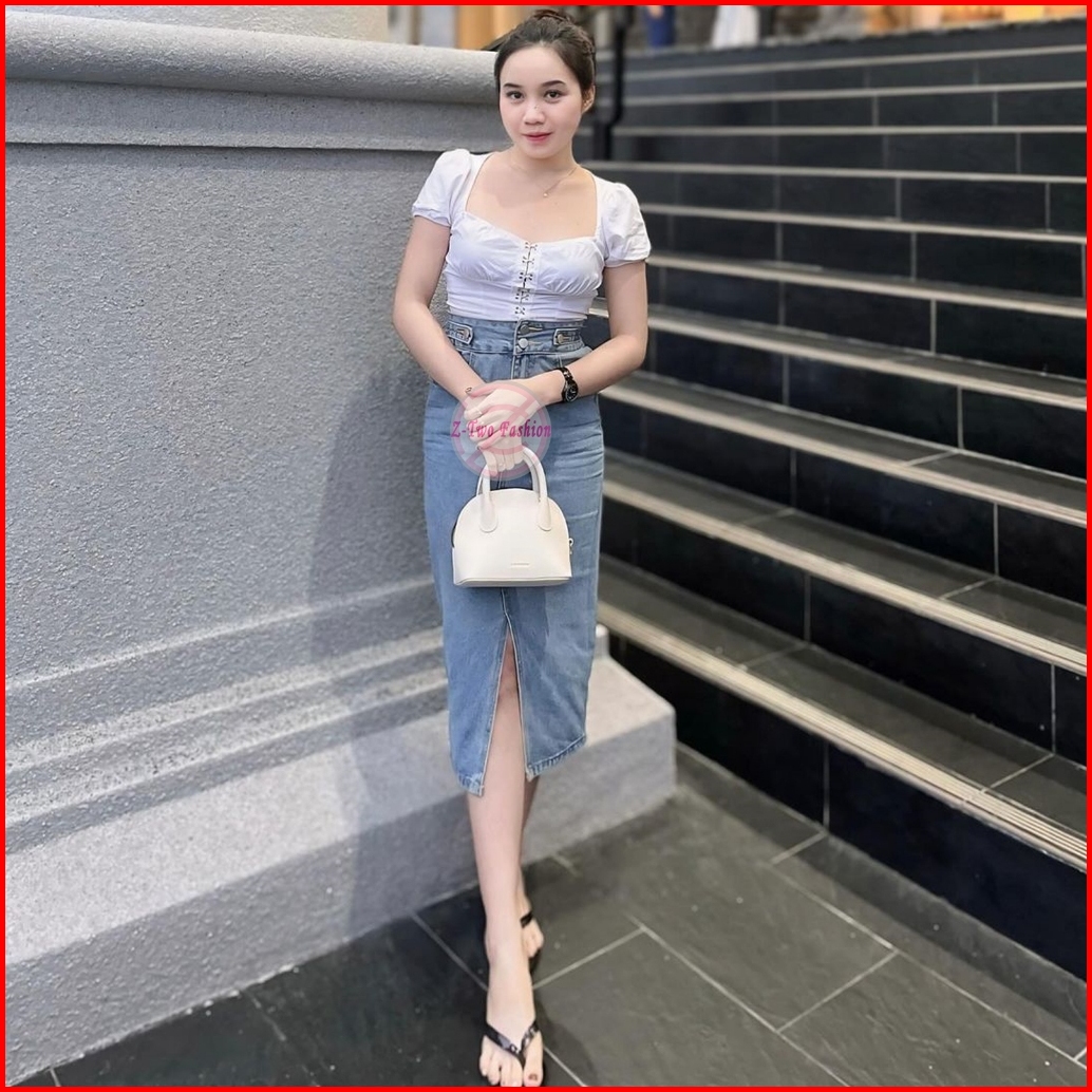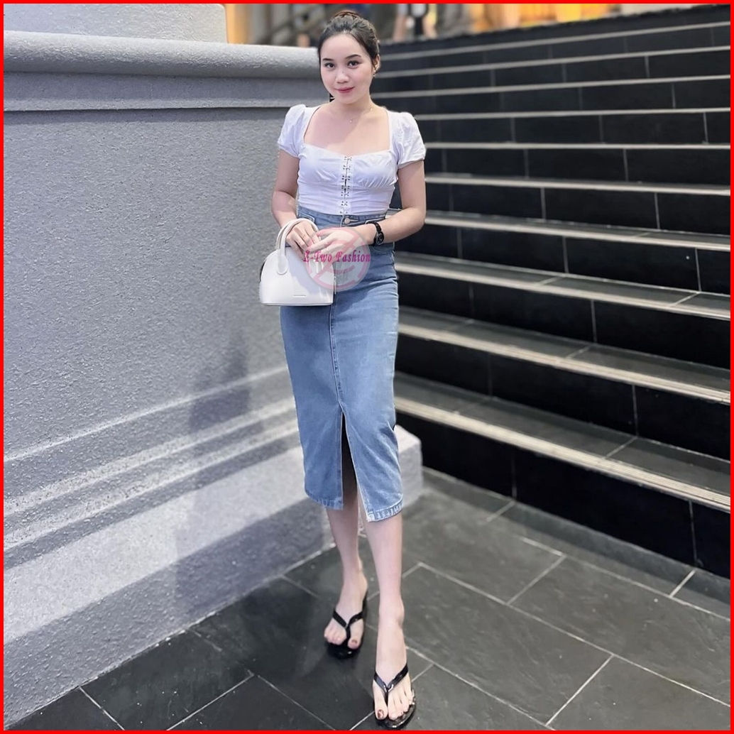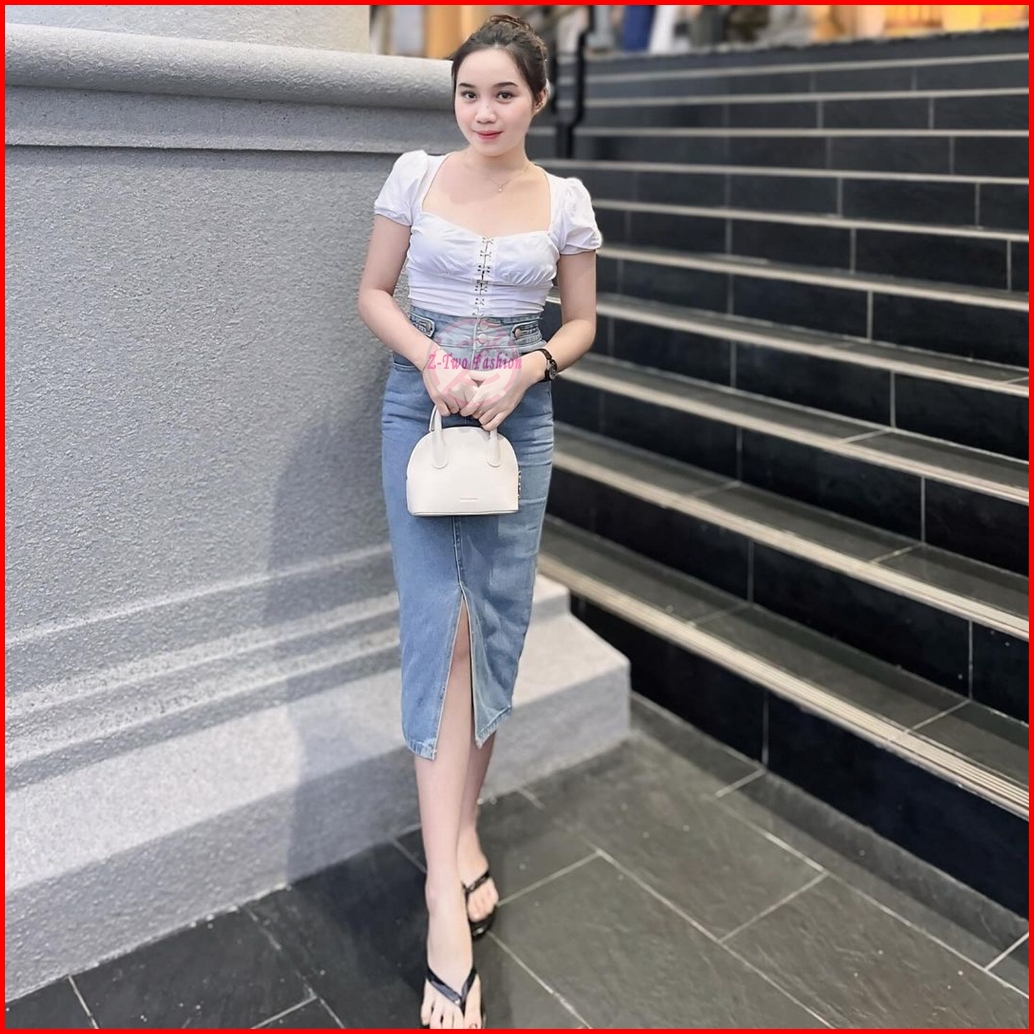 Z-two Fashion Highwaist Rok Jeans Melar Panjang 7 9 Belah Depan Doubel Button Seventyn Skirt
