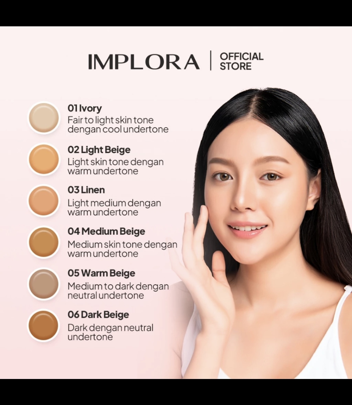 01 ivory, 03 linen, 04 medium beige, o5 warm beige, 06 dark beige, 02 light beige
