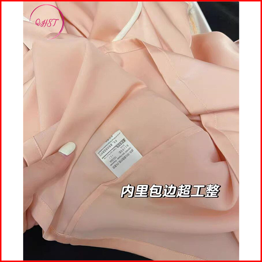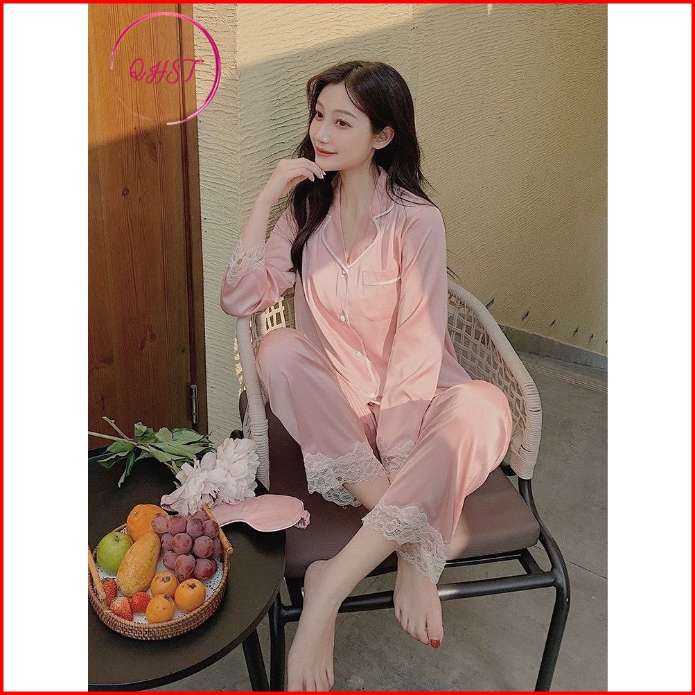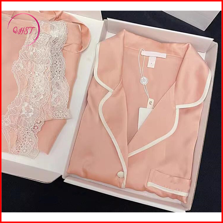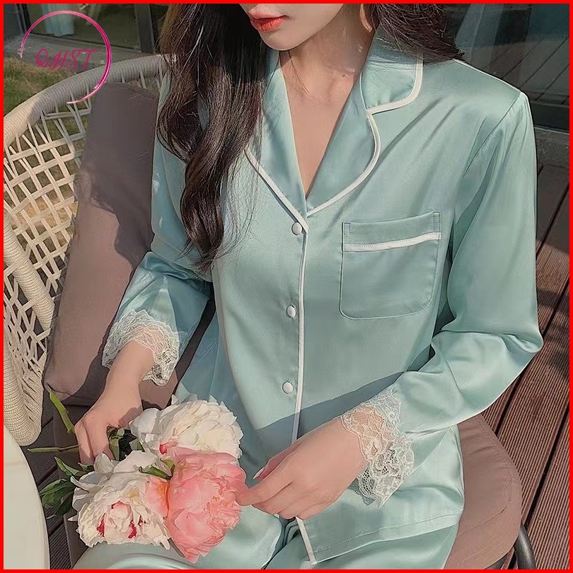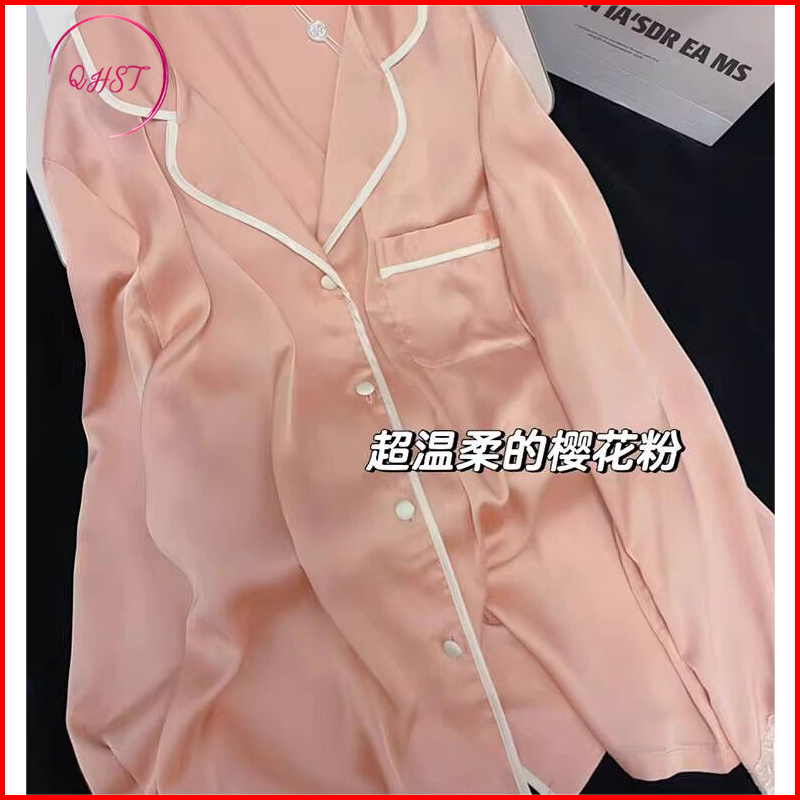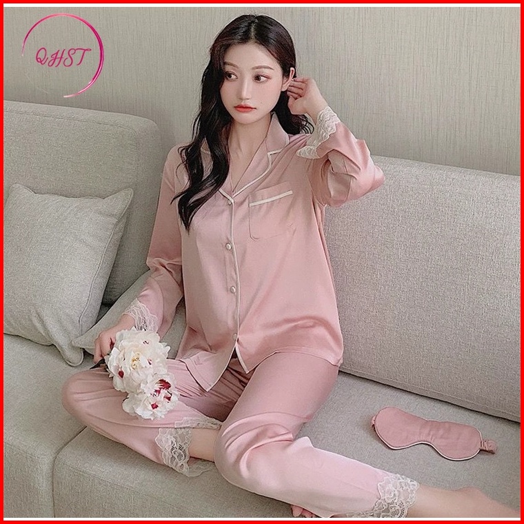 Qhst Piyama Set Wanita Satin Renda Merah Muda Pajamas Wanita Baju Tidur Wanita Dewasa Lengan Panjang Cewek Import
