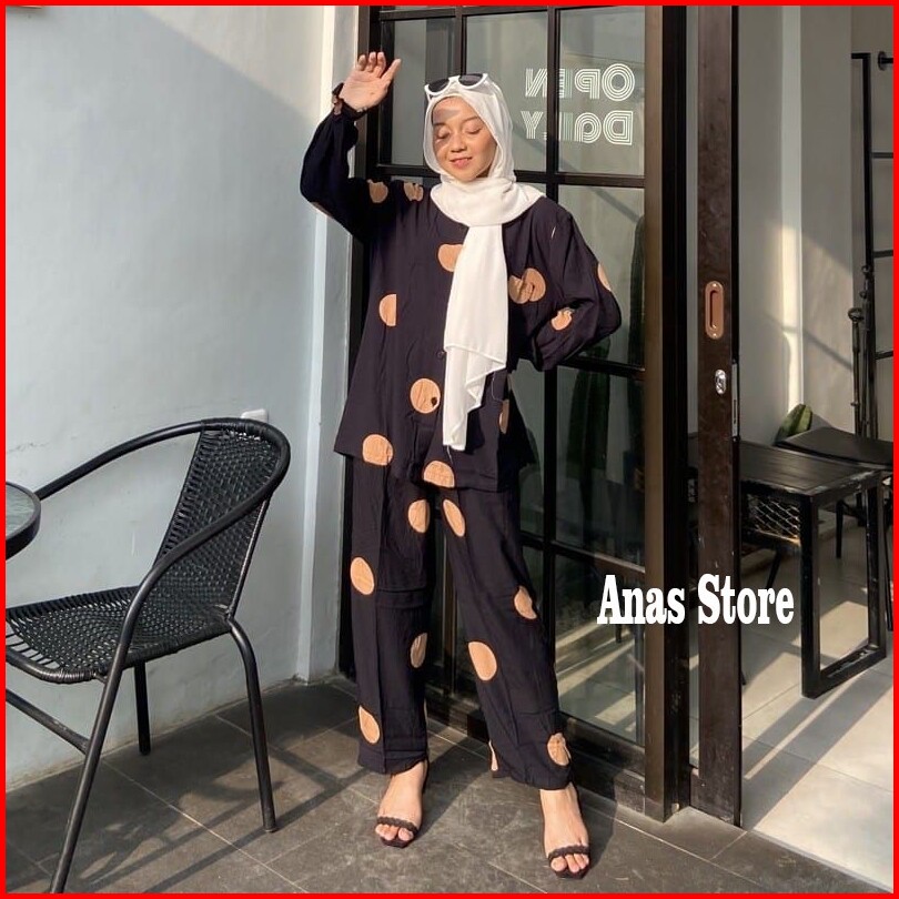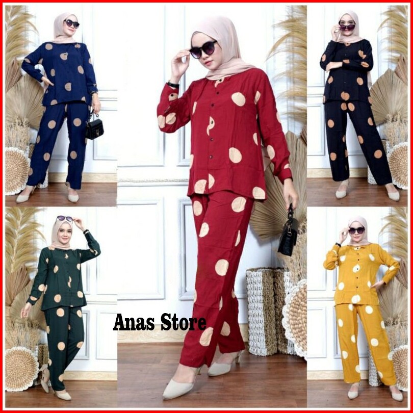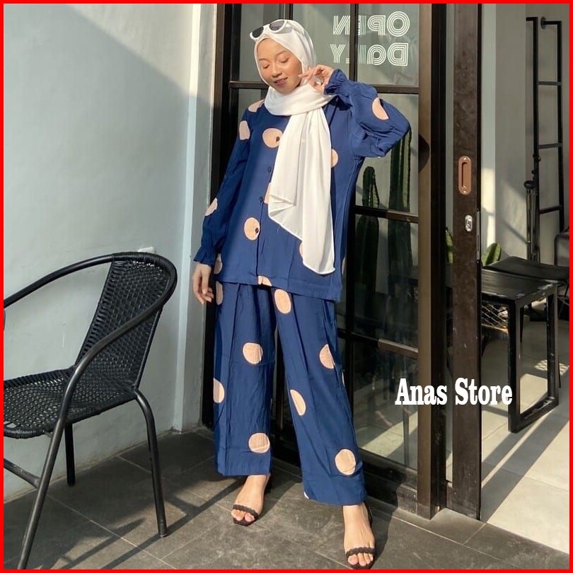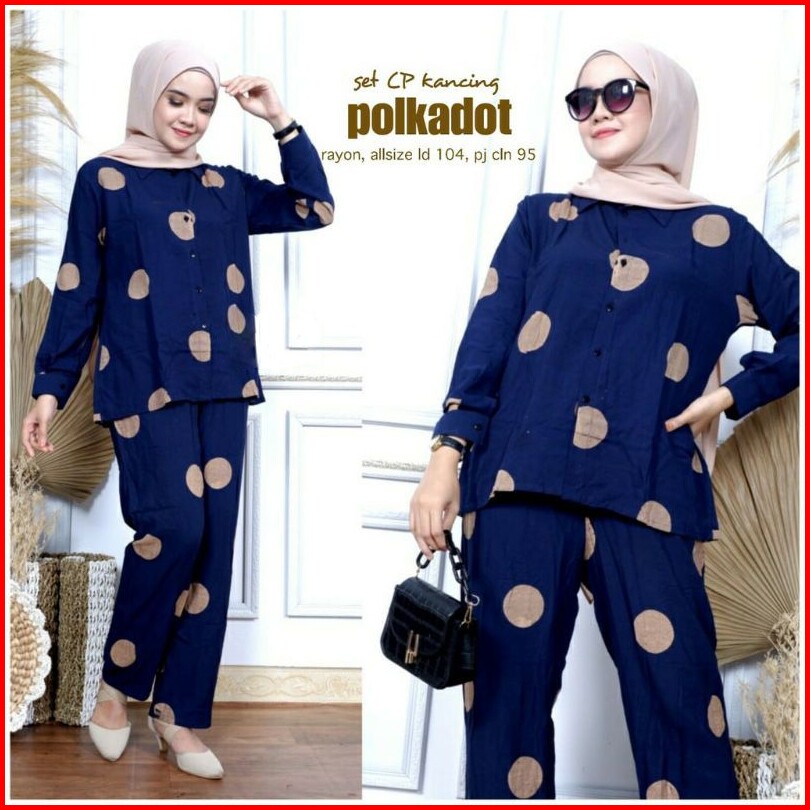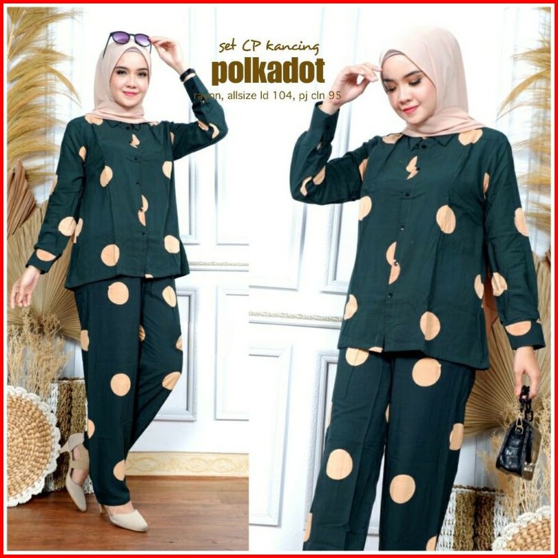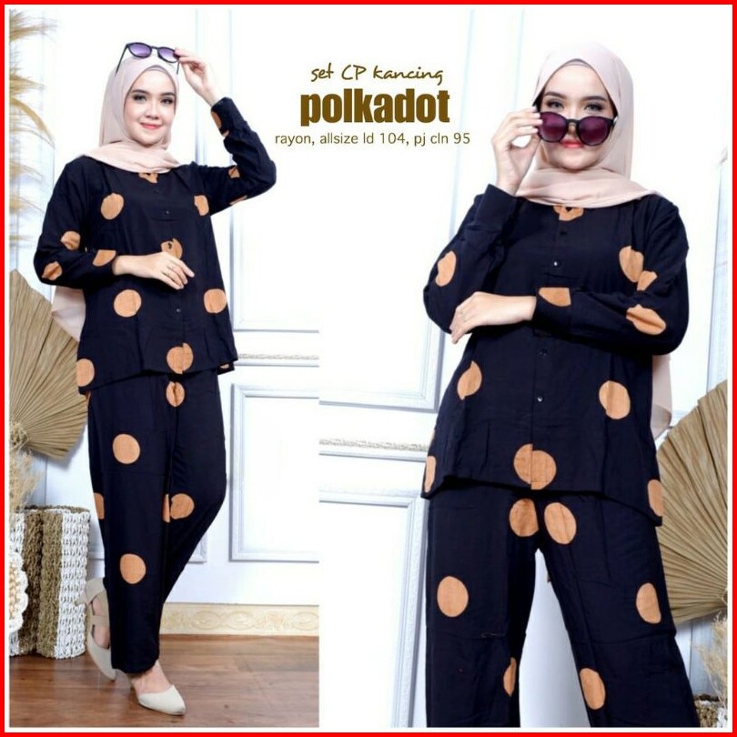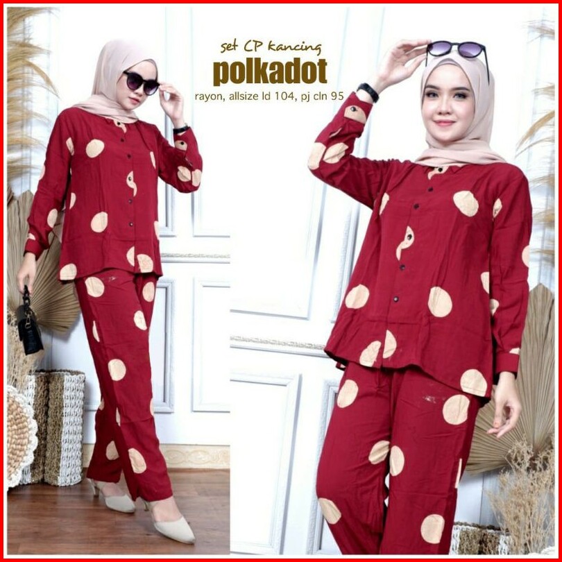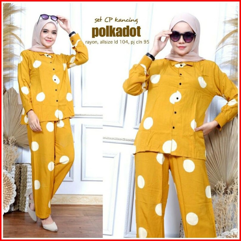 One Set Pajamas Wanita Stelan Tie Dye Rayon Kancing Lengan Panjang Motif Polkadot