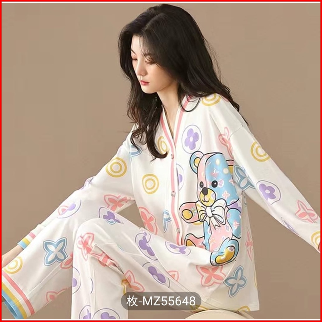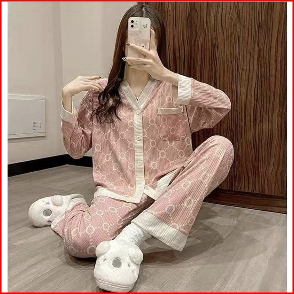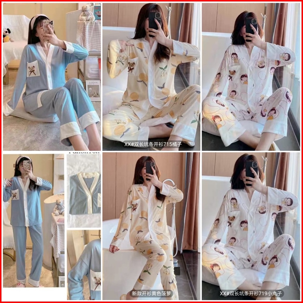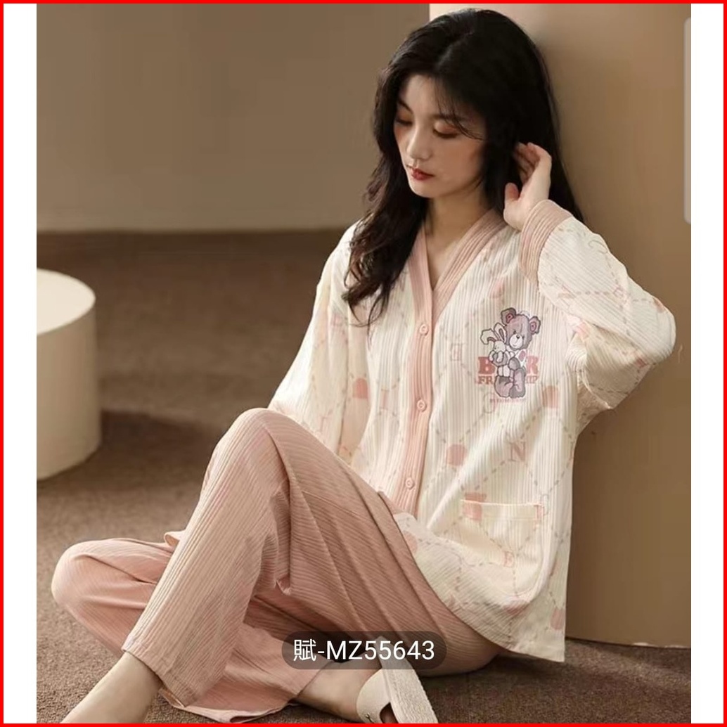 Setelan Setcel One Set Piyama Baju Tidur Wanita Dewasa Korea Pp Katun Import Vneck Lengan Panjang Premium Motif Busui Re
